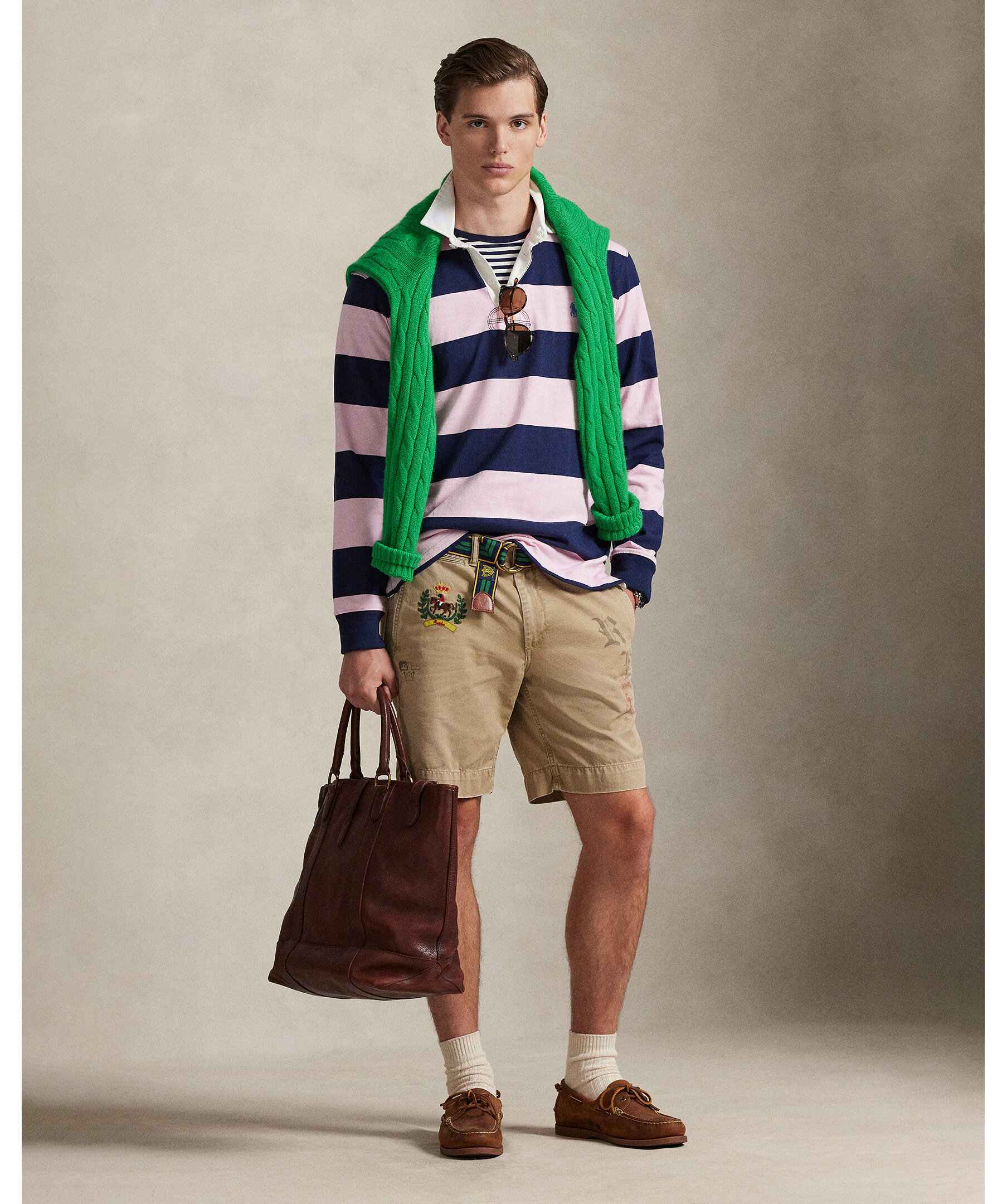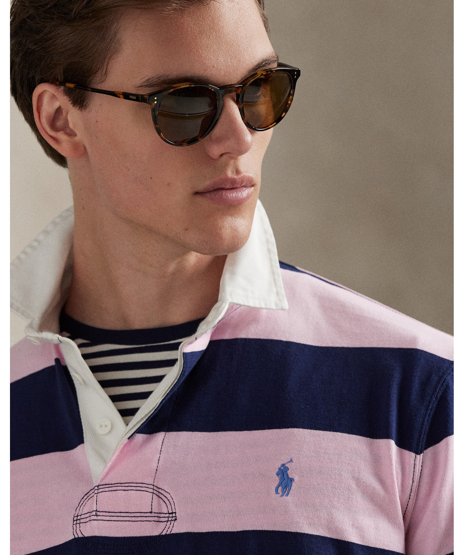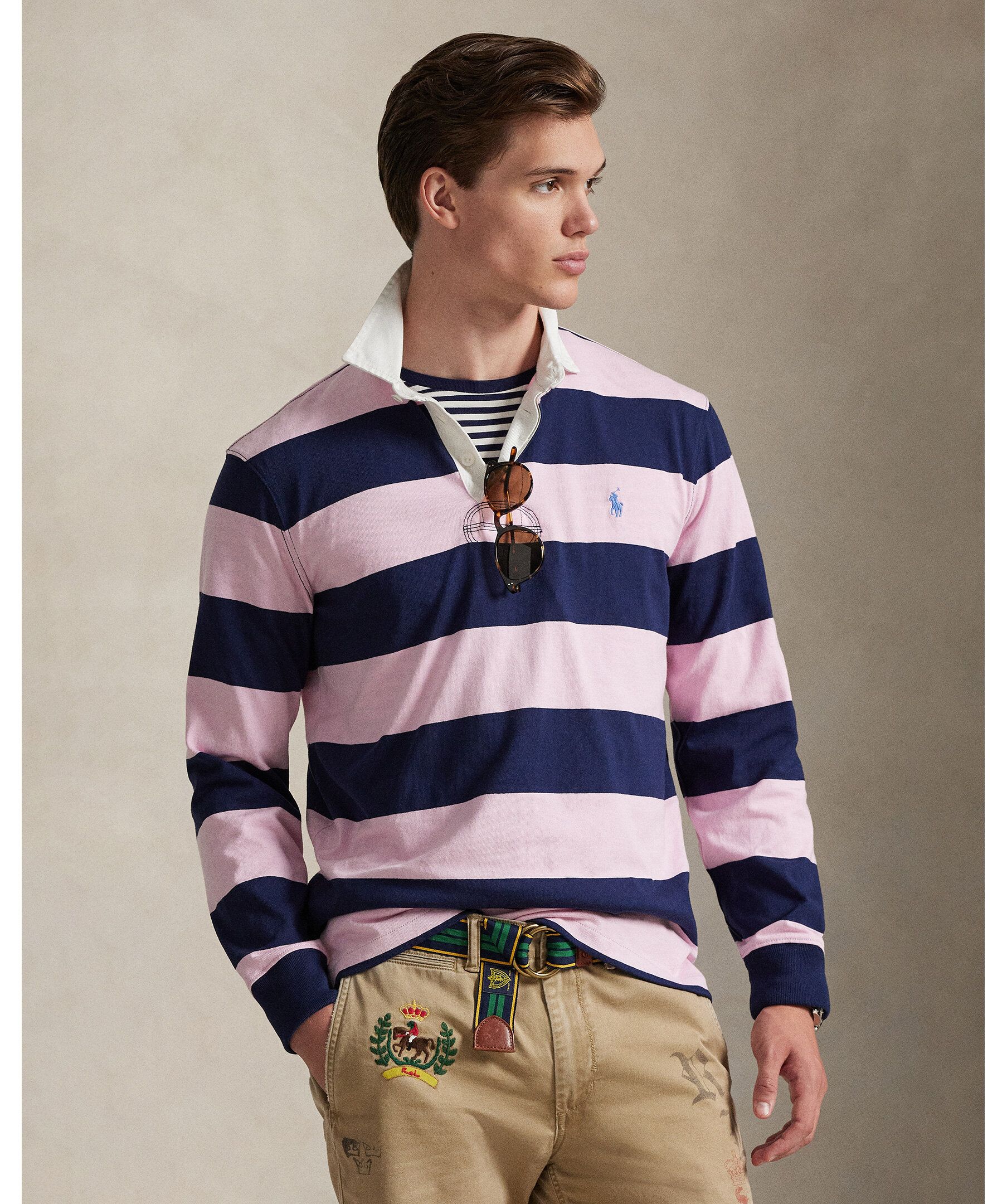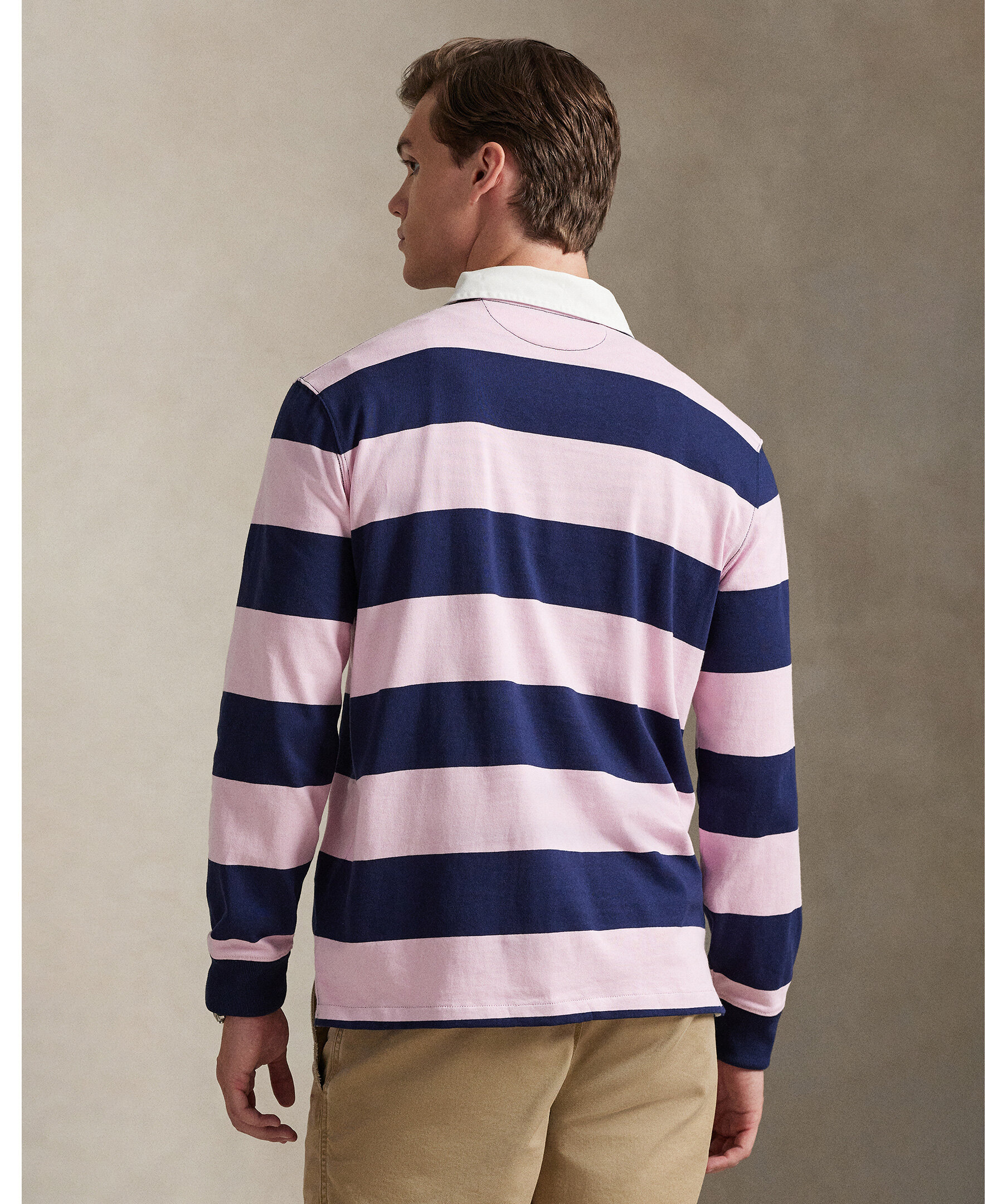Rugby‑inspirerad långärmad tröja från Polo Ralph Lauren med klassisk vit krage och randigt mönster i rosa och blått. Tröjan har en regular fit.