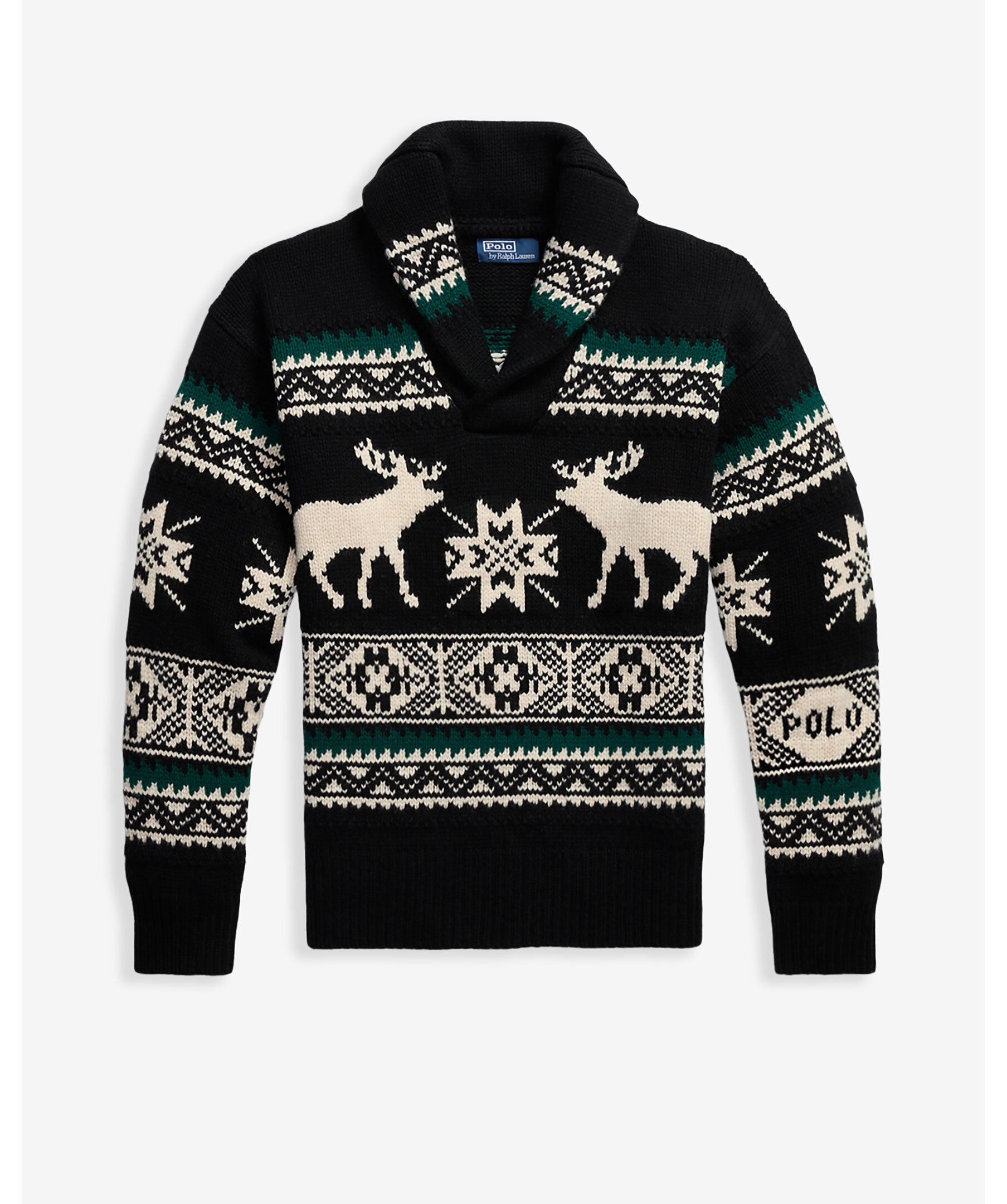 Multifärgad, stickad och mönstrad pullover från Polo Ralph Lauren. Tröjan har en sjalkrage och ribbstickade muddar. Tillverkad i en ullblandning.