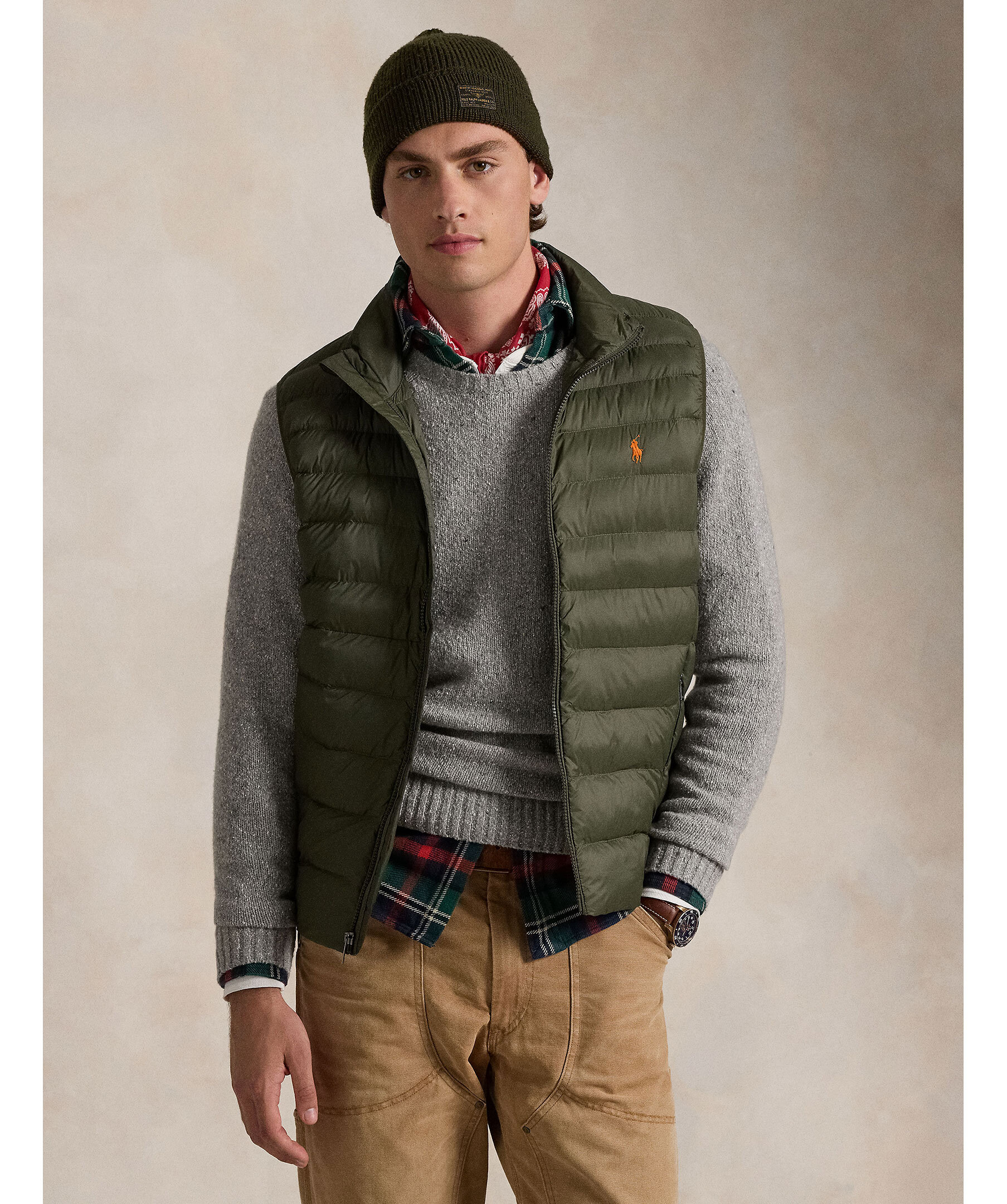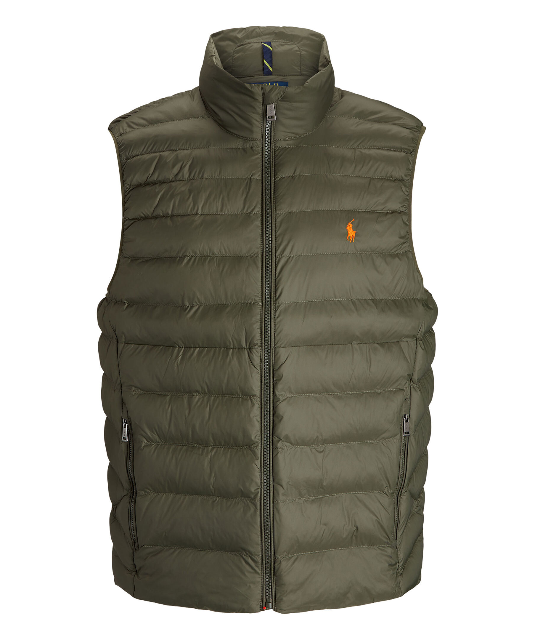 Mörkgrön vadderad väst från Polo Ralph Lauren. Vattenavvisande yttertyg. Vadderad med polyester och utvecklad som ett alternativ till den klassiska dunvästen. Två framfickor med dragkedja, broderad logotyp på bröstet. Dragsko vid plaggslutet. Packbar design. Modellen är 185cm och har på sig strl M.