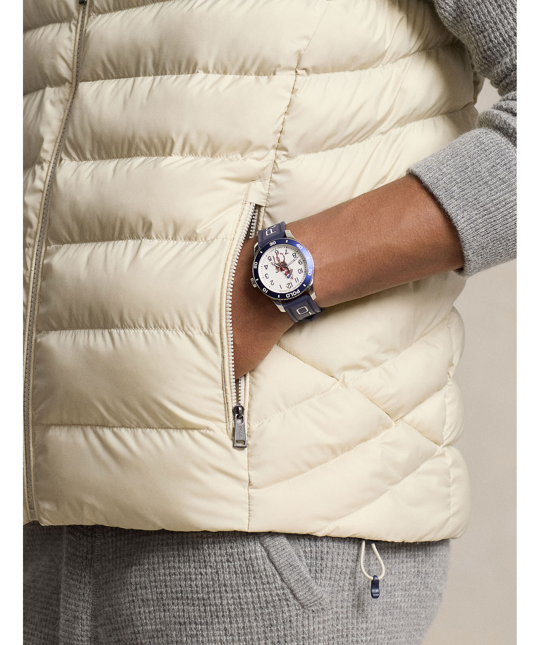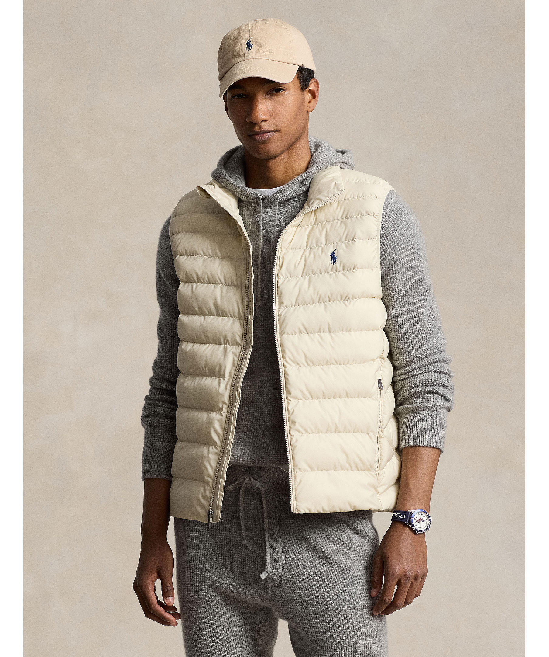 Sandfärgad vadderad väst från Polo Ralph Lauren. Vattenavvisande yttertyg. Vadderad med polyester och utvecklad som ett alternativ till den klassiska dunvästen. Två framfickor med dragkedja, broderad logotyp på bröstet. Dragsko vid plaggslutet. Packbar design. Modellen är 185cm och har på sig strl M.