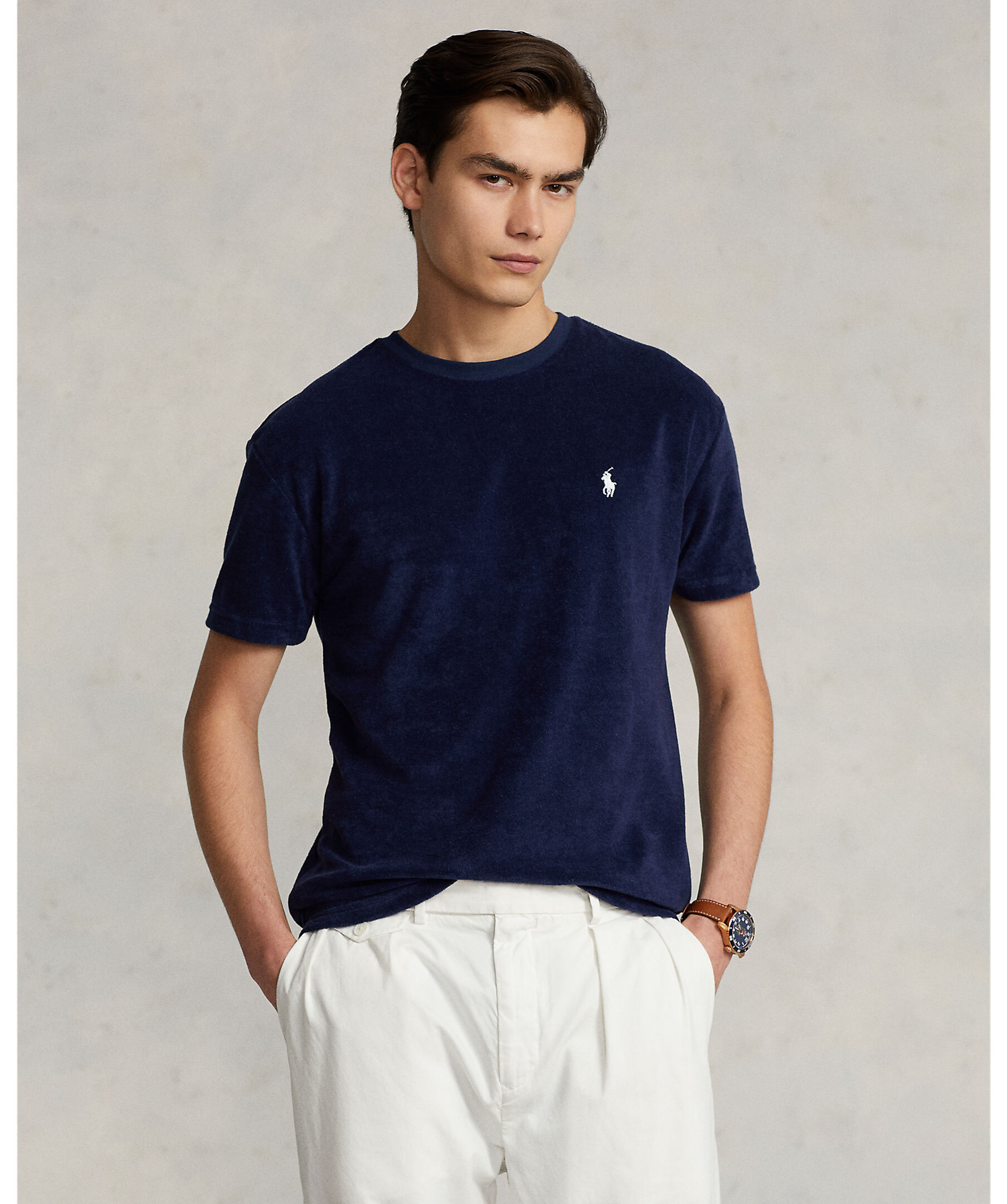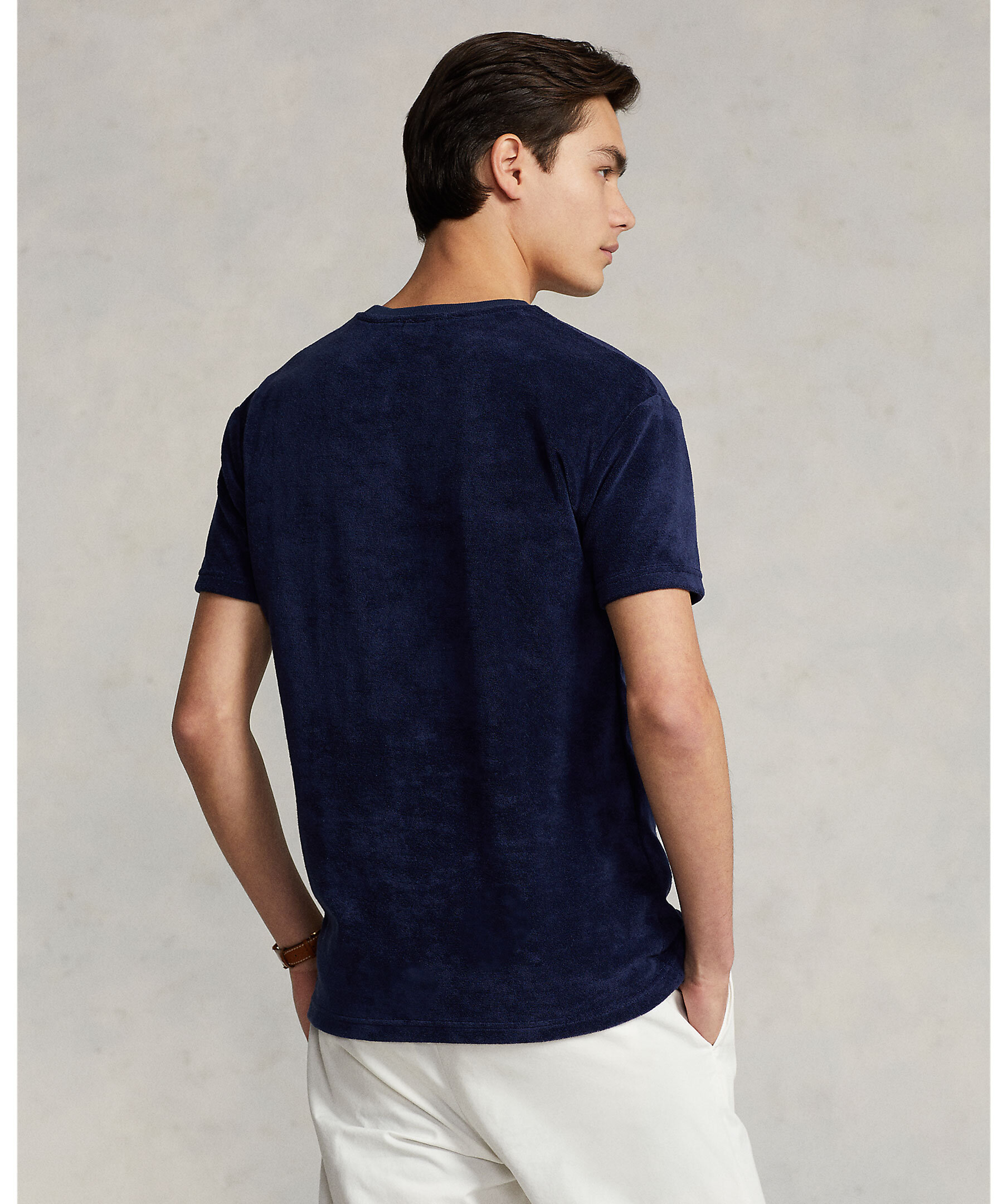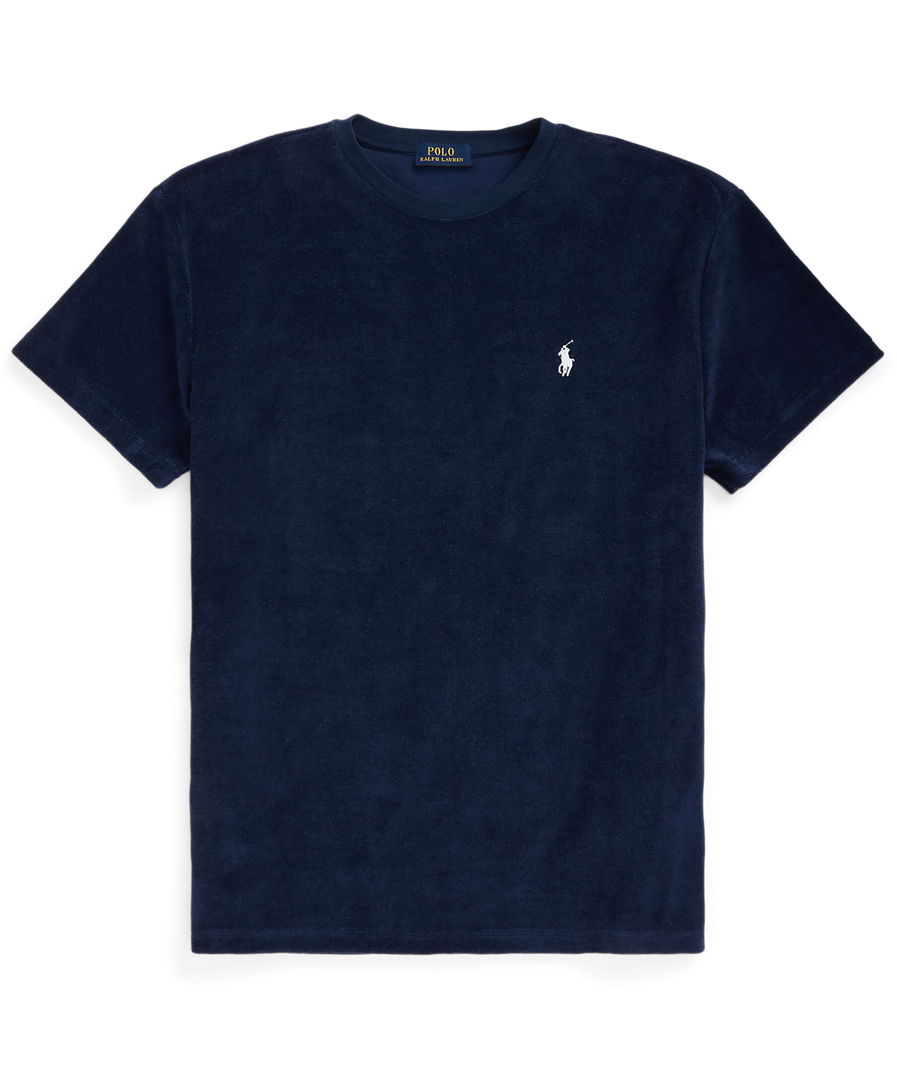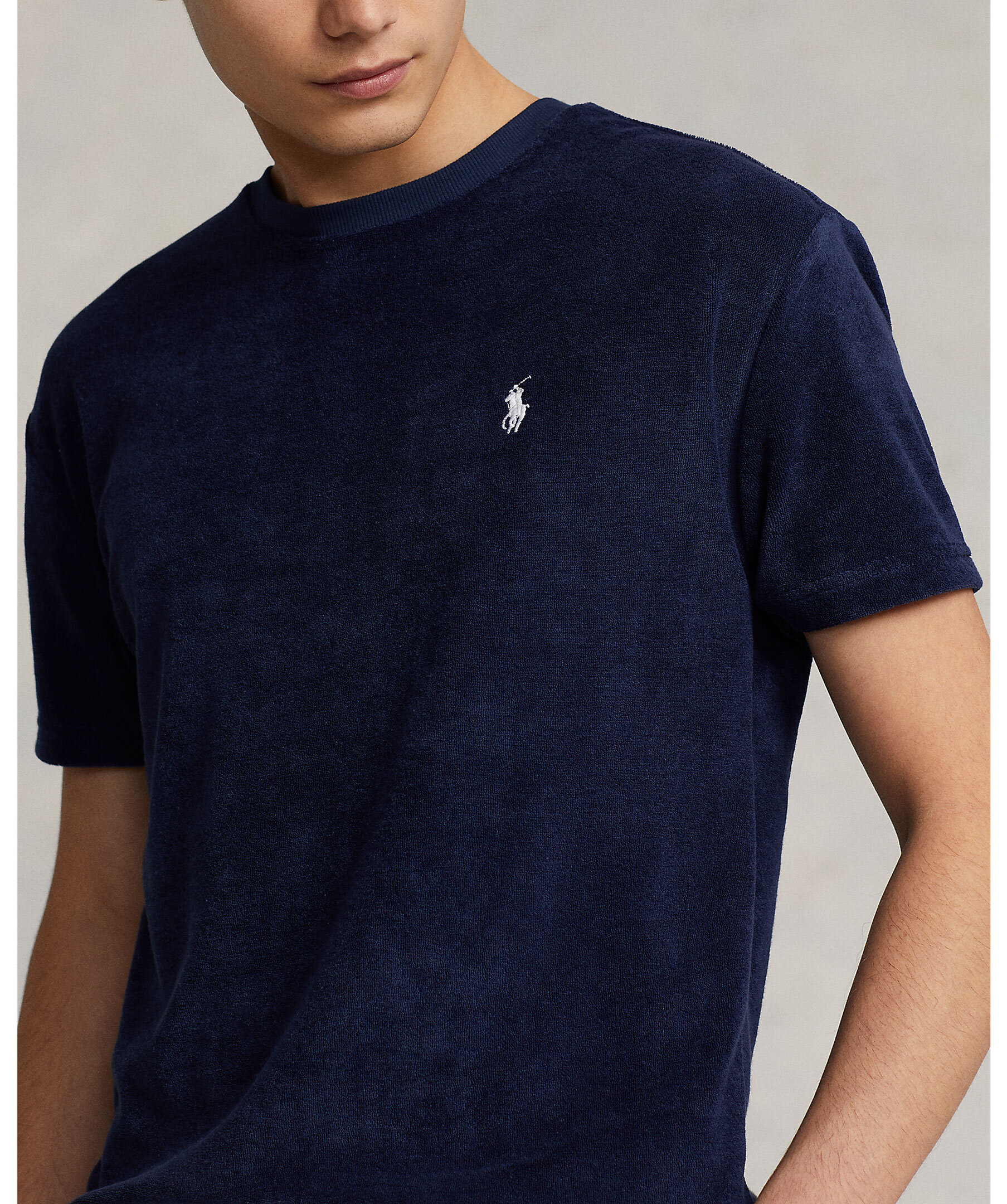 Mörkblå T-shirt i froté material från Polo Ralph Lauren. Rundad halsringning med ribbstickad mudd. Broderad logotyp på vänster bröst. Tillverkad i bomullsblandning.