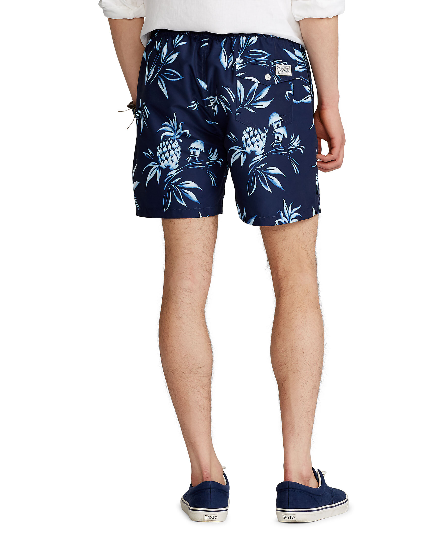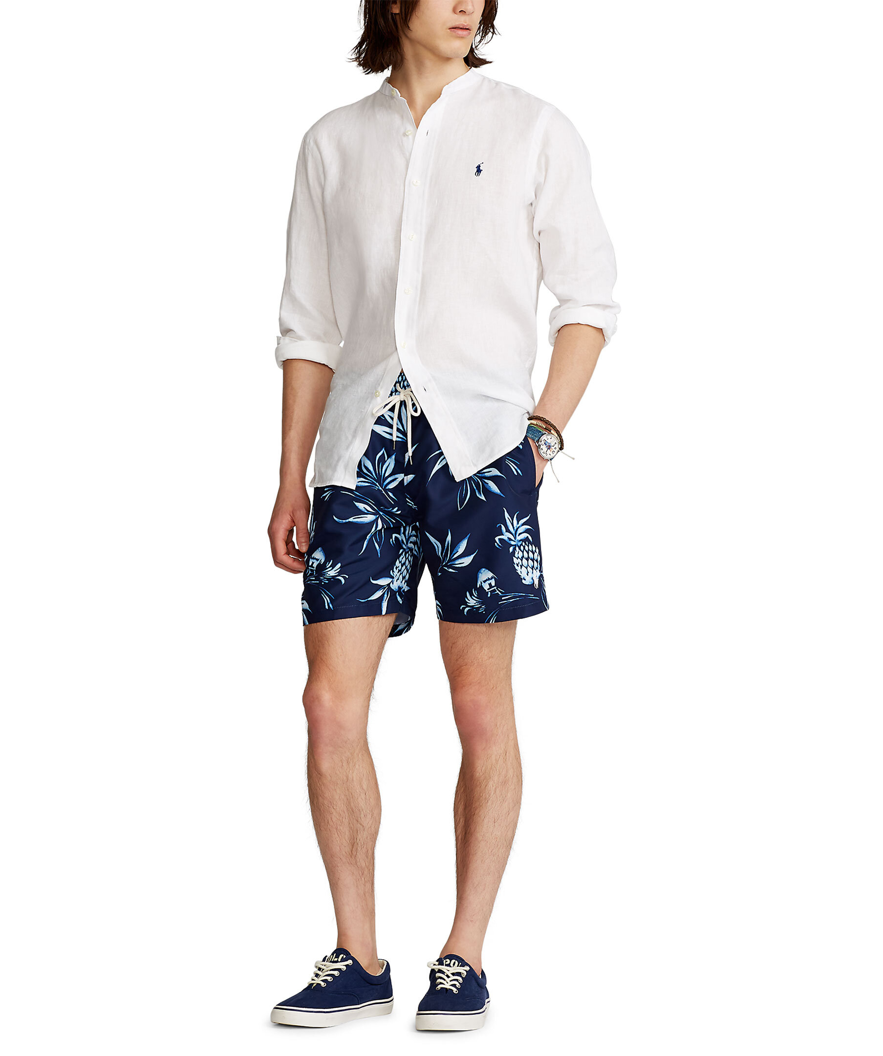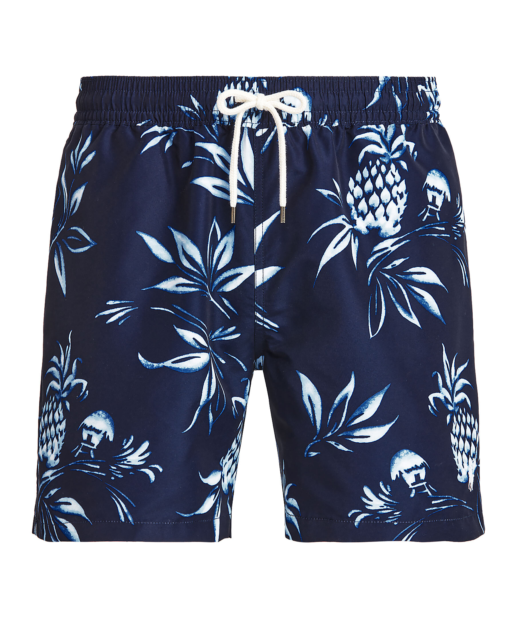 Mörkblå badbyxor med vitt mönster från Polo Ralph Lauren. Tillverkade i nylon och foder i polyester. Knyt i midjan, broderad logotyp på vänster byxben. Två fickor.
