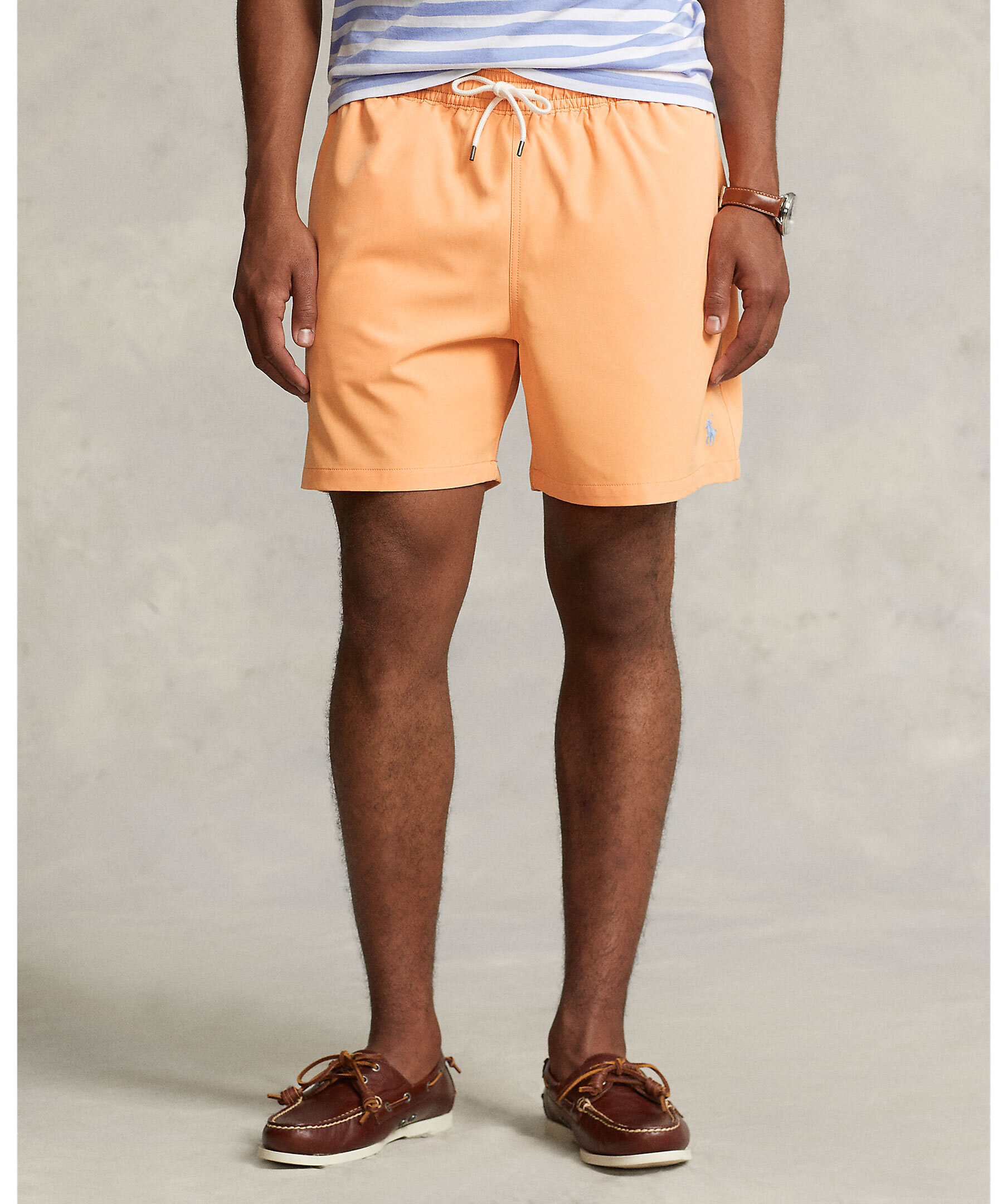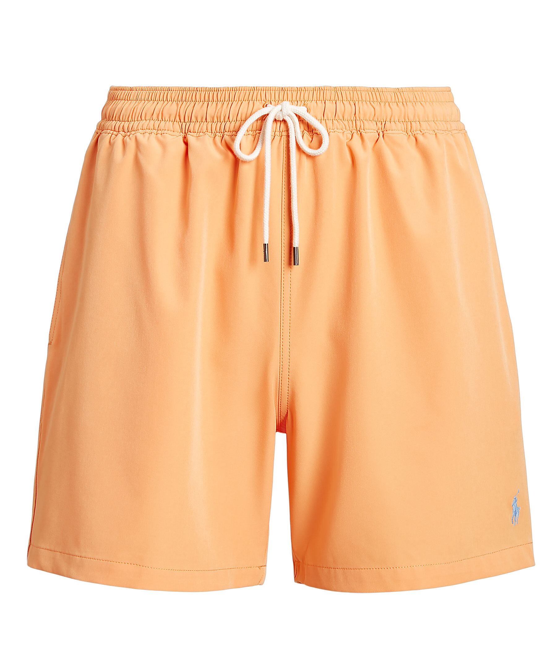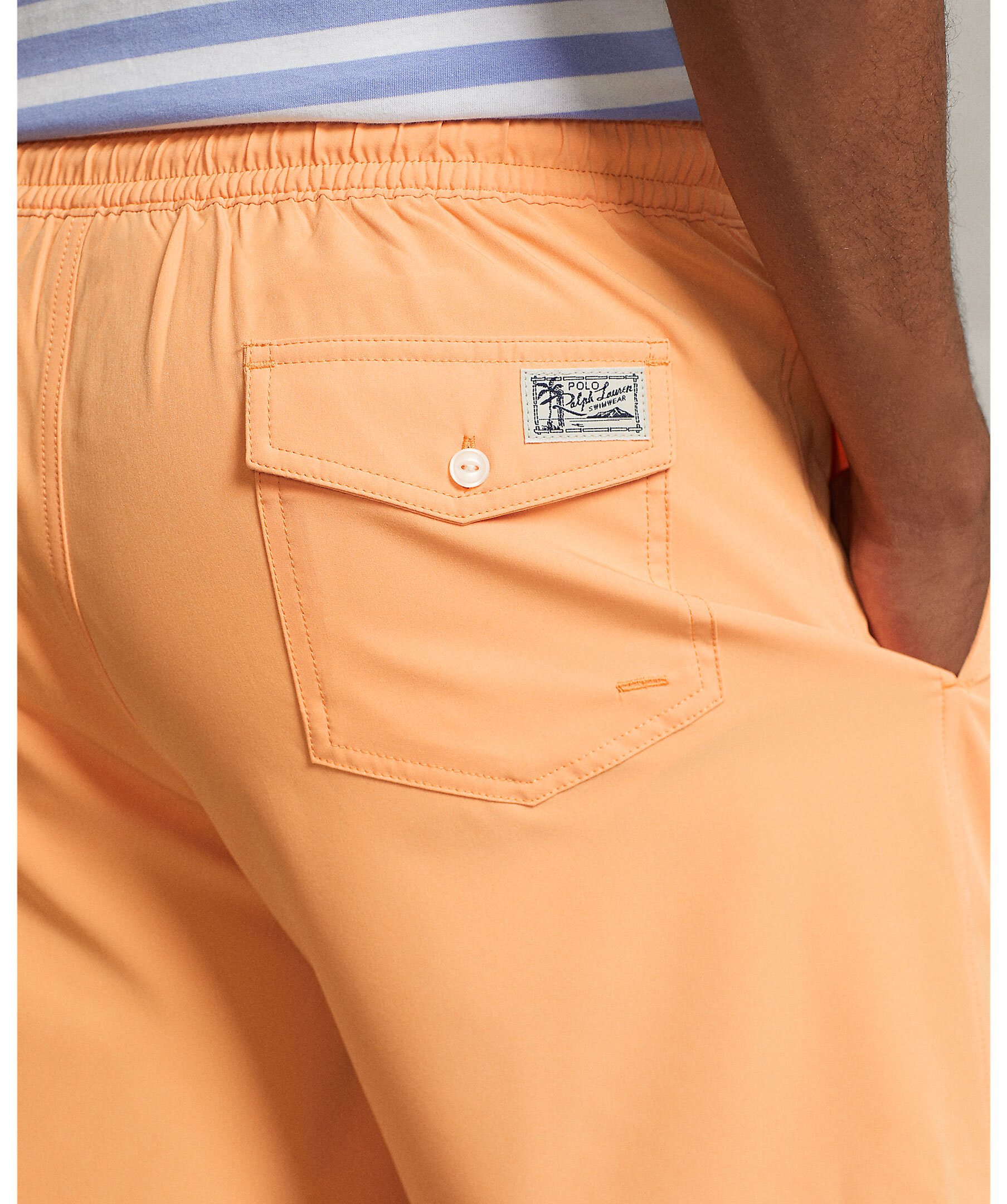 Ljust orangea badbyxor från Polo Ralph Lauren. Tillverkade i strechig, återvunnen polyester och har ett foder i meshtyg. Broderad logotyp längst ner på vänster ben, mudd och vit snörning i midjan. Två öppna framfickor och en bakficka med ficklapp och knapp. Liten, vit broderad patch på bakfickan.