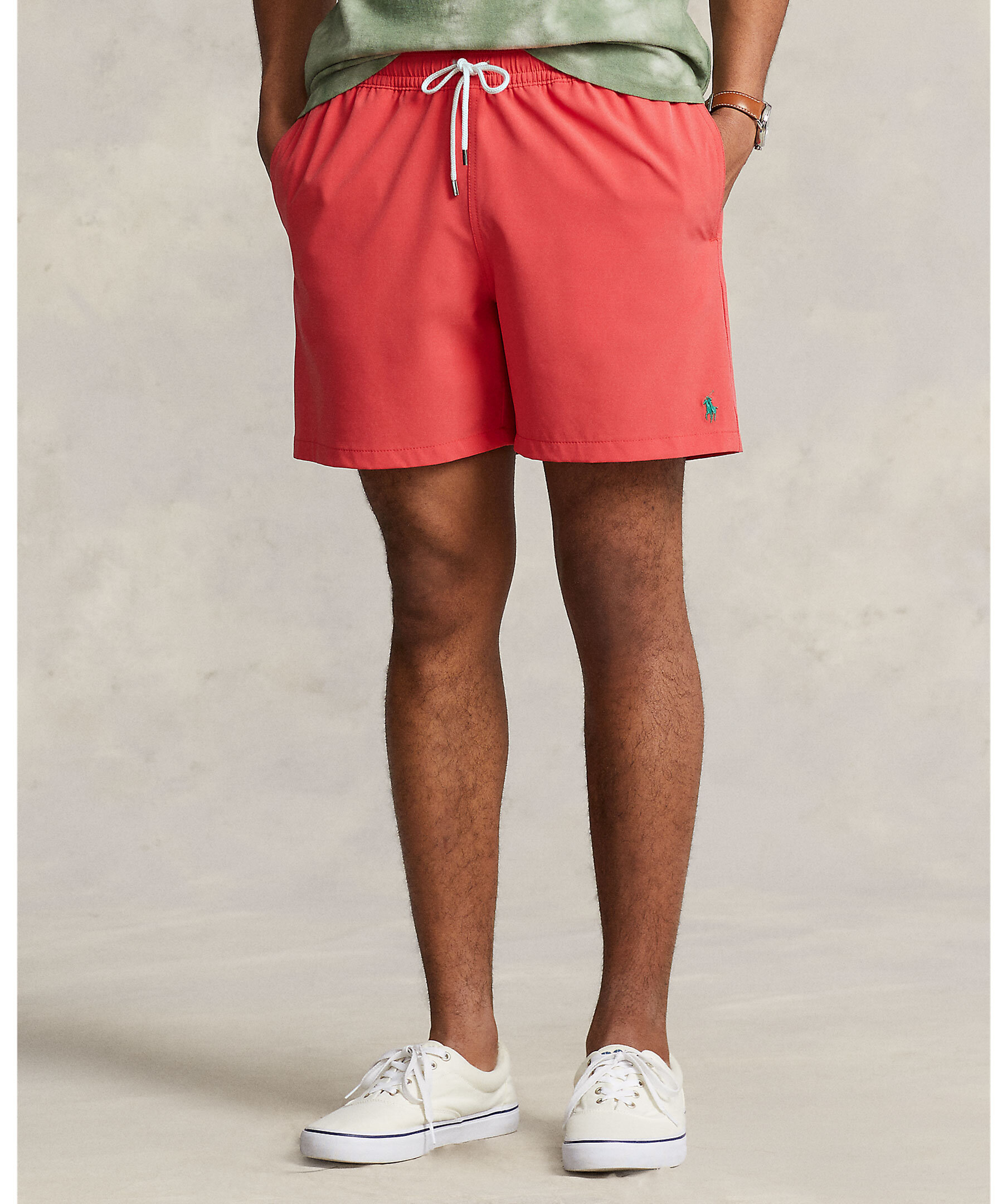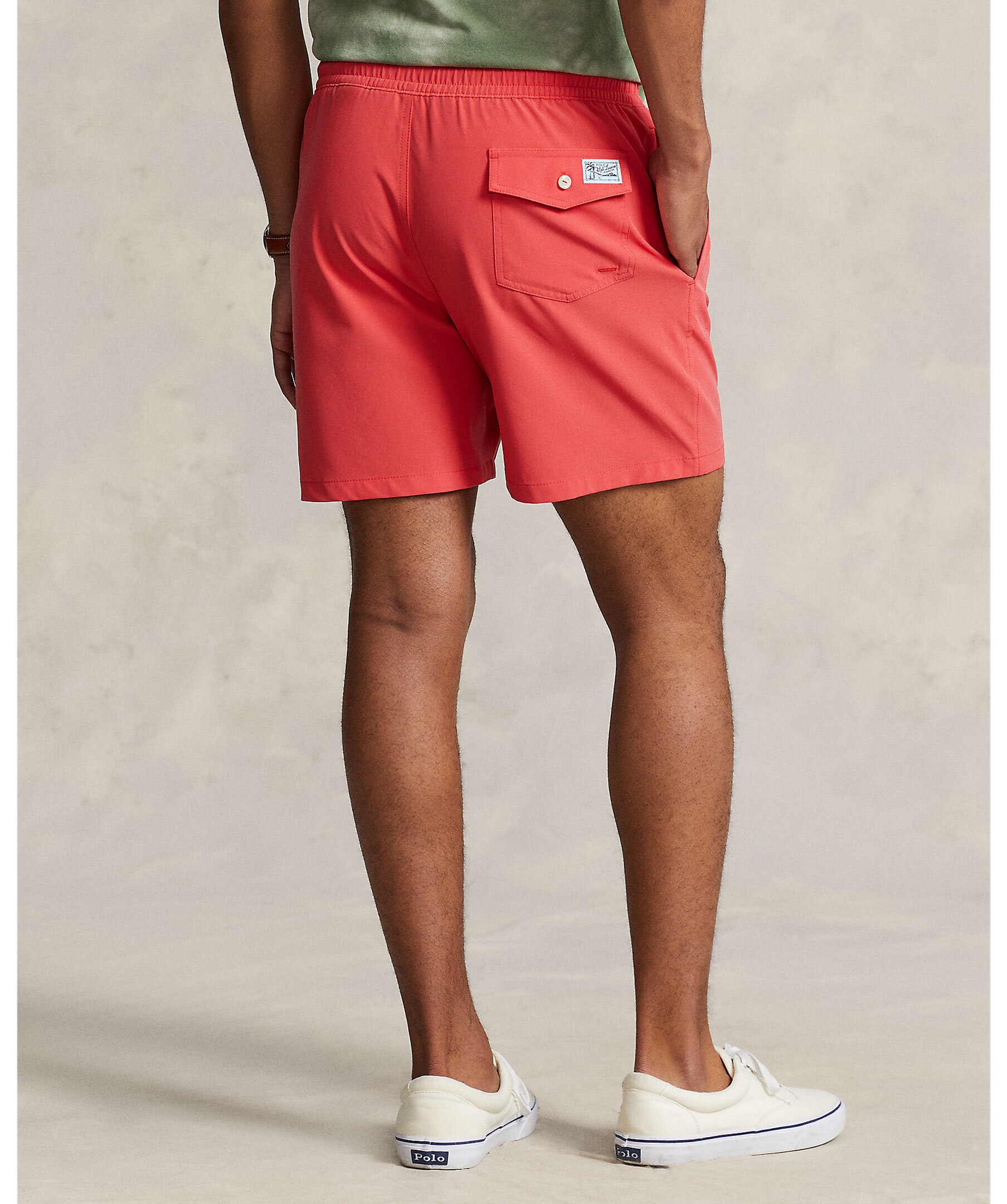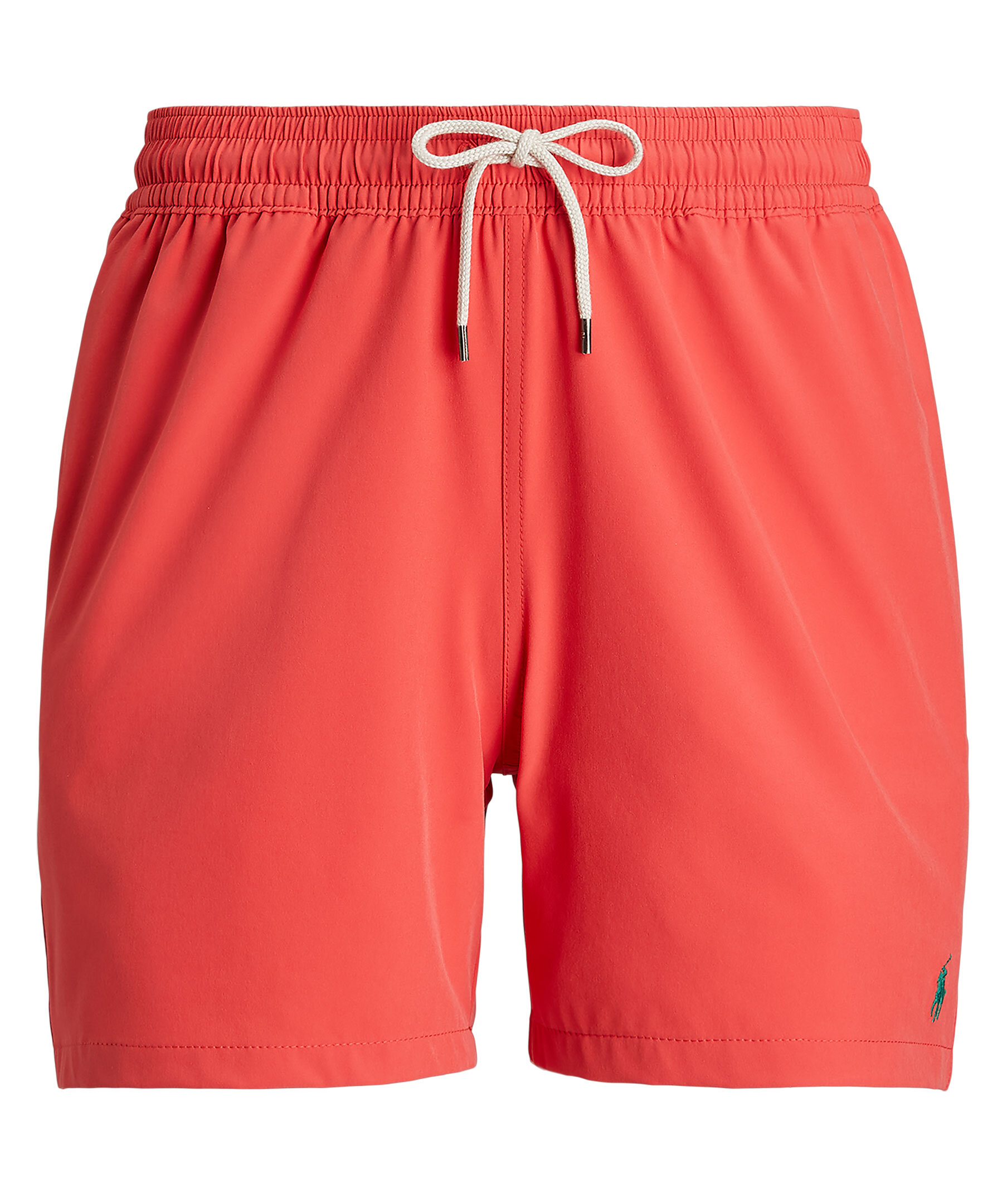 Röda badbyxor från Polo Ralph Lauren. Tillverkade i strechig, återvunnen polyester och har ett foder i meshtyg. Broderad logotyp längst ner på vänster ben, mudd och vit snörning i midjan. Två öppna framfickor och en bakficka med ficklapp och knapp. Liten, vit broderad patch på bakfickan.