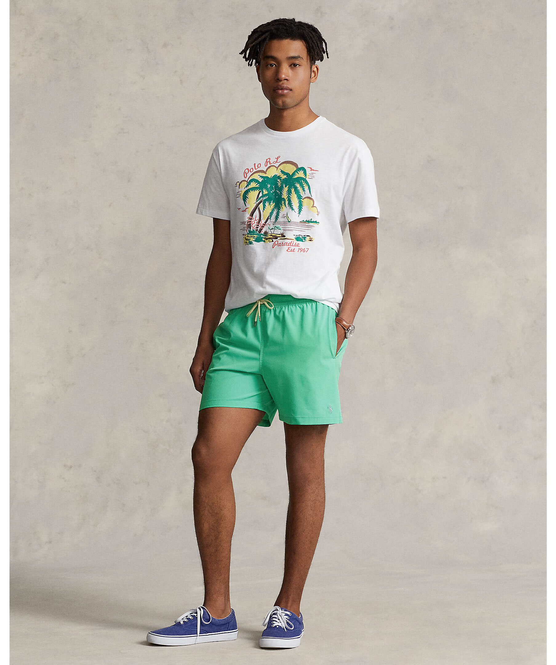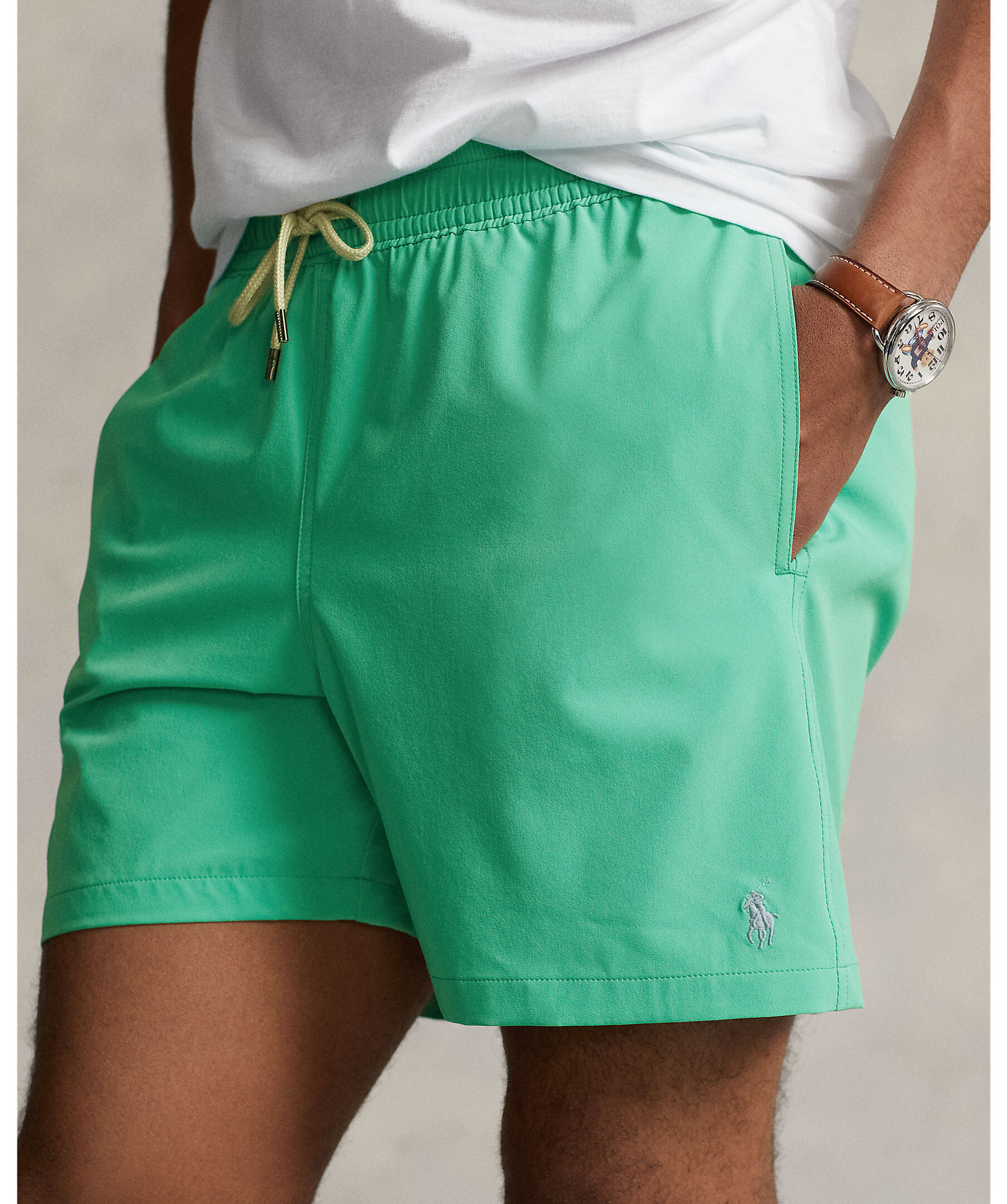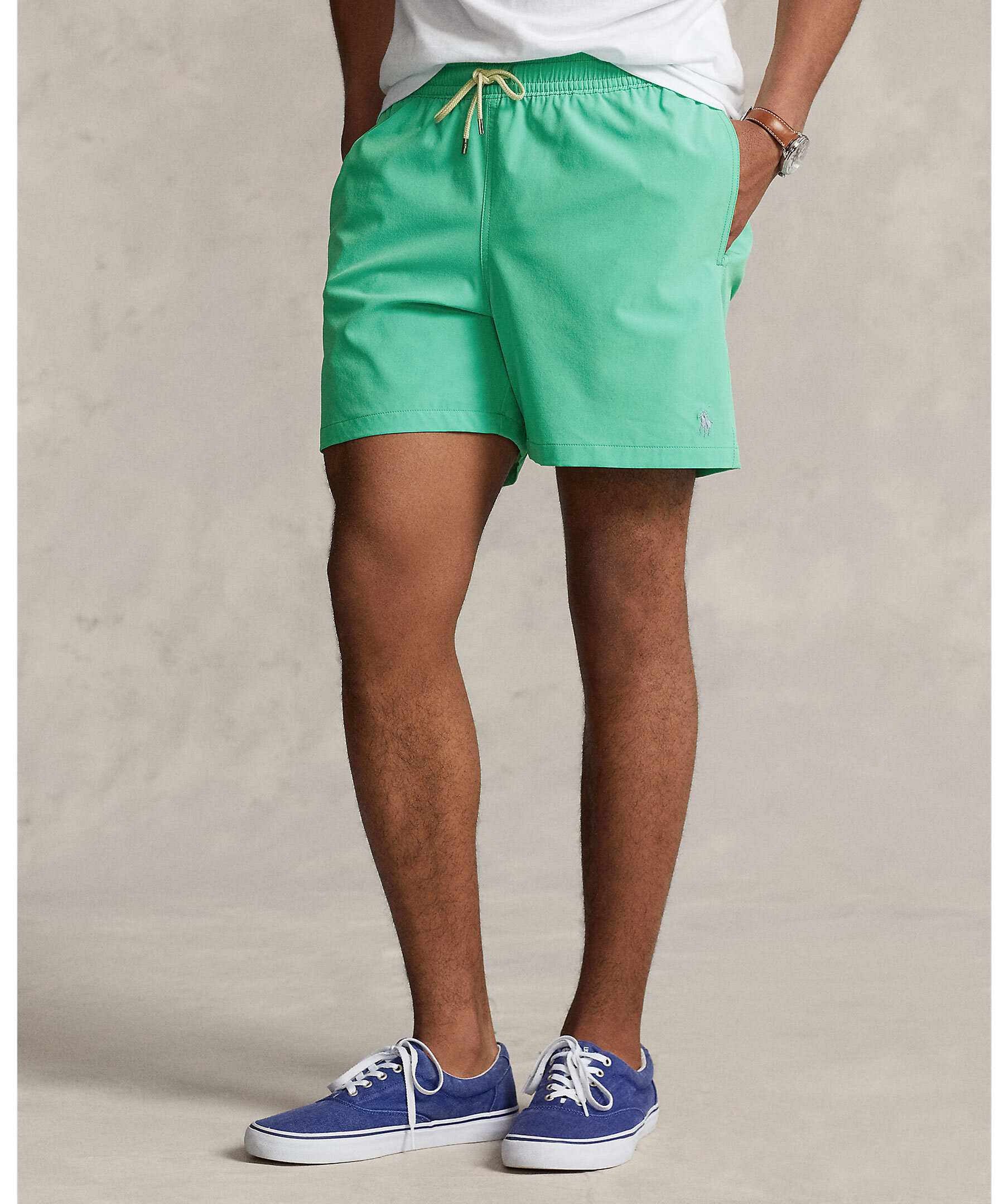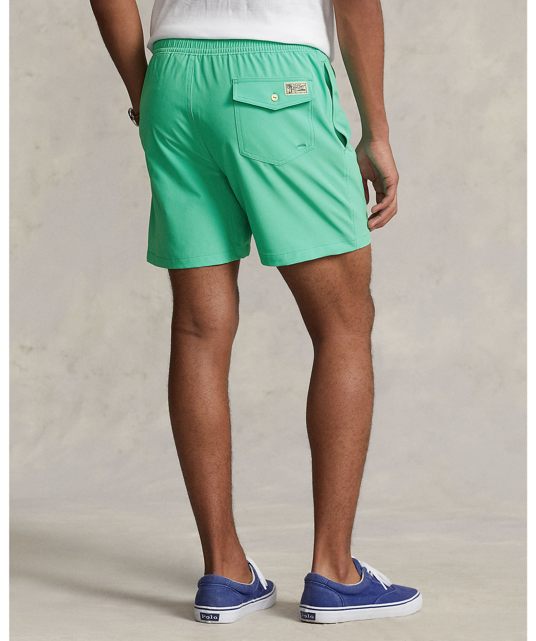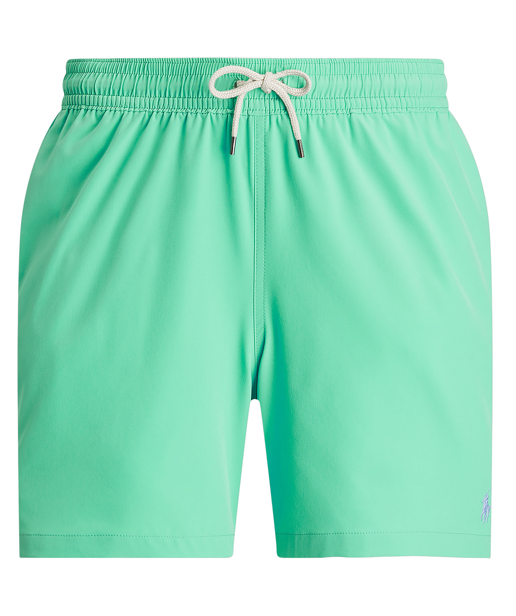 Mintgröna badbyxor från Polo Ralph Lauren. Tillverkade i strechig, återvunnen polyester och har ett foder i meshtyg. Broderad logotyp längst ner på vänster ben, mudd och vit snörning i midjan. Två öppna framfickor och en bakficka med ficklapp och knapp. Liten, vit broderad patch på bakfickan.