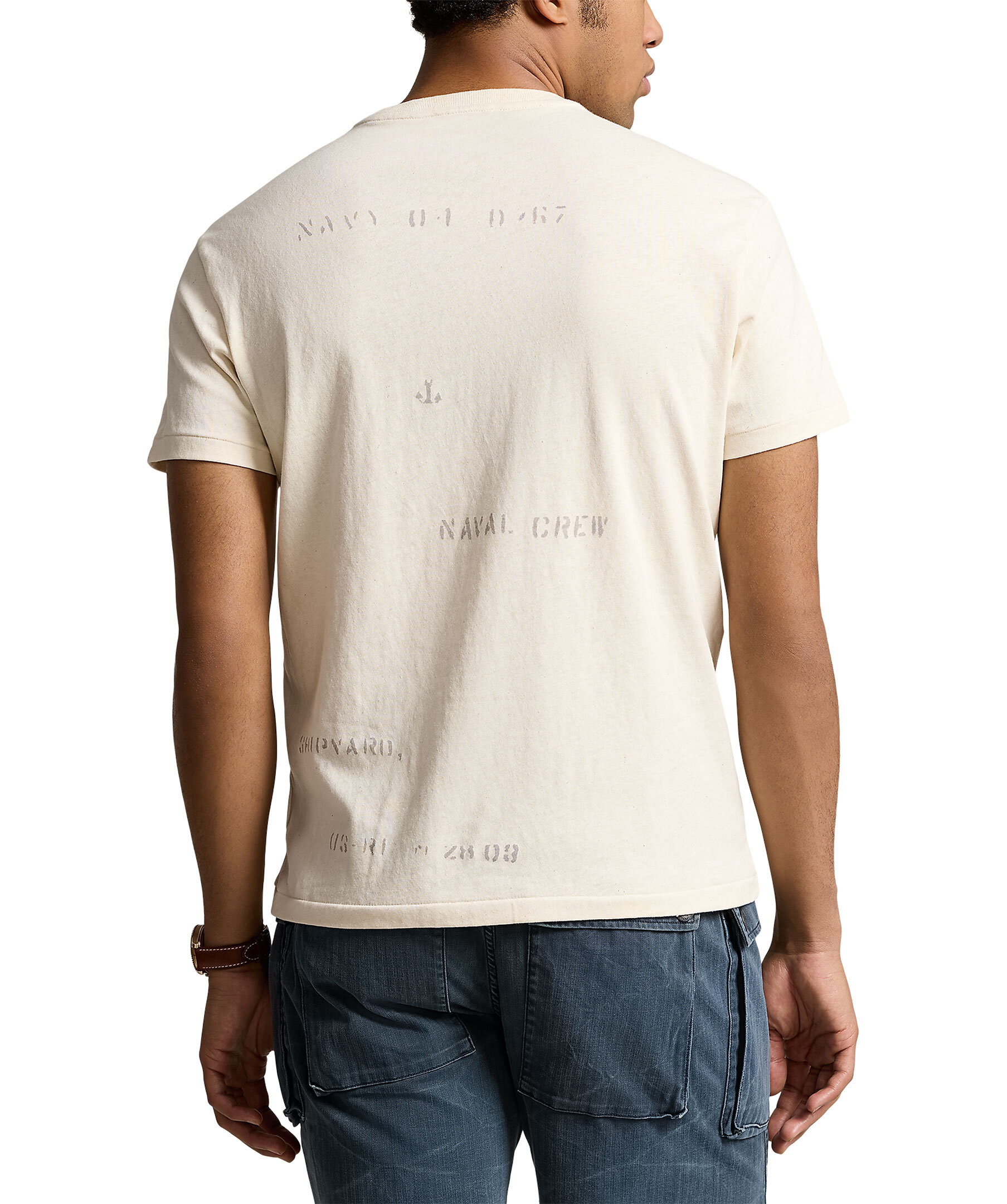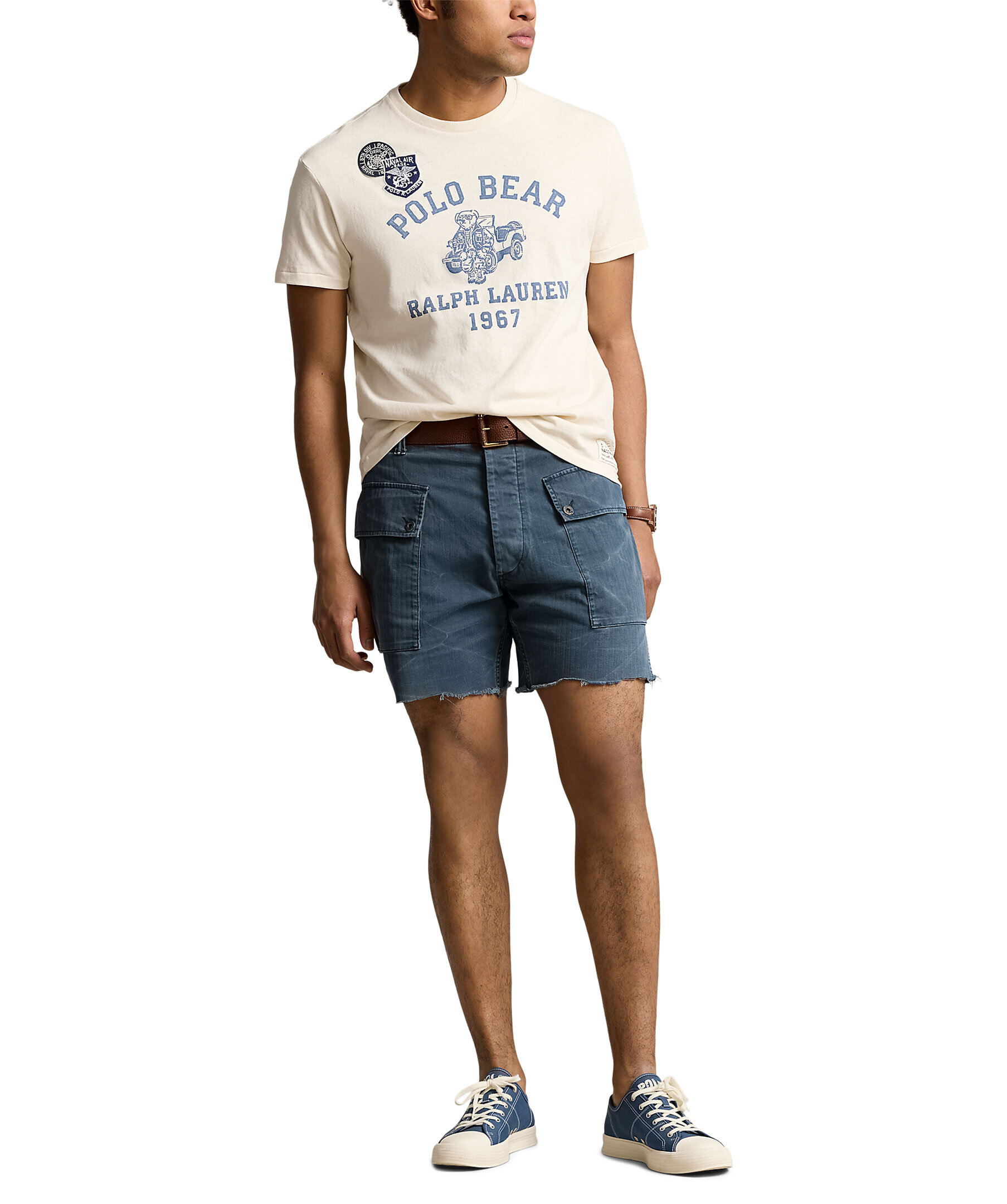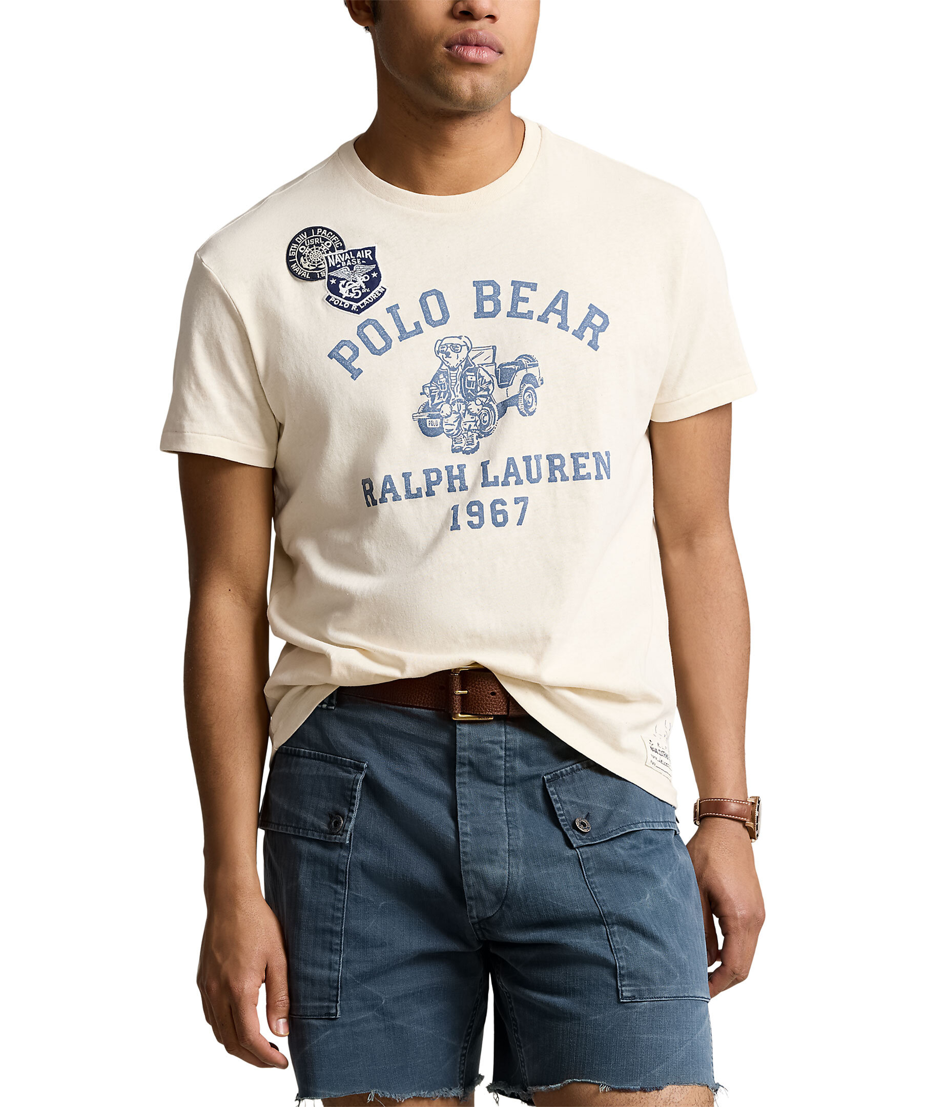 Sandfärgad T-shirt med tryck från Polo Ralph Lauren. T-shirten har deras älskade Polo Bear, såväl som "Polo Bear" och "Ralph Lauren 1967" tryck framtill. Signaturplåster på höger bröst. "R.L.P.C." etikett på vänster fåll. Stenciltryck genomgående. Tillverkad i 100% bomull. Storlek M har en kroppslängd på 72,4 cm (fram och bak), 50,8 cm axel och 111,8 cm bröst.