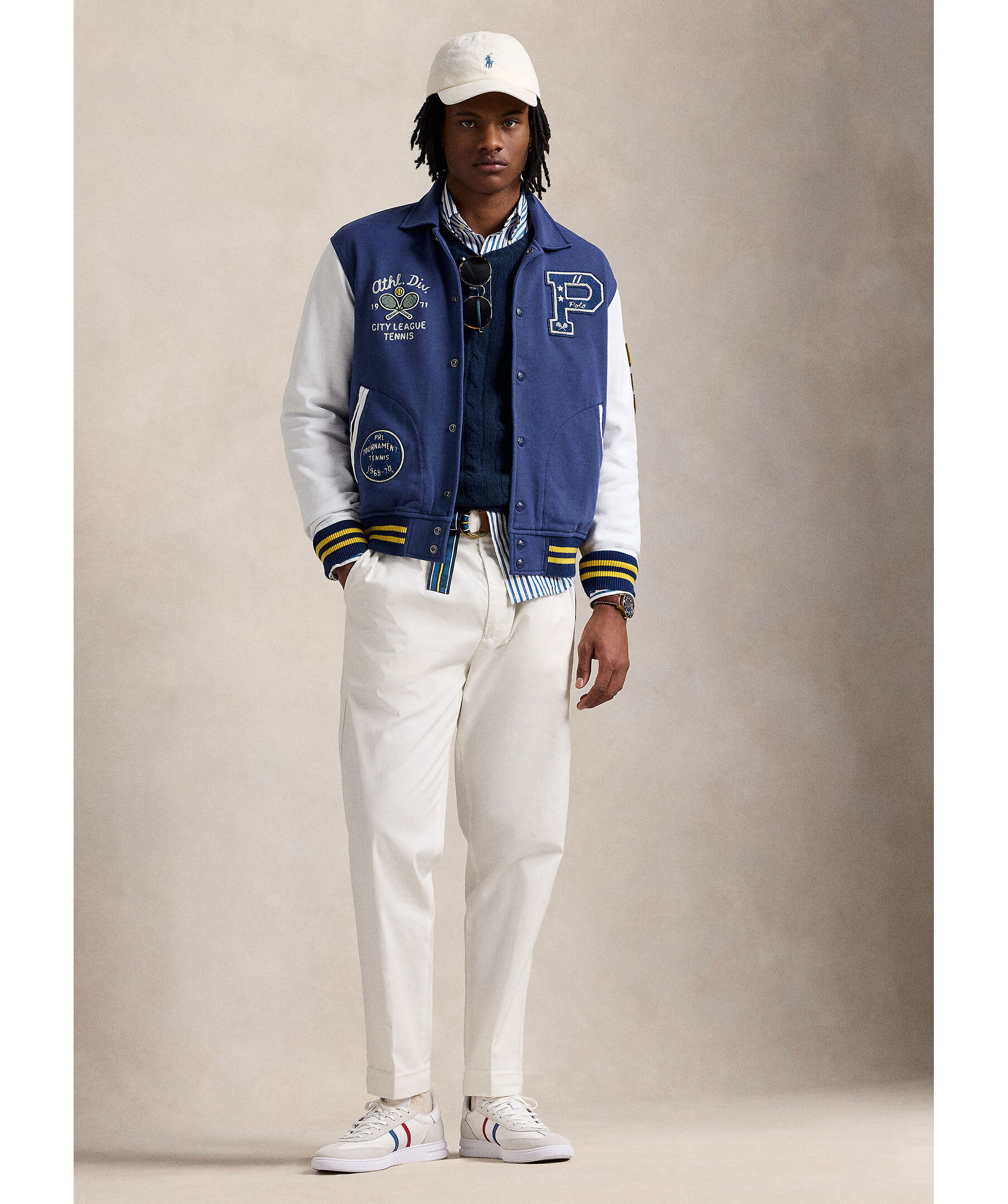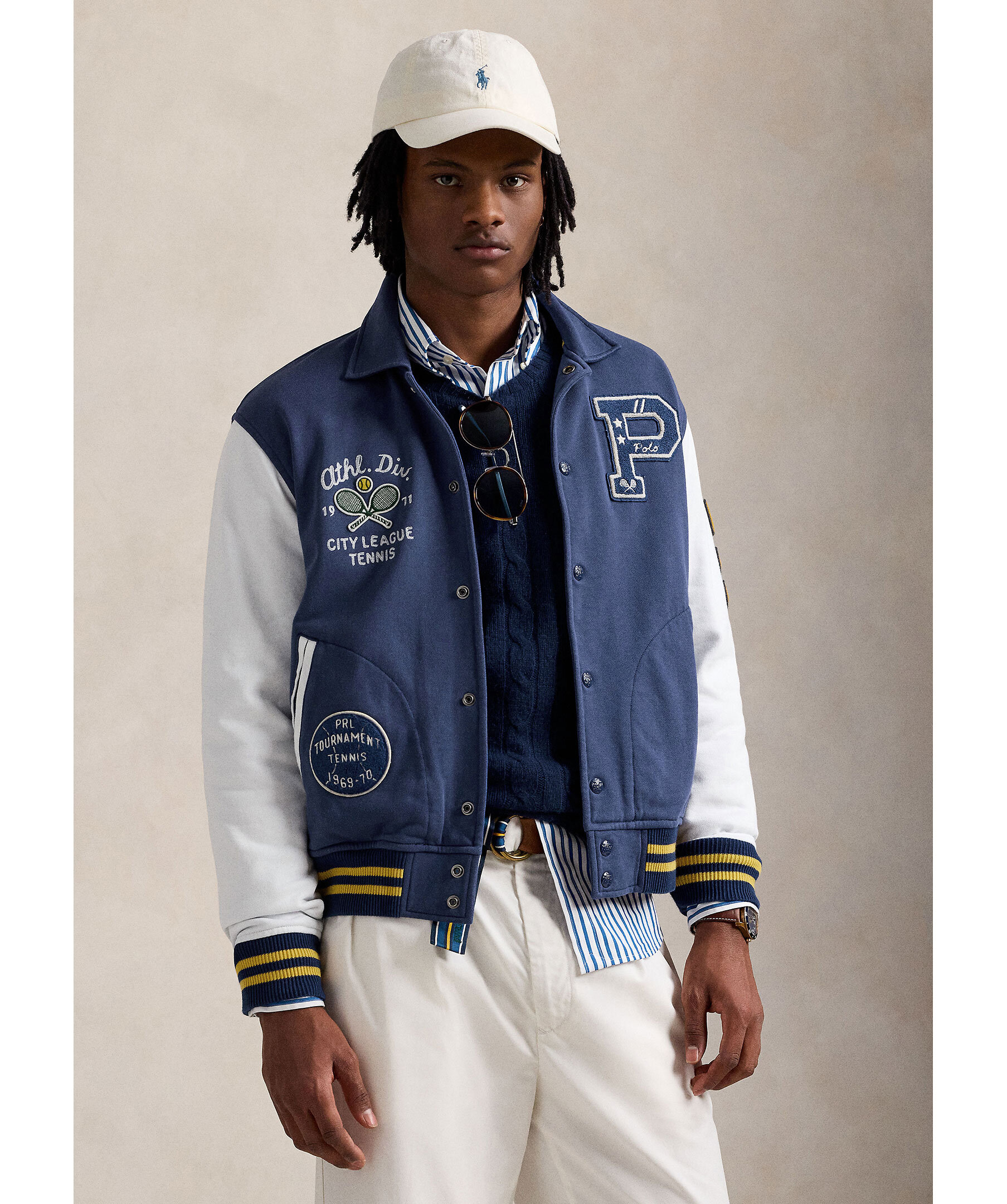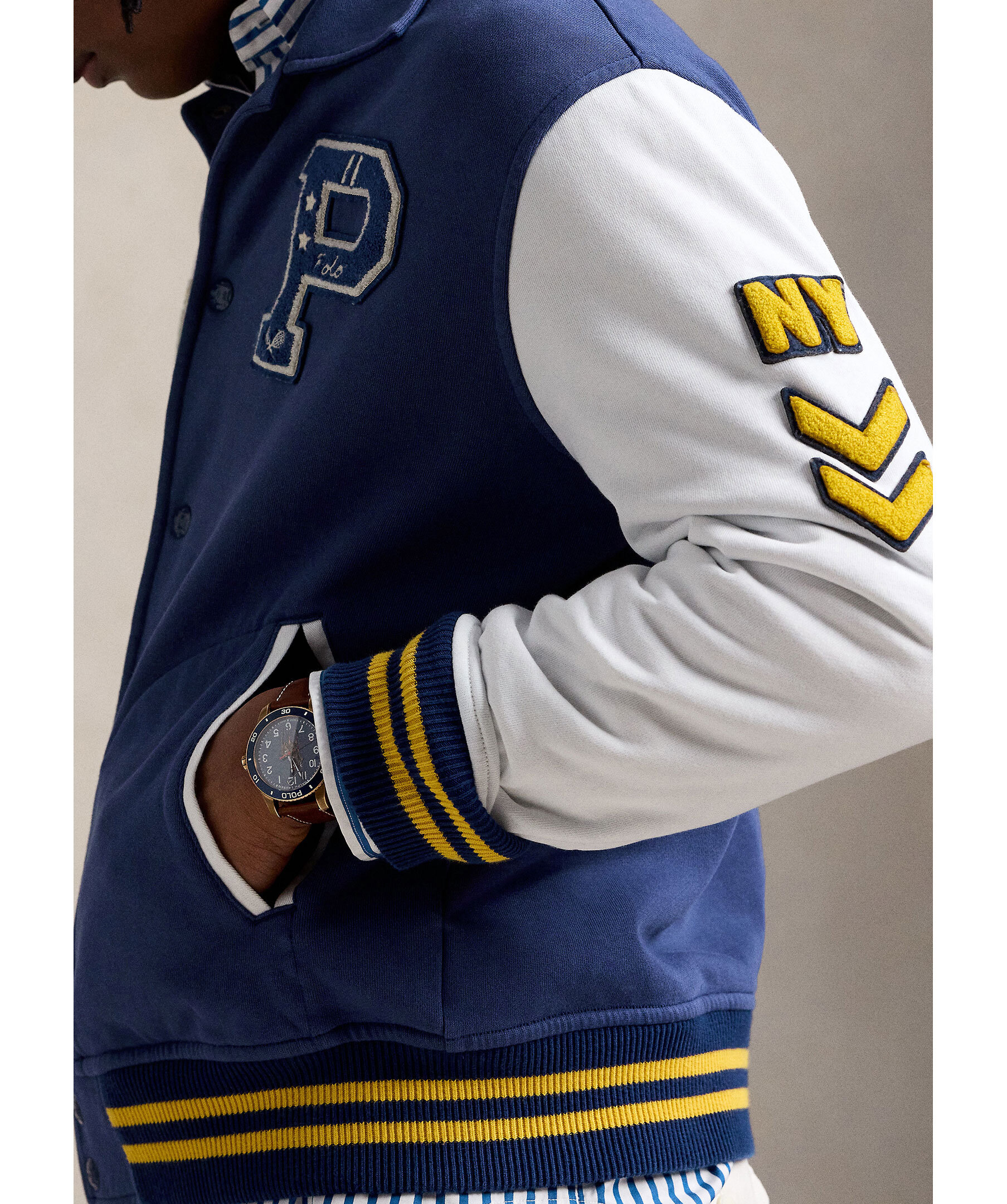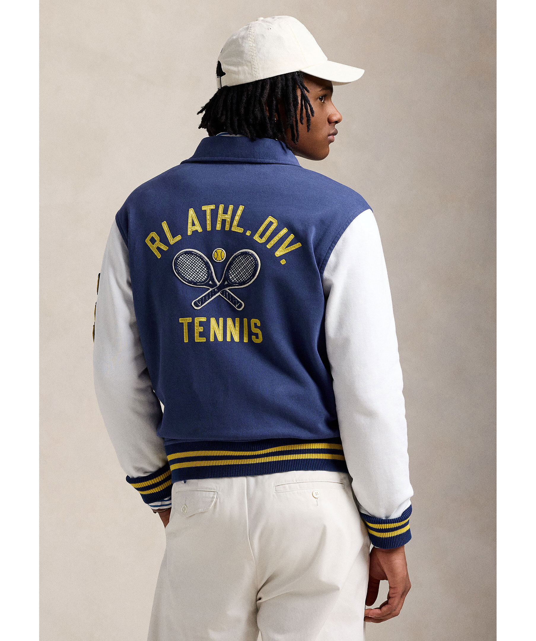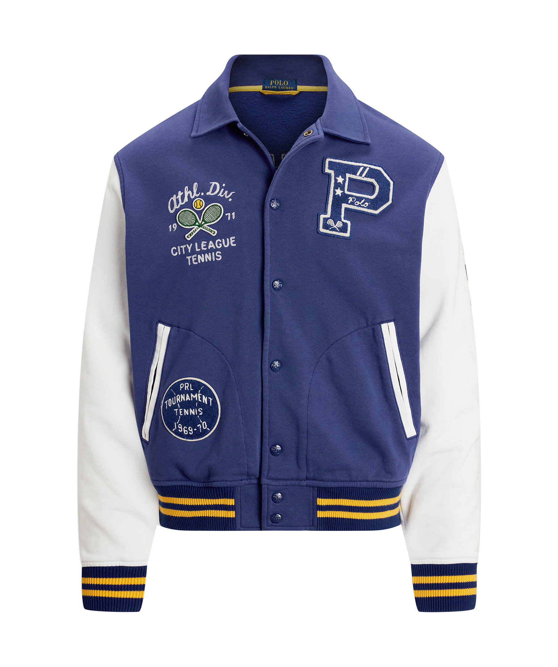 Blå universitetsjacka från Polo Ralph Lauren. Jackan stängs med tryckknappar framtill och har broderade tryck på bröstet, ärmarna samt ryggen. Vit kontrasterande färg på ärmarna. Två sidfickor. Tillverkad i en bomullsblandning.