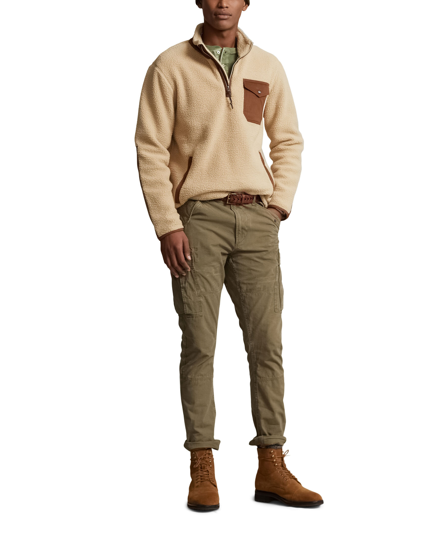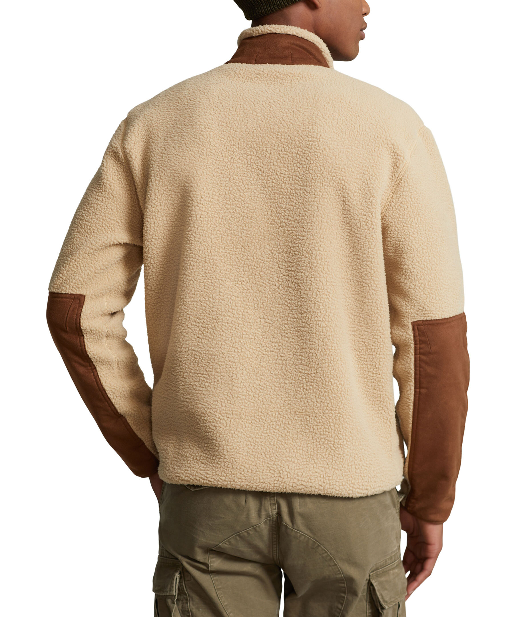 Beige fleece med half-zip från Polo Ralph Lauren. Bruna konstmocka detaljer vid ärmarna. Bröstficka med ficklock och trykknapp samt två framfickor. Liten elastisk mudd vid ärmslut. Modellen är 185cm lång och har på sig storlek M.