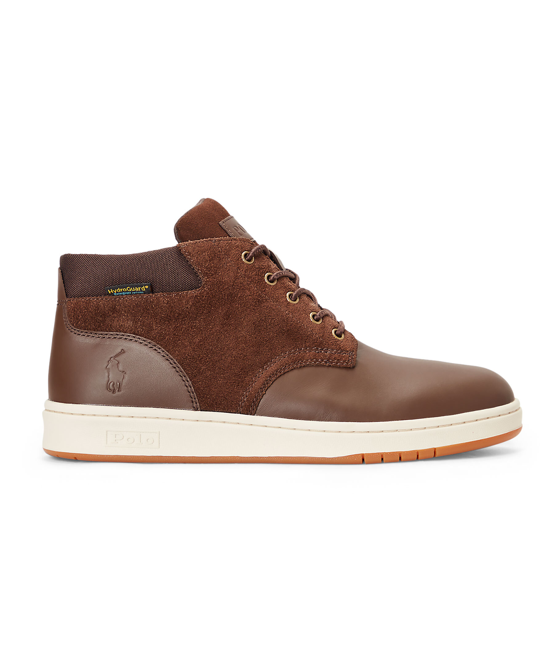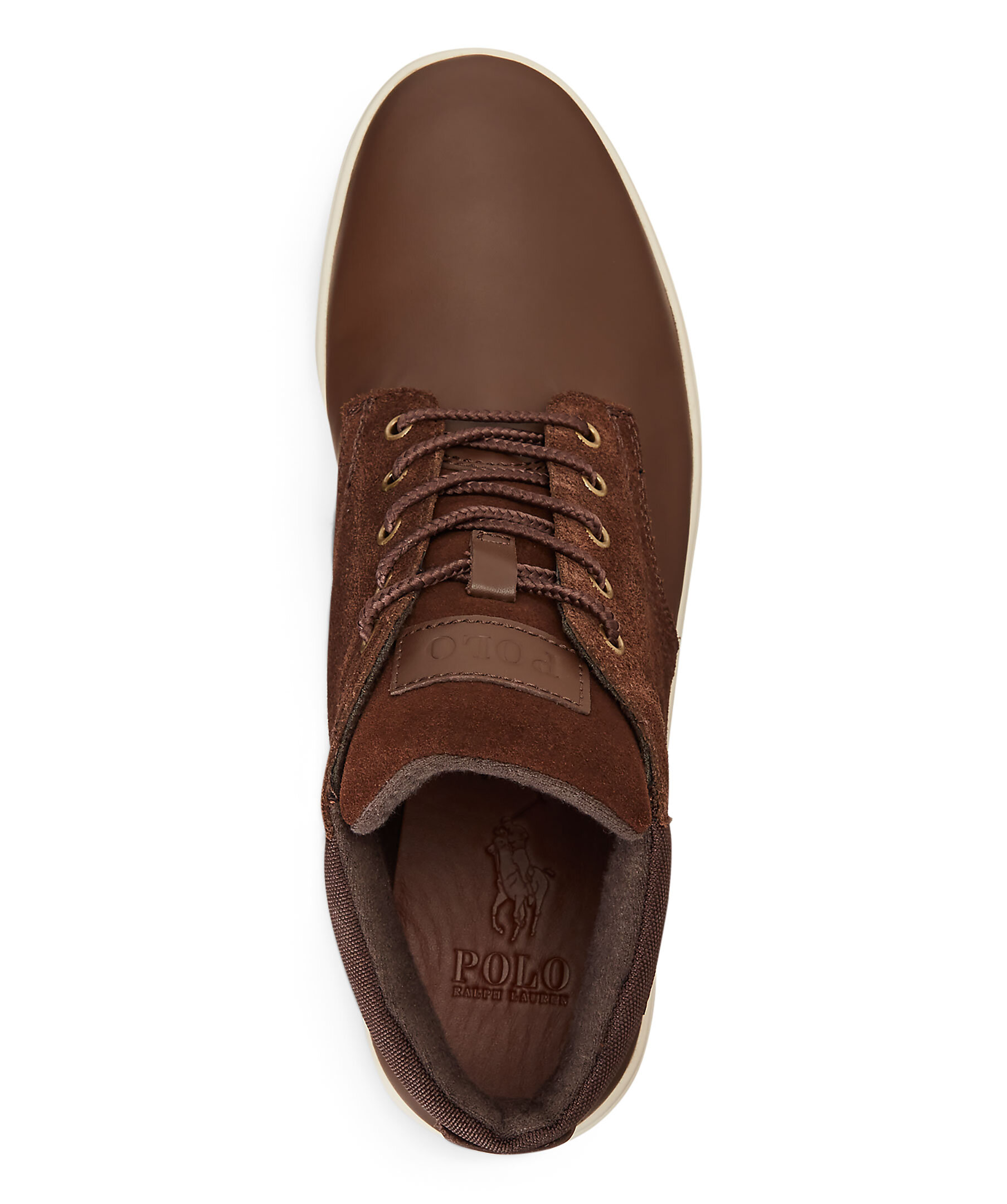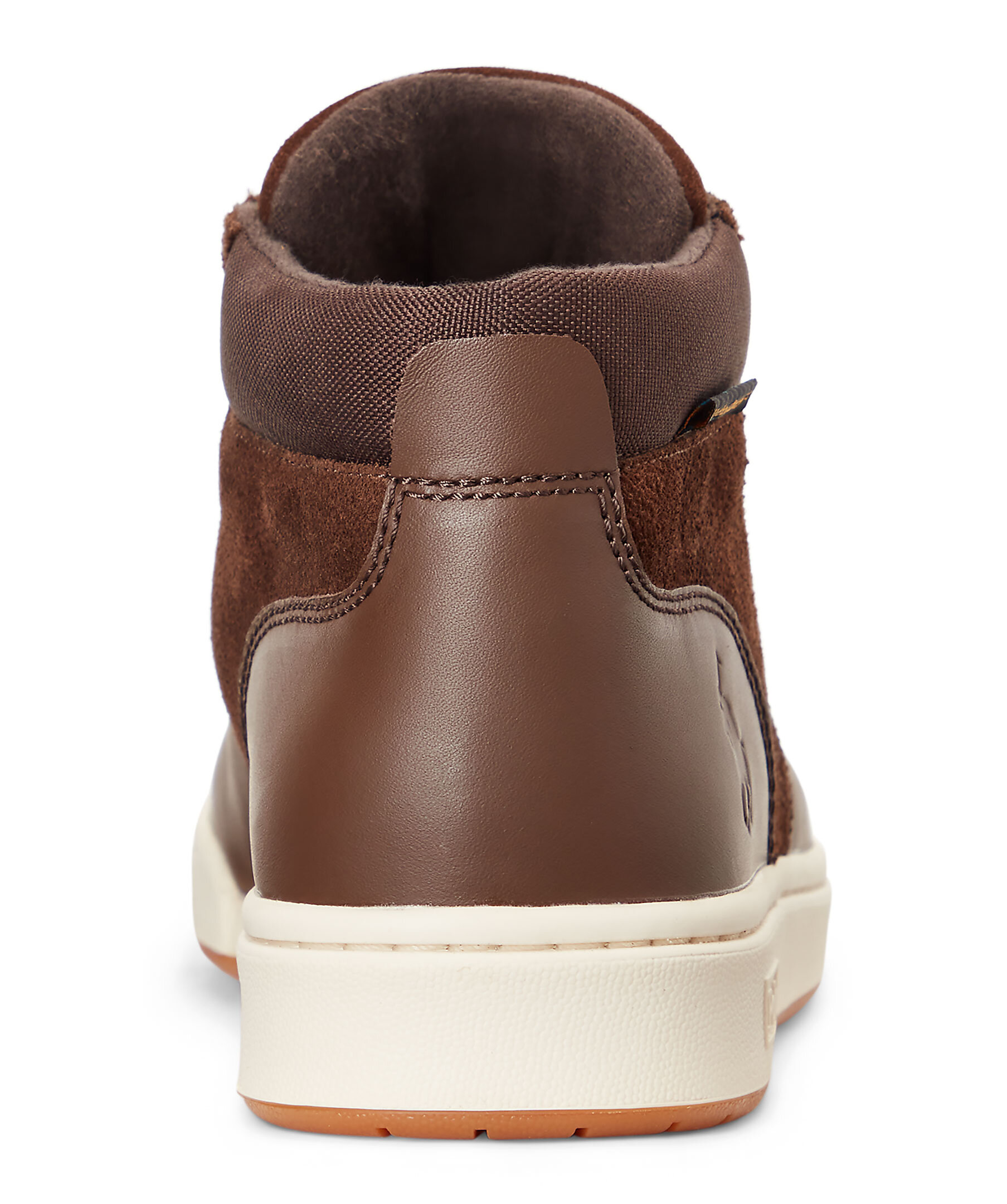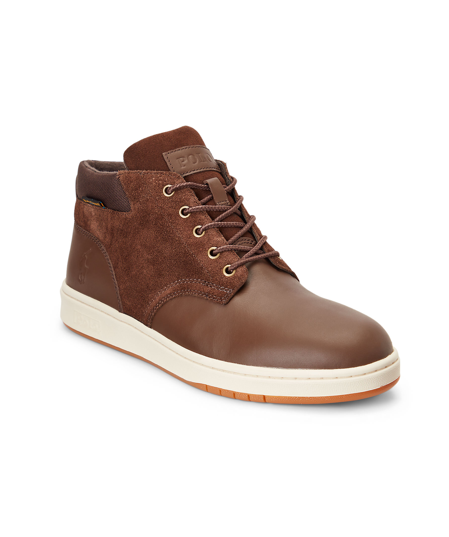 Bruna höga sneakers i läder och mocka från polo Ralph Lauren. Stansad logotyp på skons yttersida och på Plösen. Hög sula i gummi. Bruna runda skosnören. Detalj i textil på hälen.
