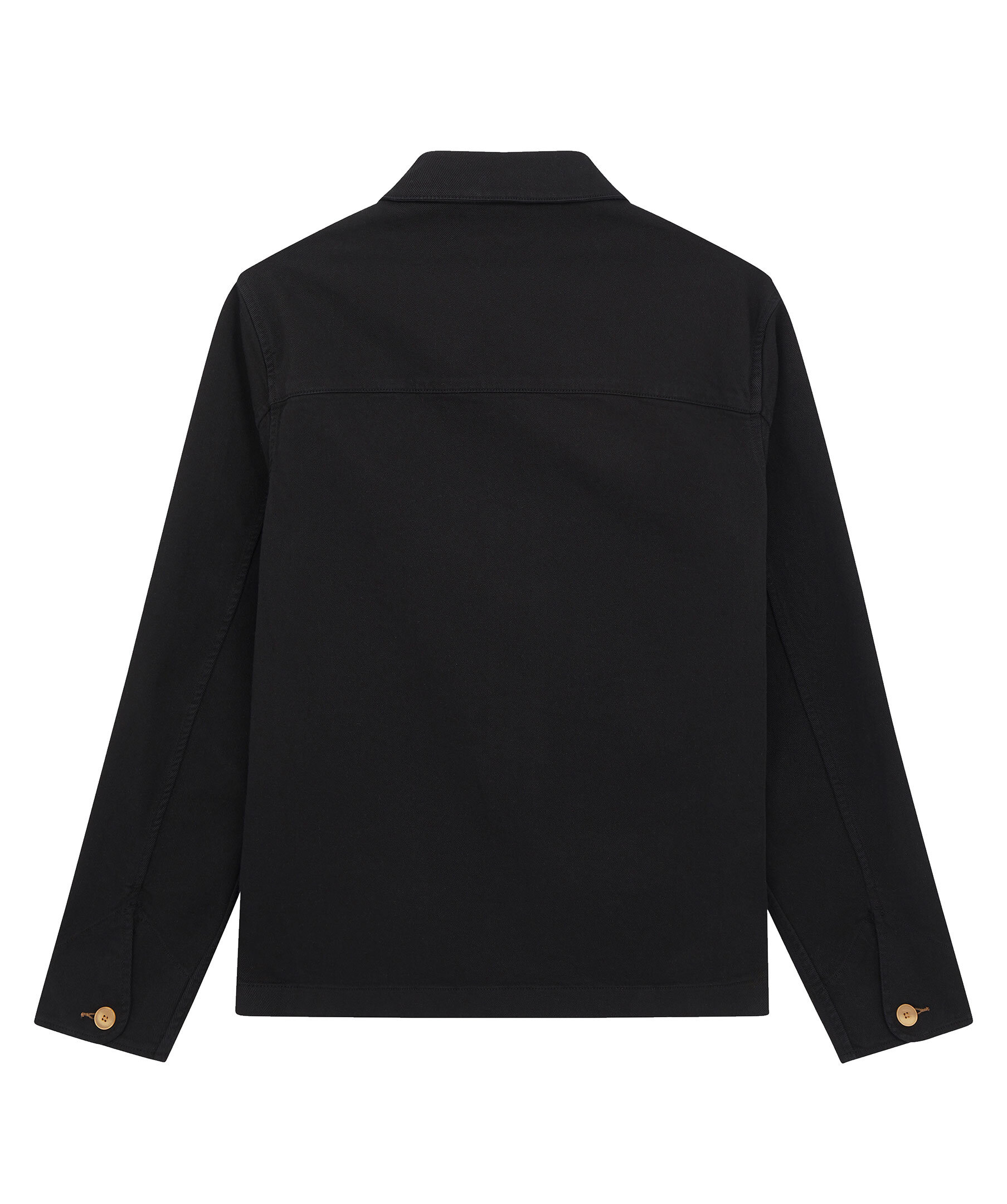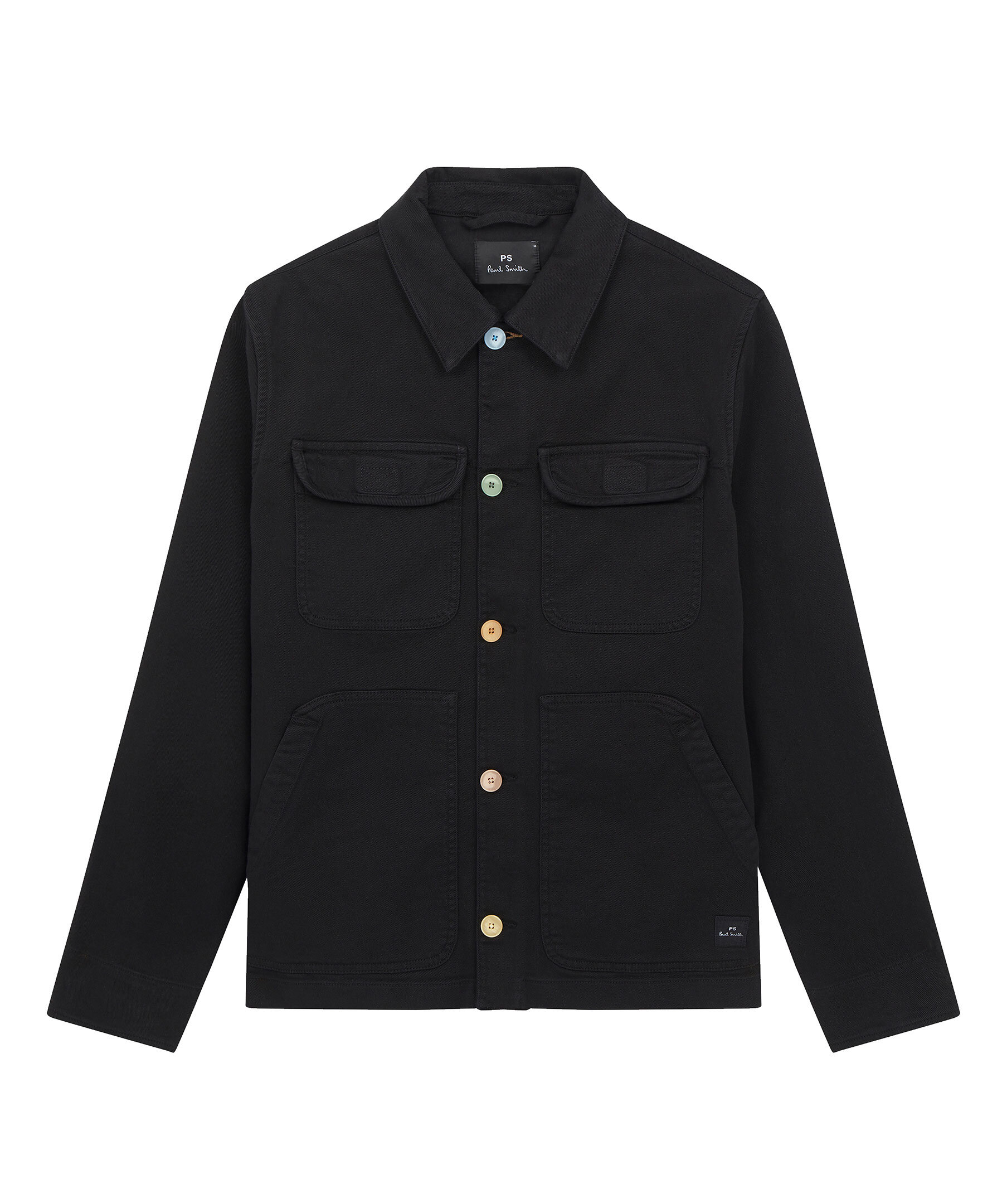 Svart jacka från PS Paul Smith. Jackan har en tygfärgad finish och en klassisk arbetskläders inspirerad siluett. På framsidan finns 4 fickor, de två översta har en kardborre stängning. PÅ jackan stängs med knappar i olika melerade färger. På ena nedra fickan finns en tygpatch logotyp. Tillverkad i en organisk bomullsblandning.