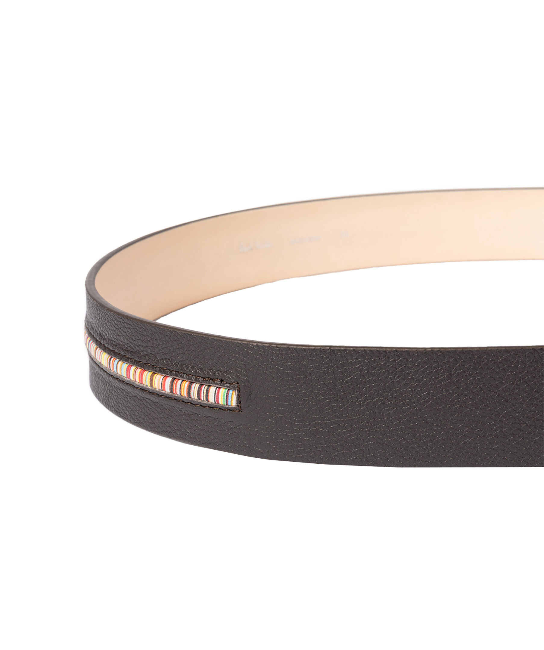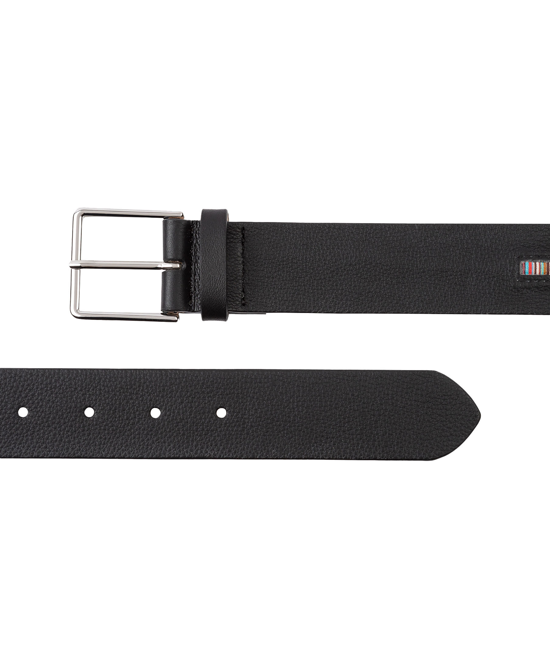 Svart skärp i läder från PS Paul Smith. Multifärgad rand i textil. Spänne i metall. Skräpet är 3,5 cm brett.