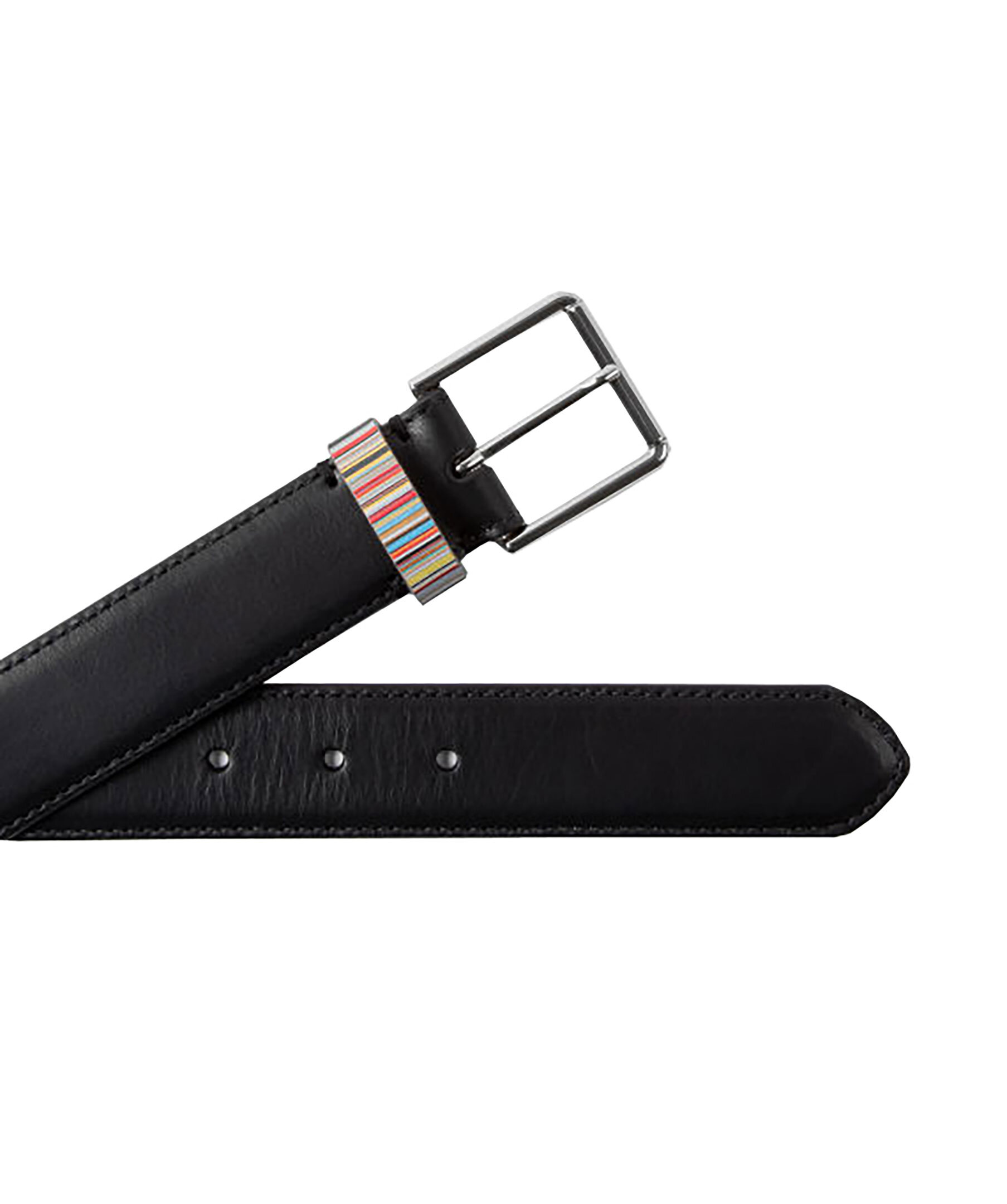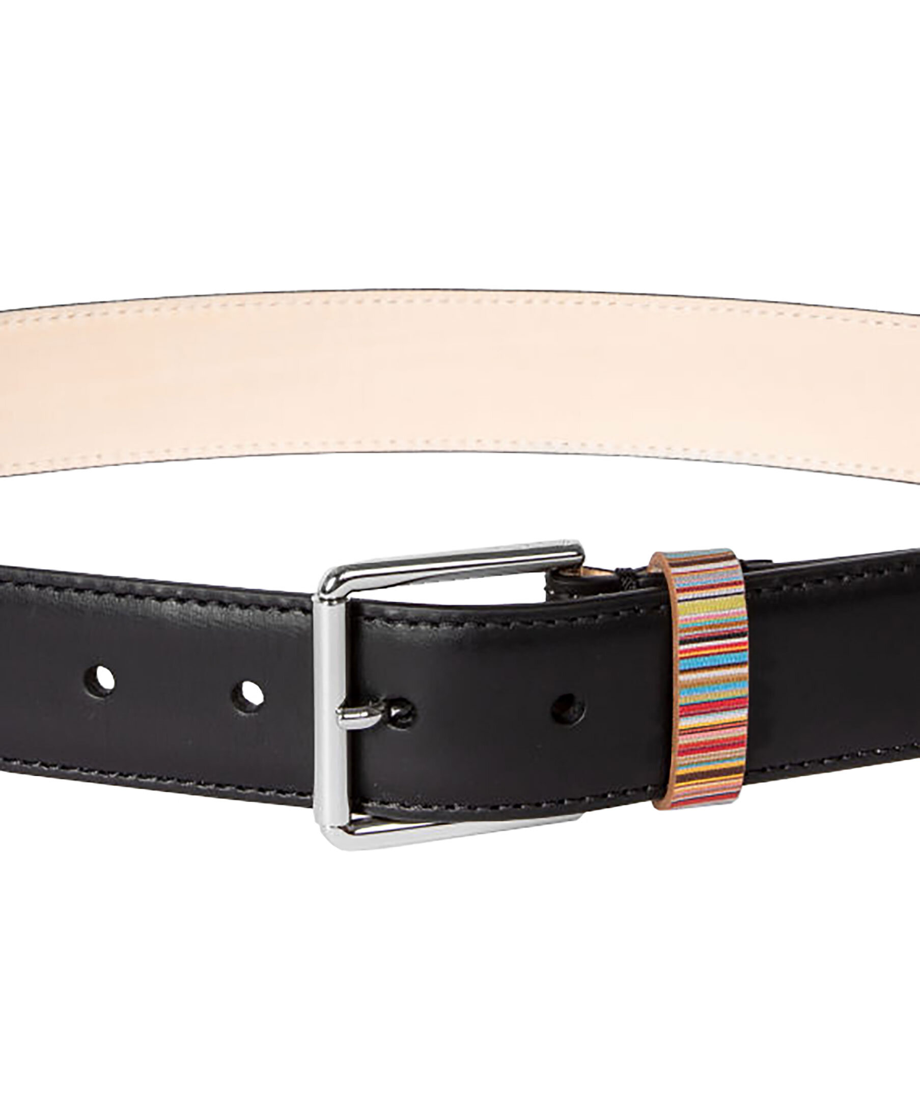 Svart bälte i läder från PS Paul Smith. Ögla vid spännet med signaturränder och tillverkat av ett slätt läder. Silverfärgat spänne och 5 olika hål för justering av storleken. Insida i naturligt ljust läder.