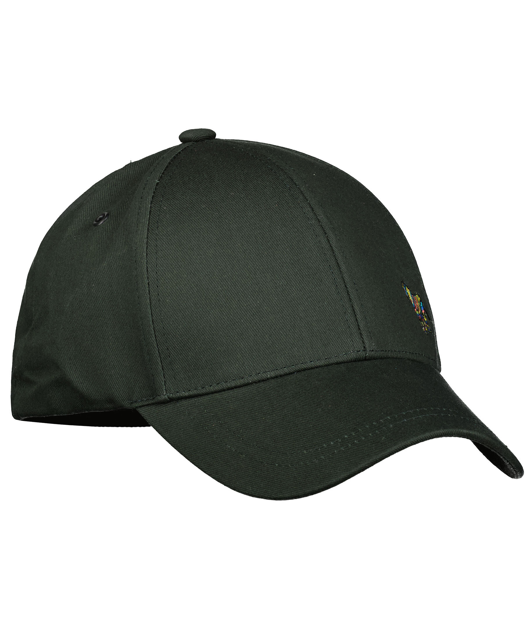 Mossgrön keps med böjd skärm från PS Paul Smith. Tillverkad av 100% ekologiskt odlad bomull, har Paul Smtihs klassiska Zebra-logotyp broderad på framsidan till vänster. Svart innerband och justerbart spänne i metall bak med upphöjd logotyp.