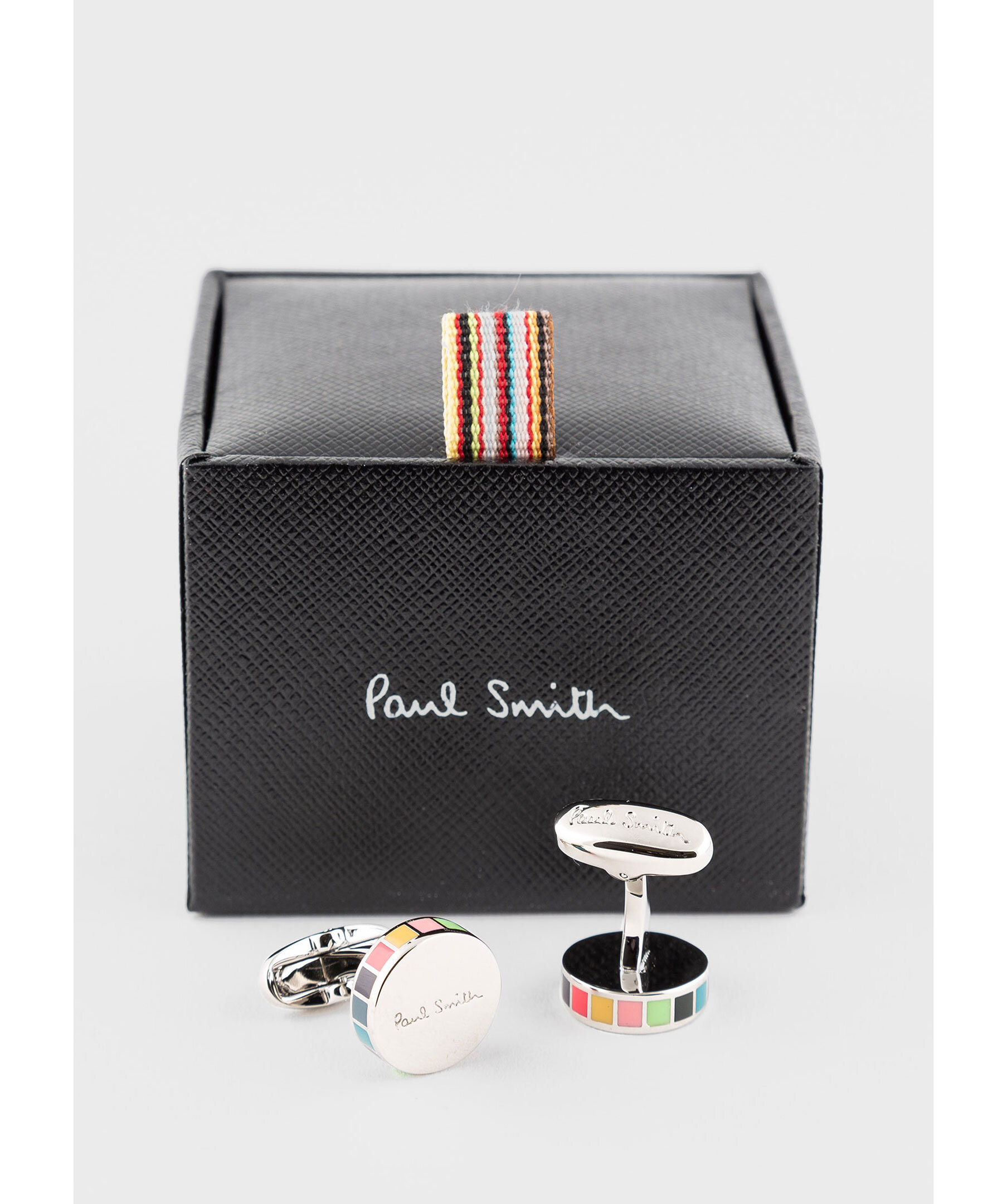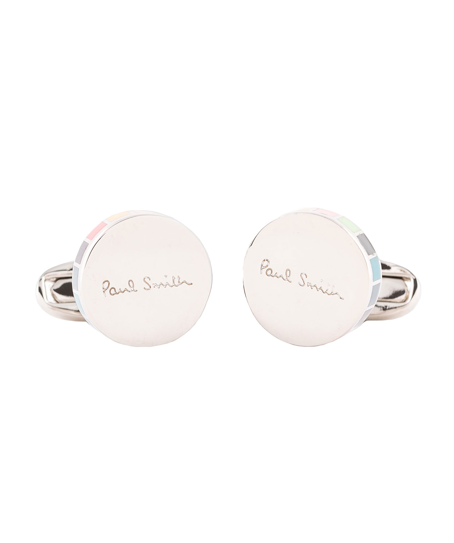 Silverfärgade, runda manschettknappar från PS Paul Smith. Kanterna runt om är flerfärgade och det finns en präglad logotyp mitt i cirkeln. Signaturpräglade T-bar-fästen. Storlek: 1,5 x 1,5 cm