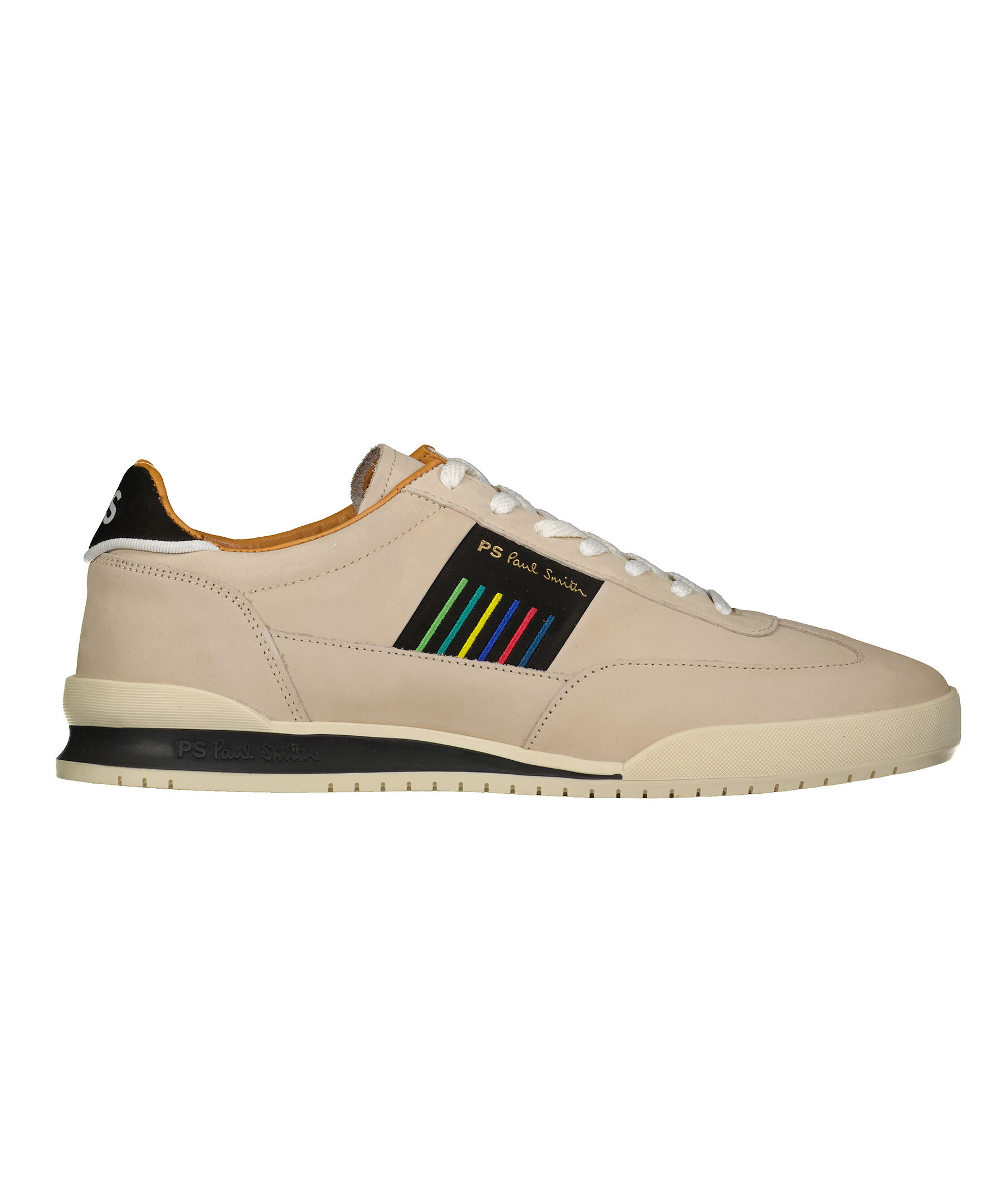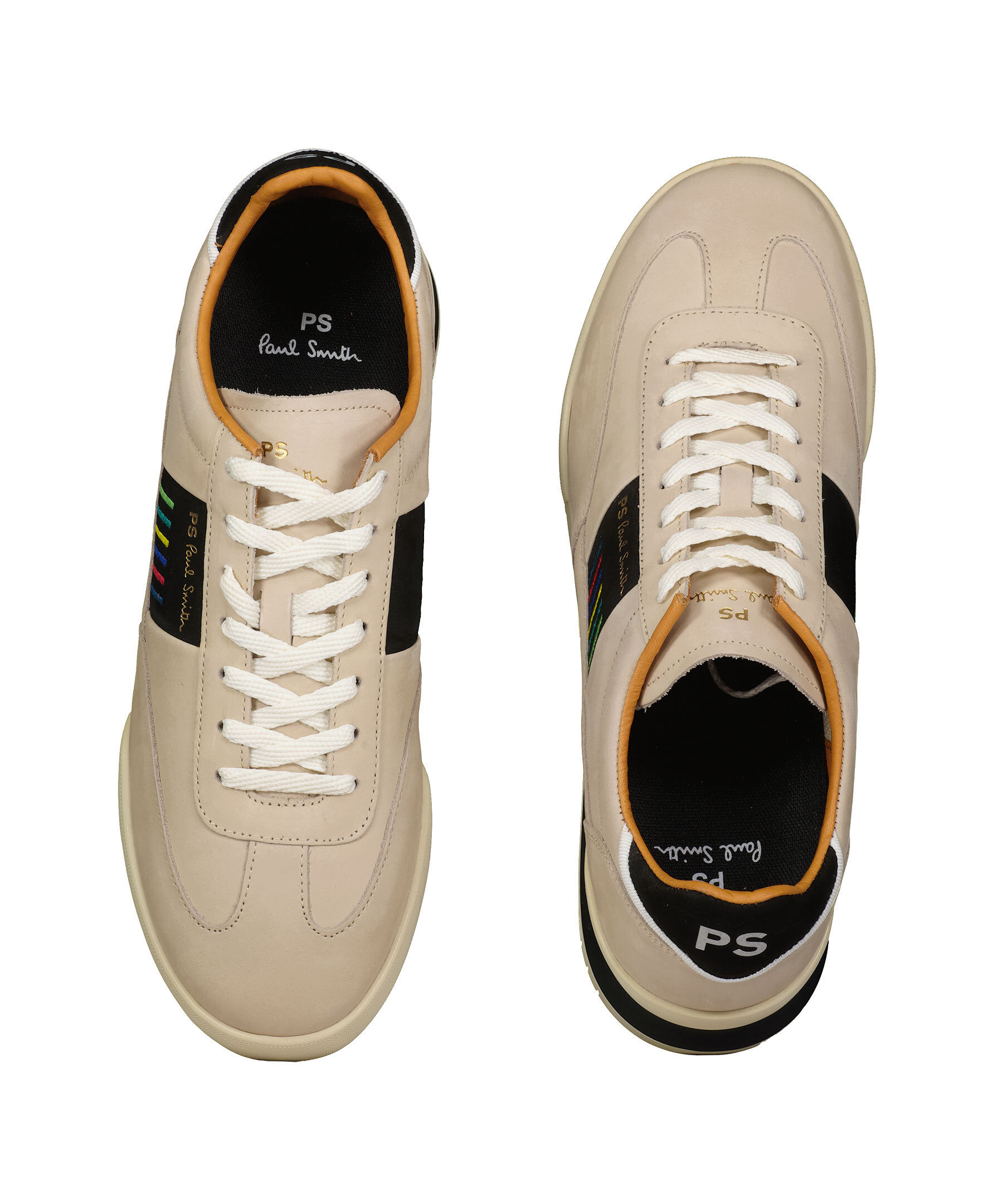 Beigea sneakers från PS Paul Smith. Tillverkade i läder. Svart streck på utsidan och insidan med logotyp. Vita, platta skosnören. Svart logotyp på hälen och på undersidan av skon. Logotyp på plösen.