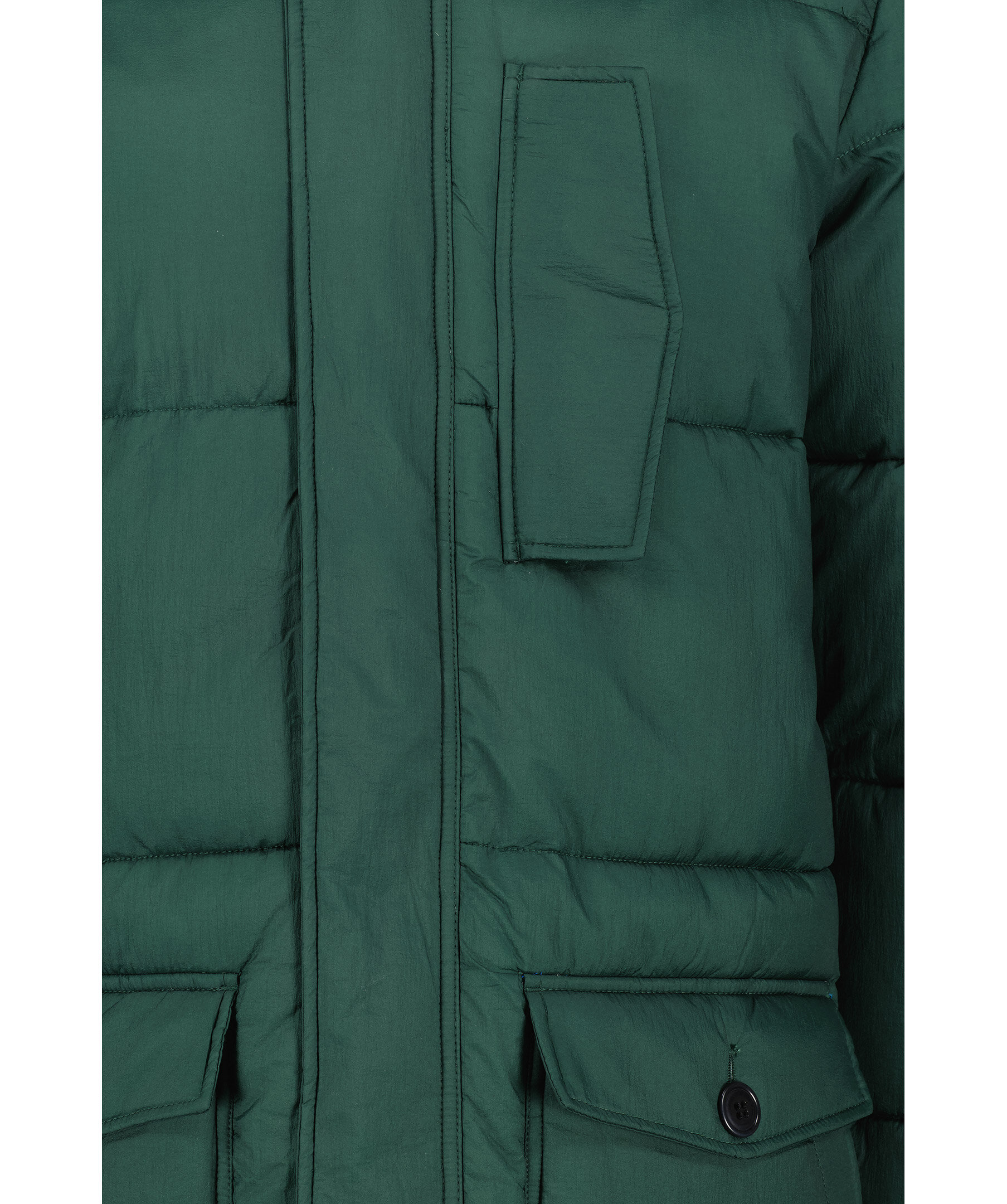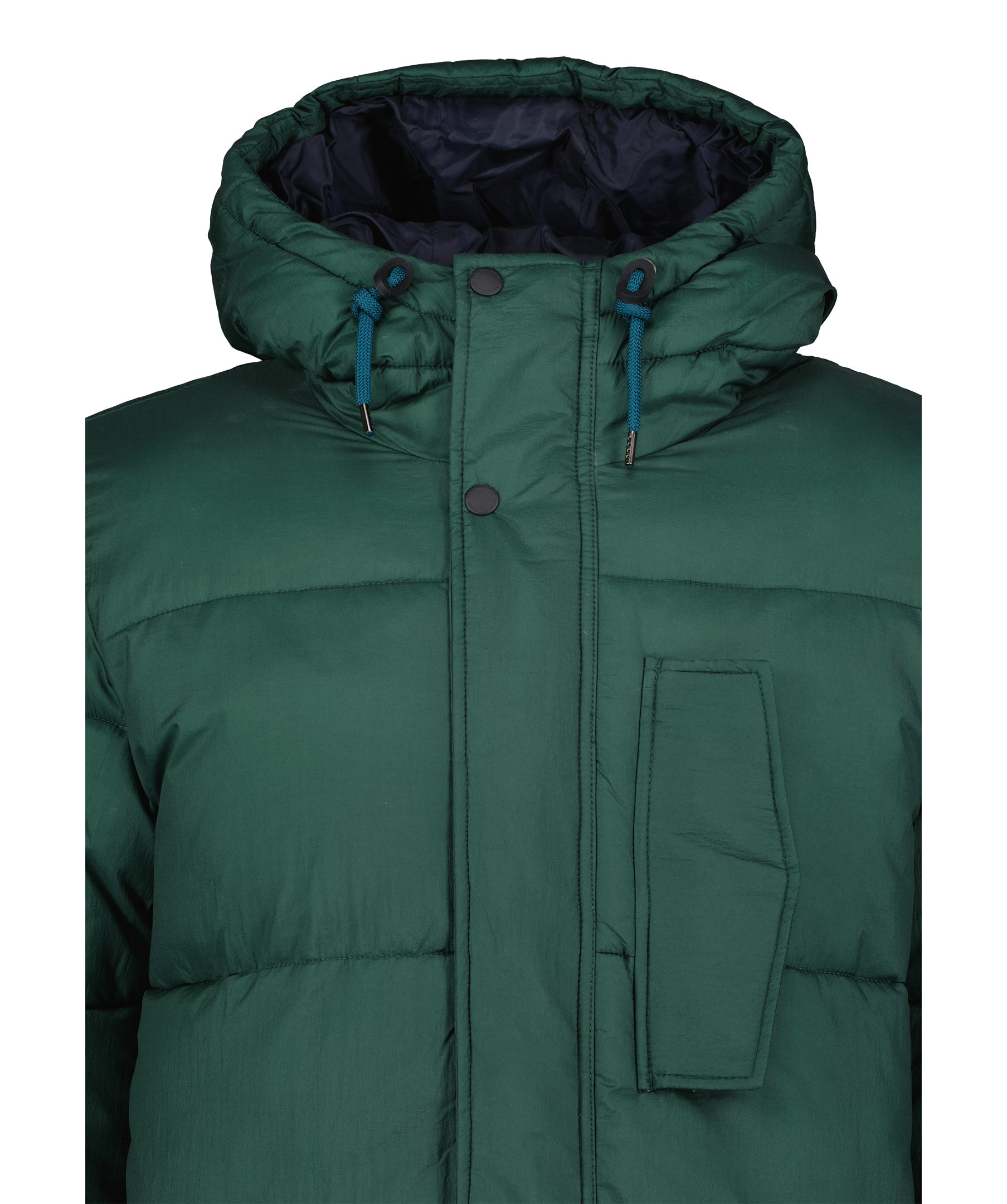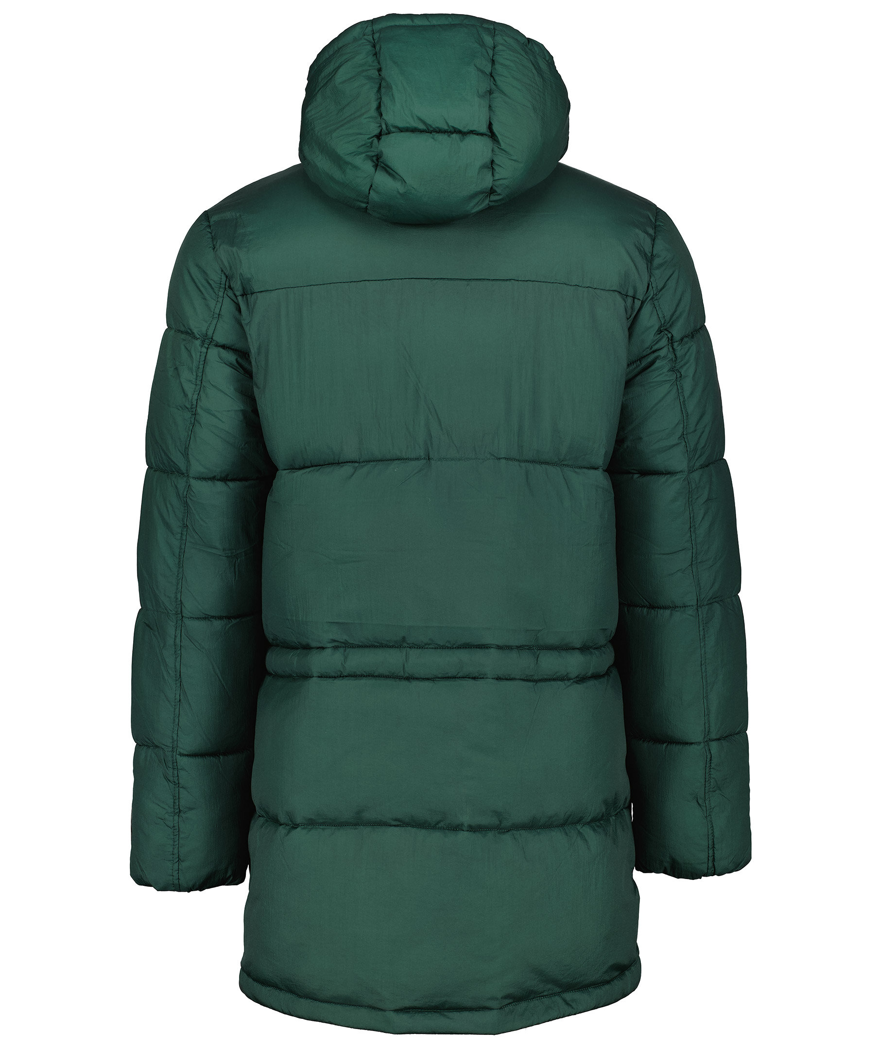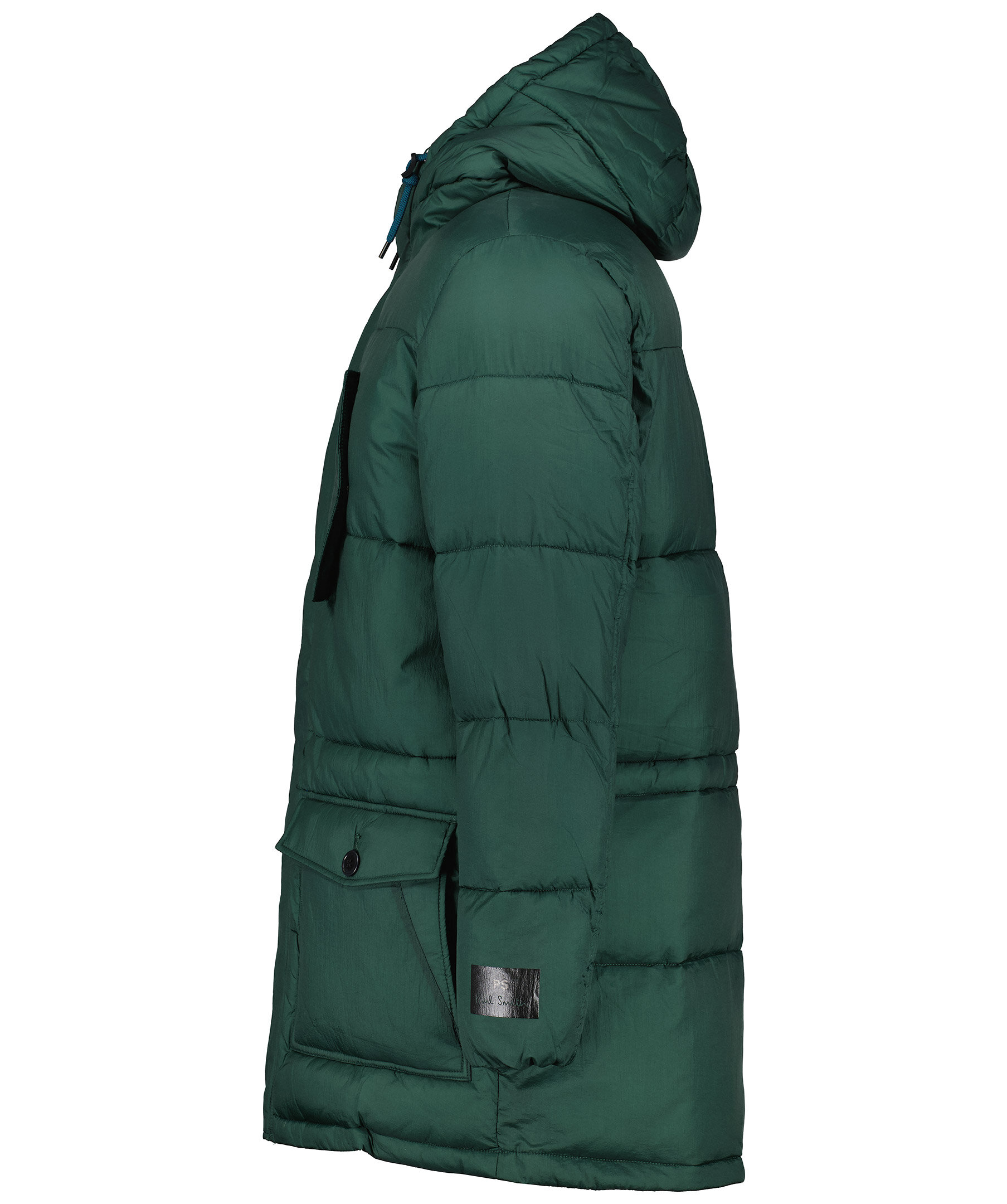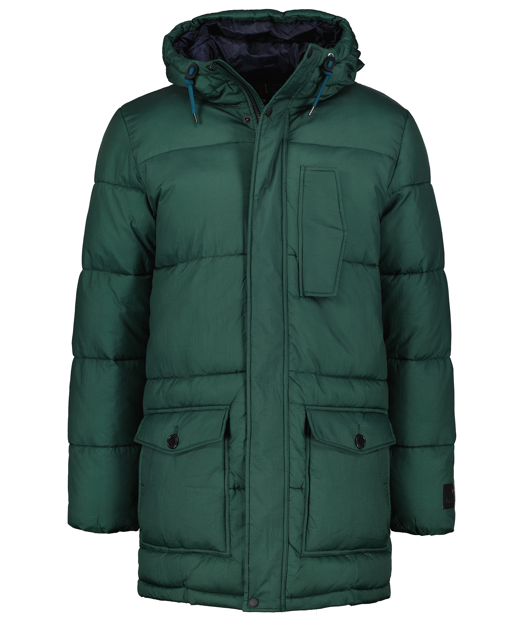 Grön vinterjacka från PS Paul Smith i längre modell. Tillverkad i återvunnen nylon med vaddering i återvunnen polyester. En ficka på bröstet, dubbelfickor framtill, en innerficka. Mysig luva med dragsko, logotyp på vänster ärm.