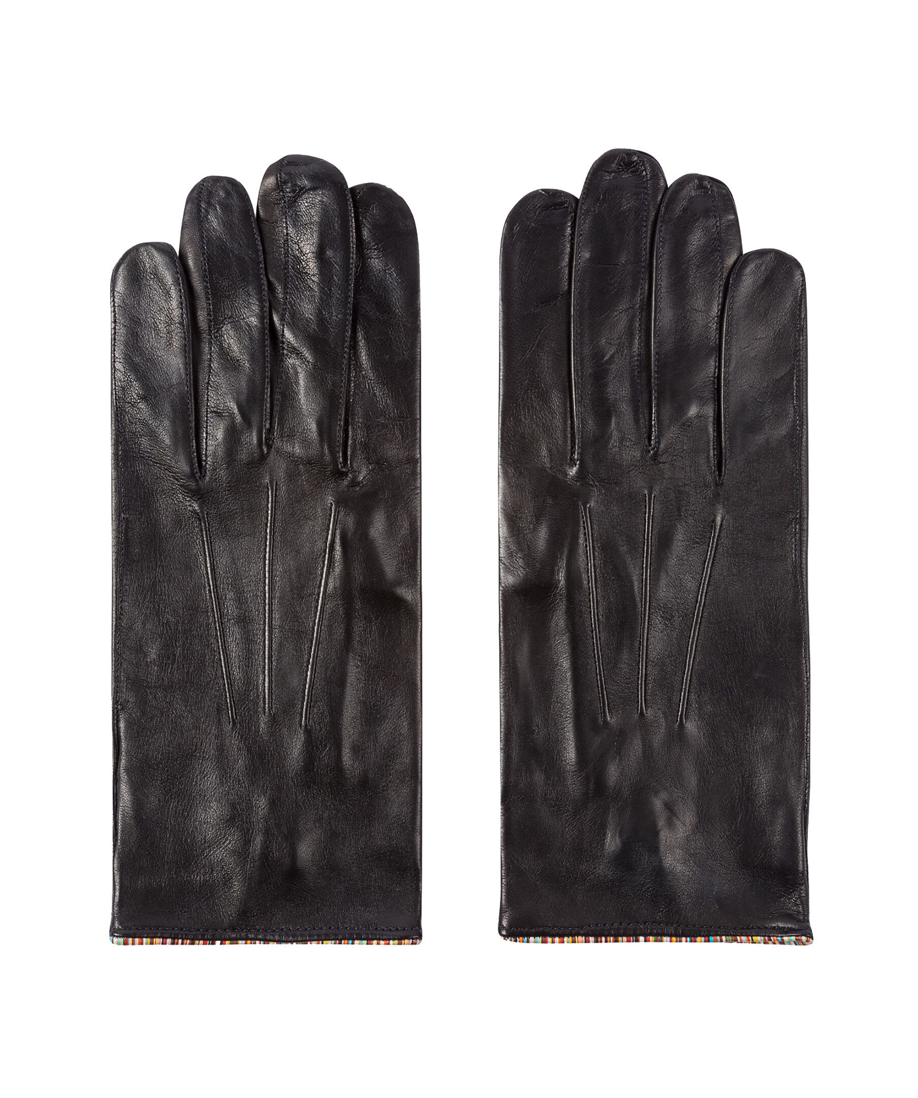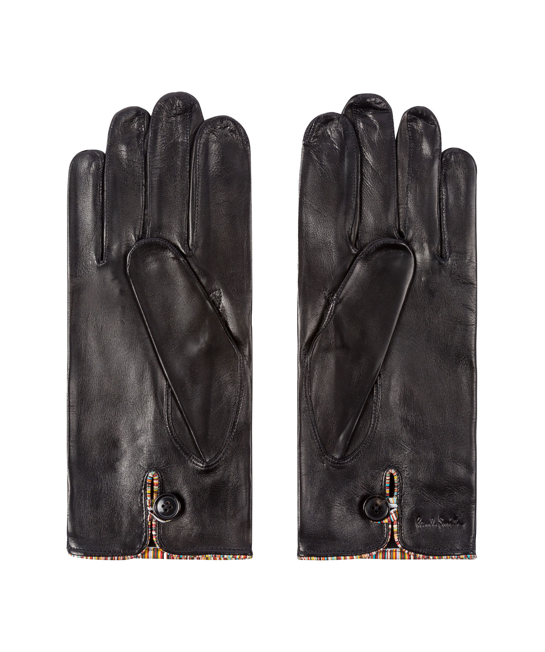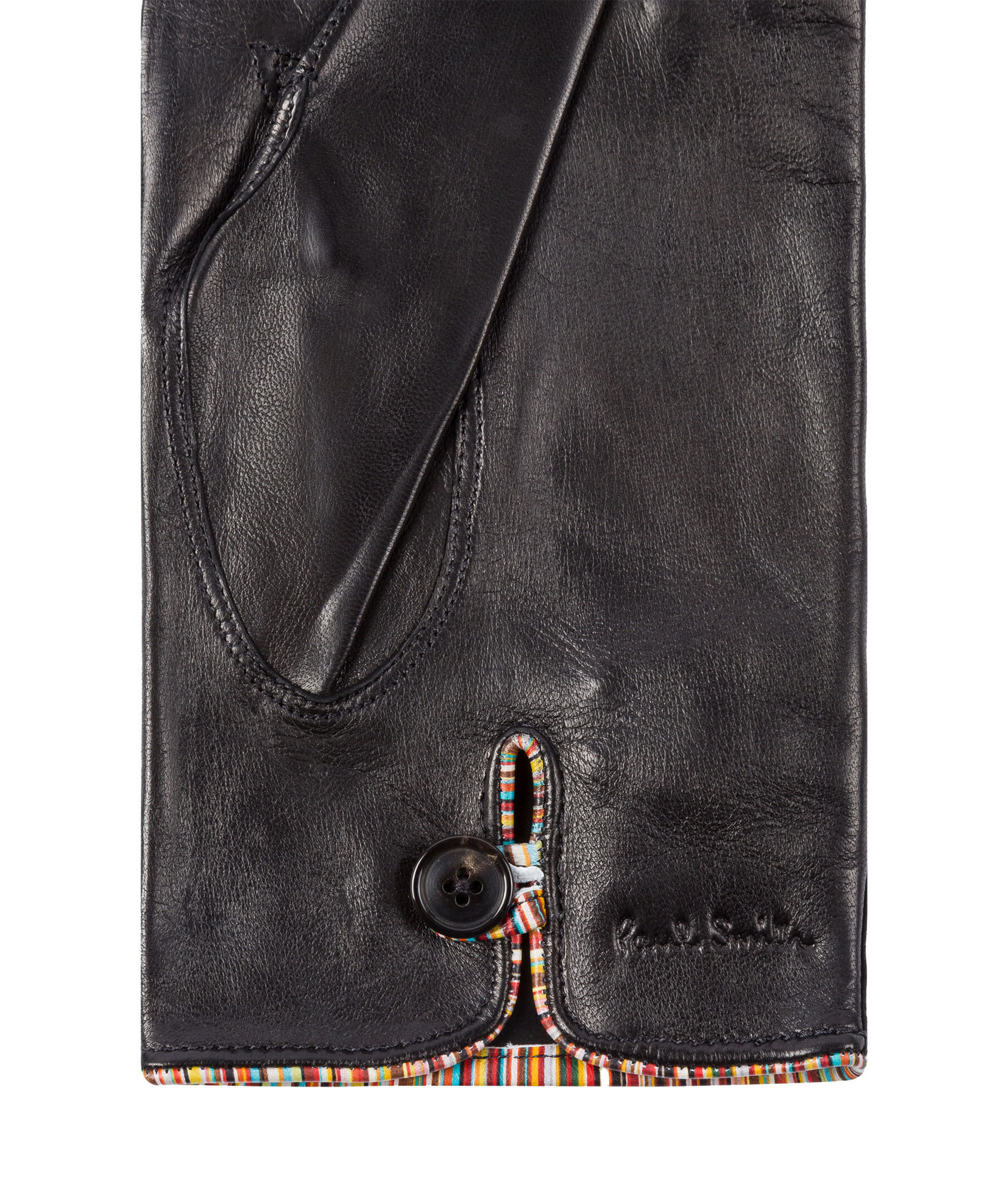 Svarta ofodrade handskar från PS Paul Smith. Vantarna har Paul Smiths subtila signaturränder, tonala sömmar. Spänns med en liten svart knapp. Tillverkad av 100% lammskinn.