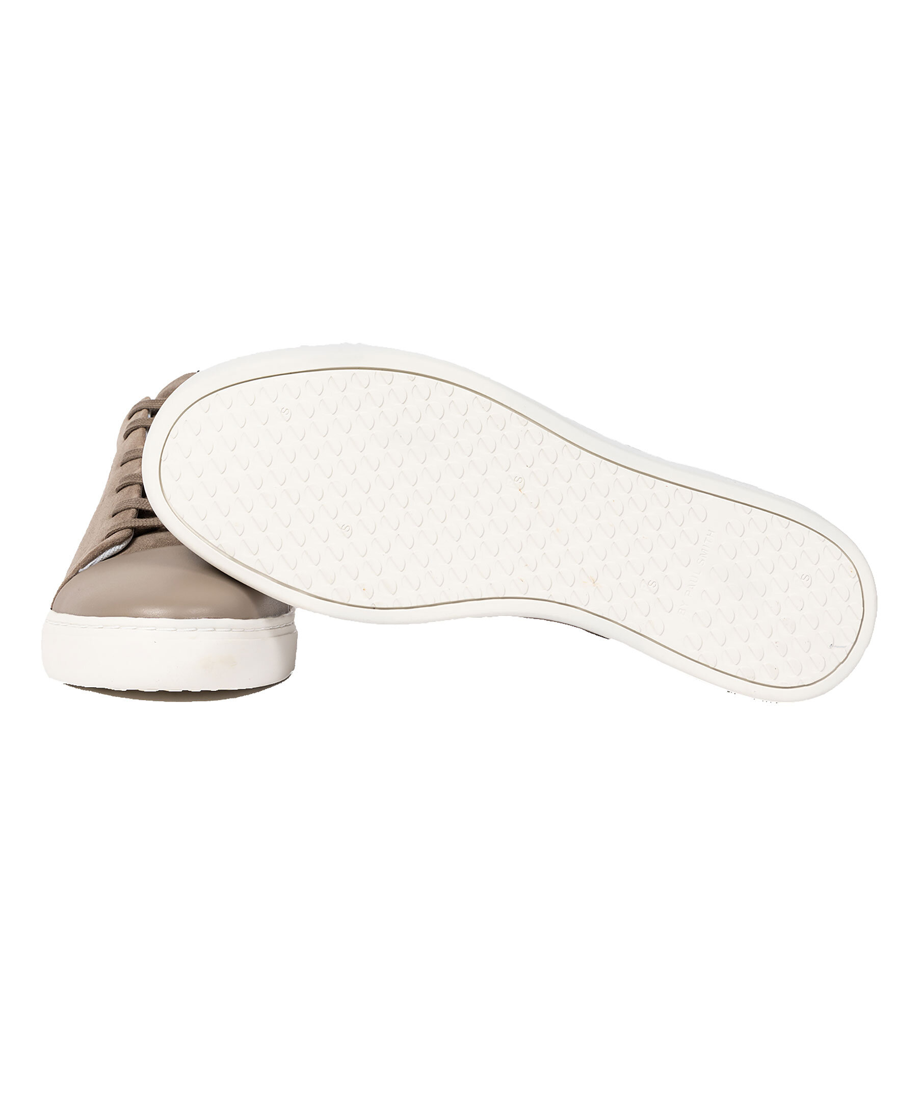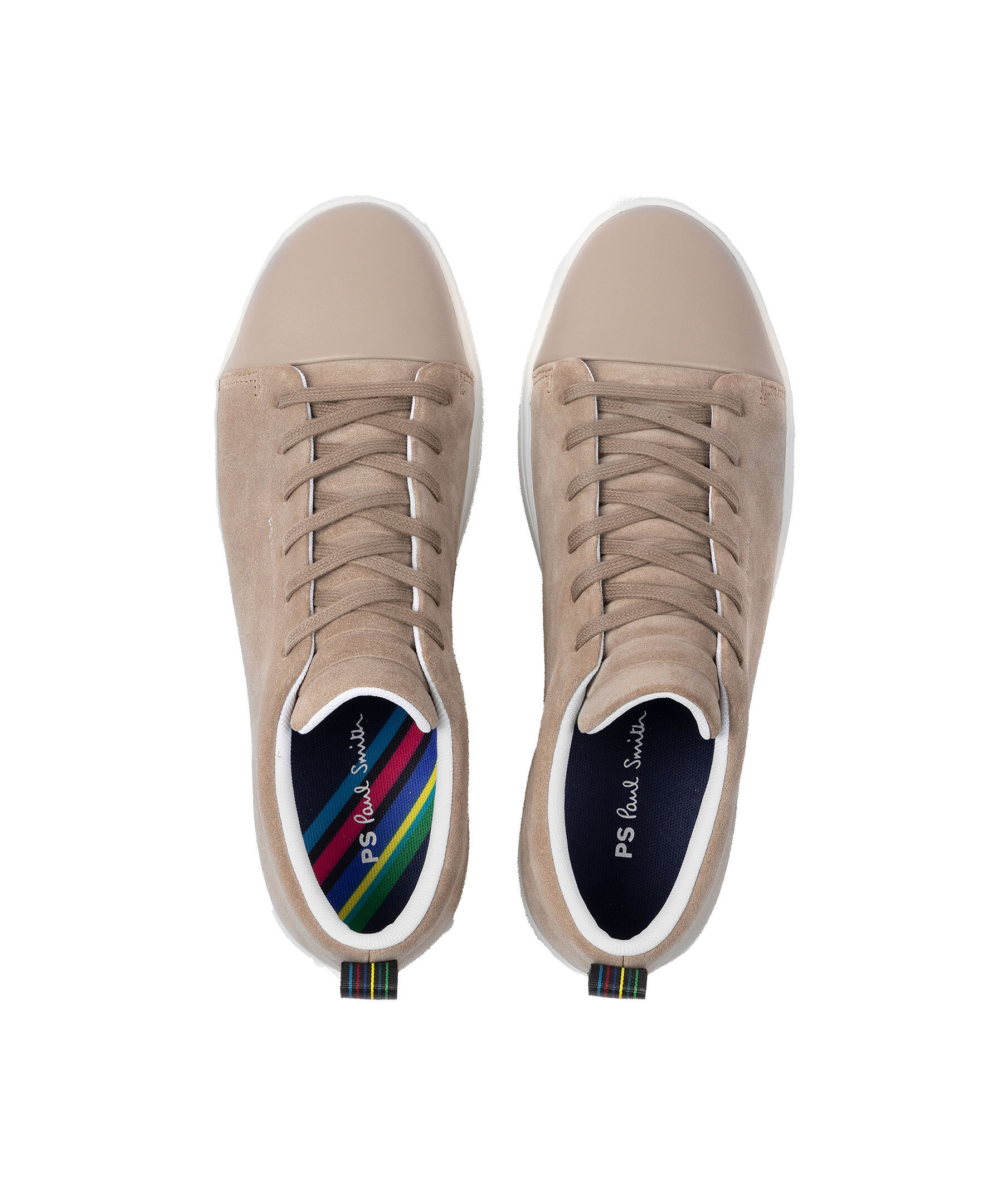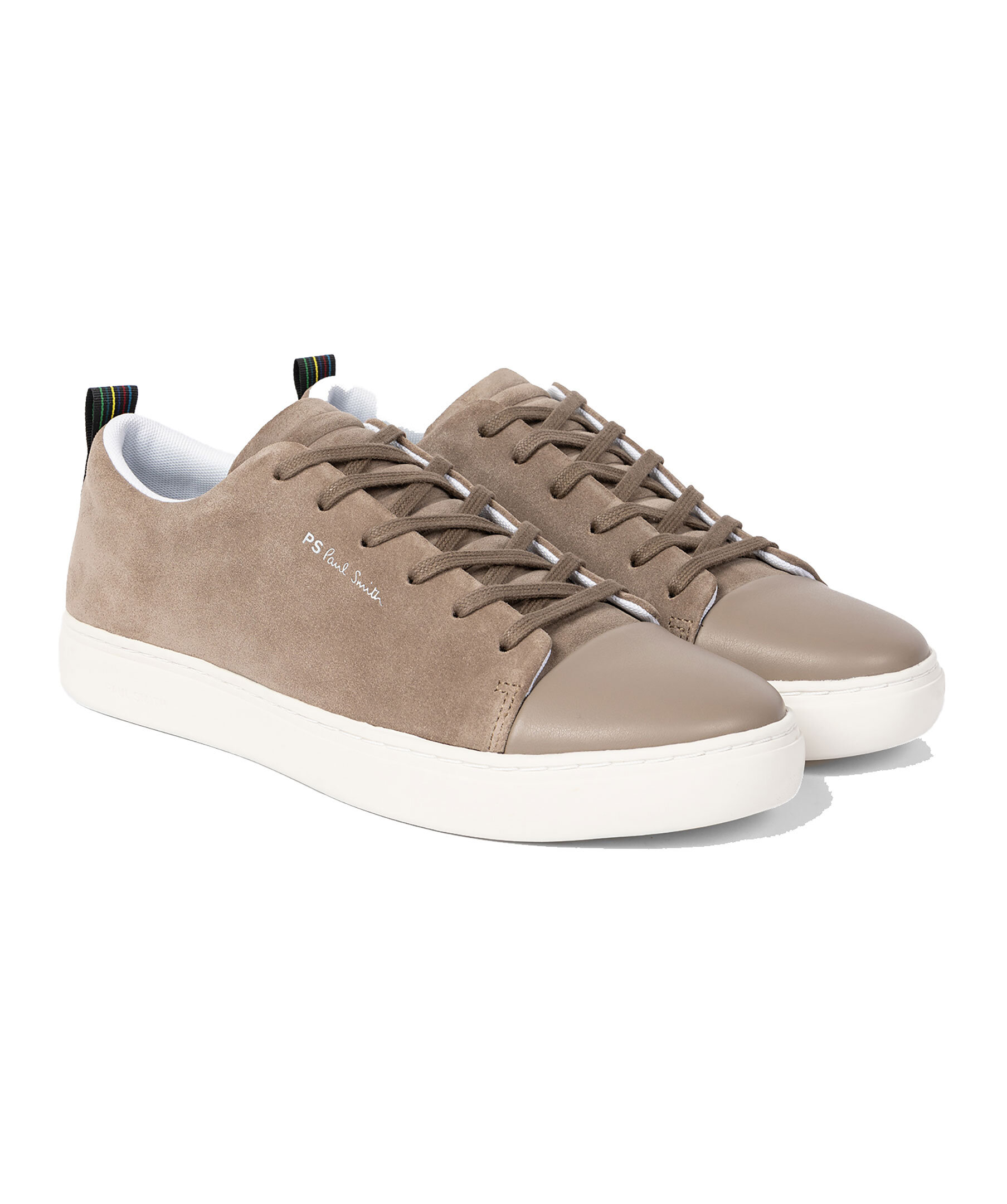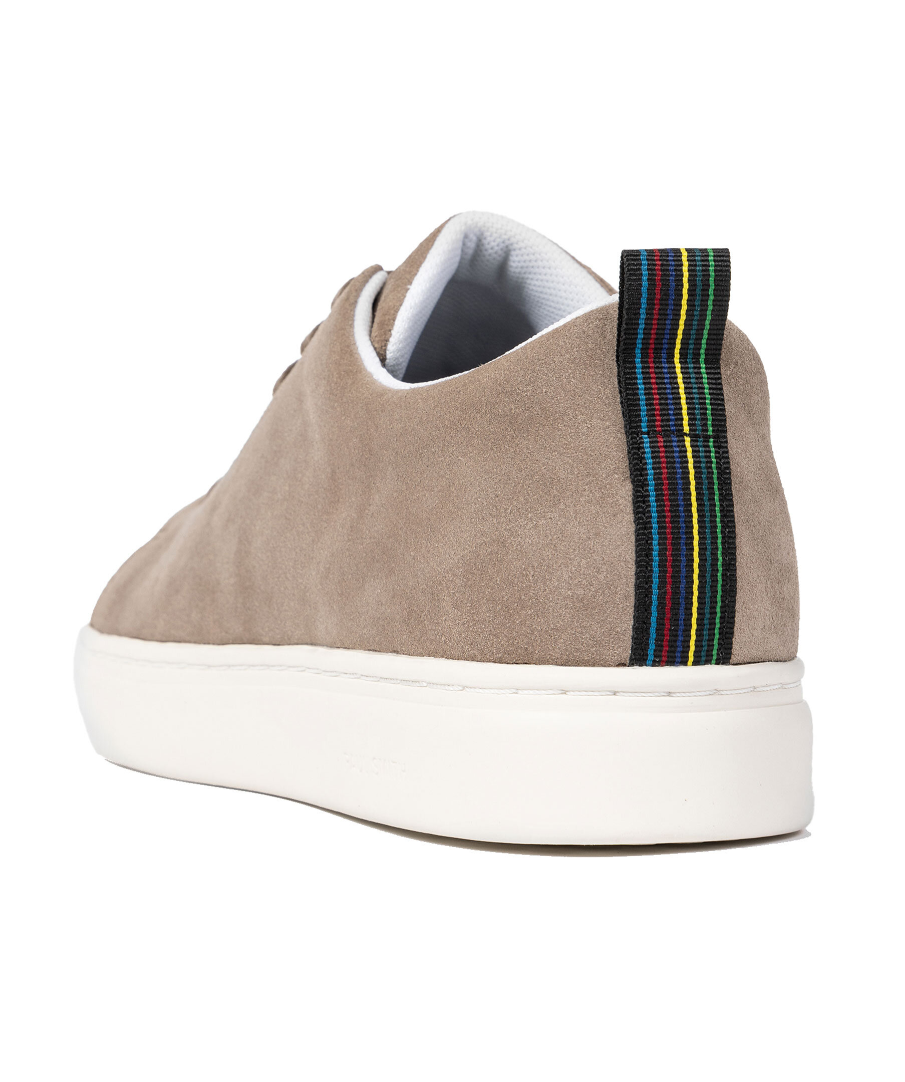 Greige sneakers i mocka från PS Paul Smith. Skorna har en flerfärgad tygögla baktill på hälen för enklare påtagning. Vit sula. Logotyp på utsidan.