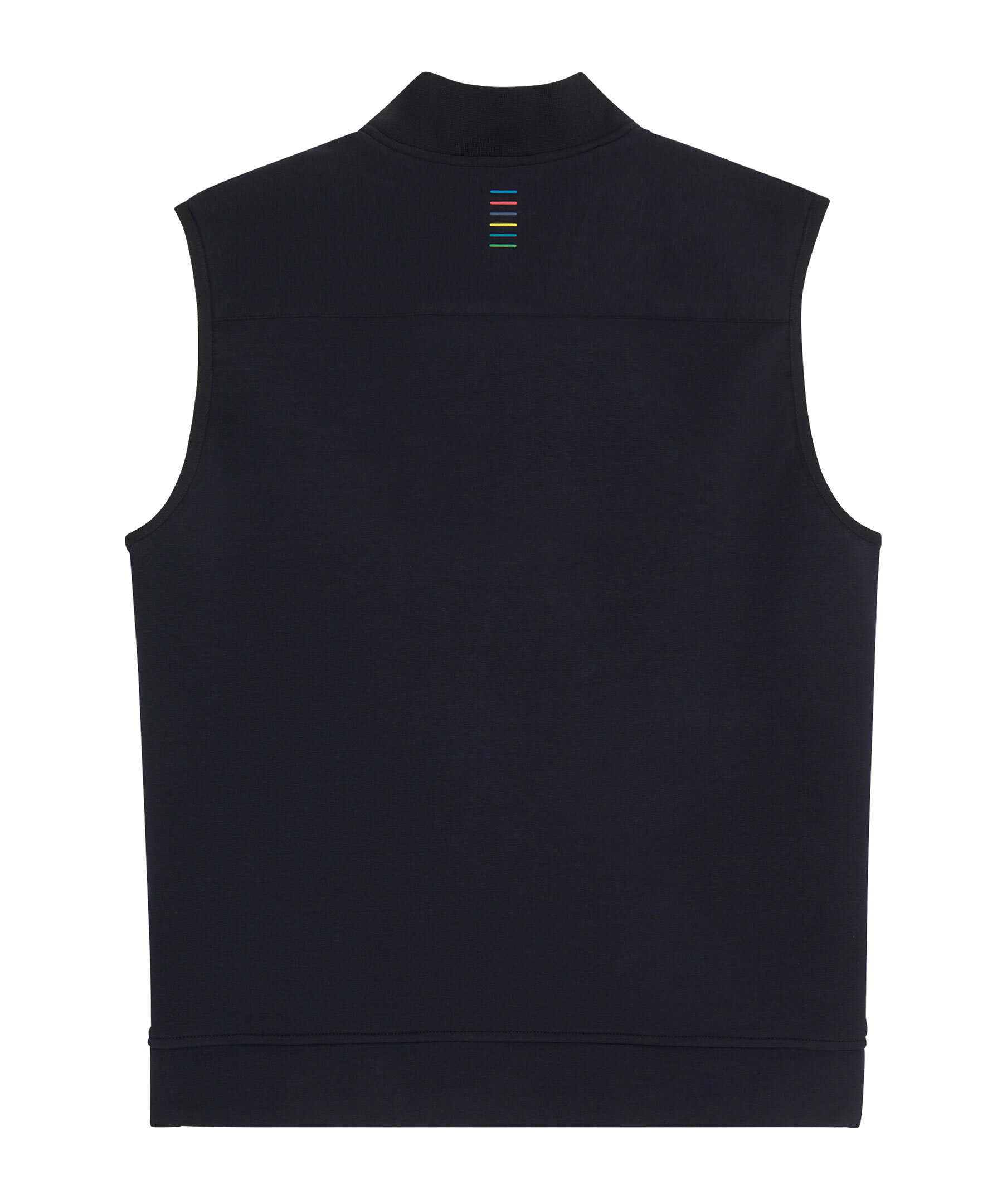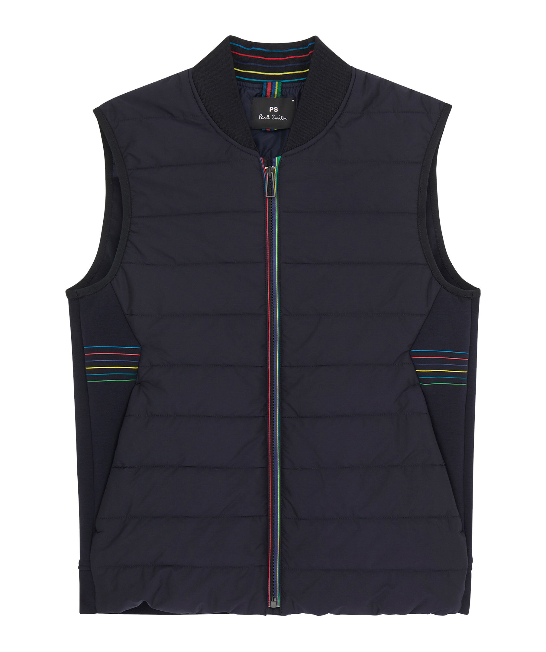 Marinblå väst med polyester fyllning på framsidan för extra värme från PS Paul Smith. Tonstickad krage och baksida i jerseytyg. Dragkedja fram med färgglada ränder och tunna färgglada ränder i sidorna. Två framfickor med dold dragkedja och en innerficka.