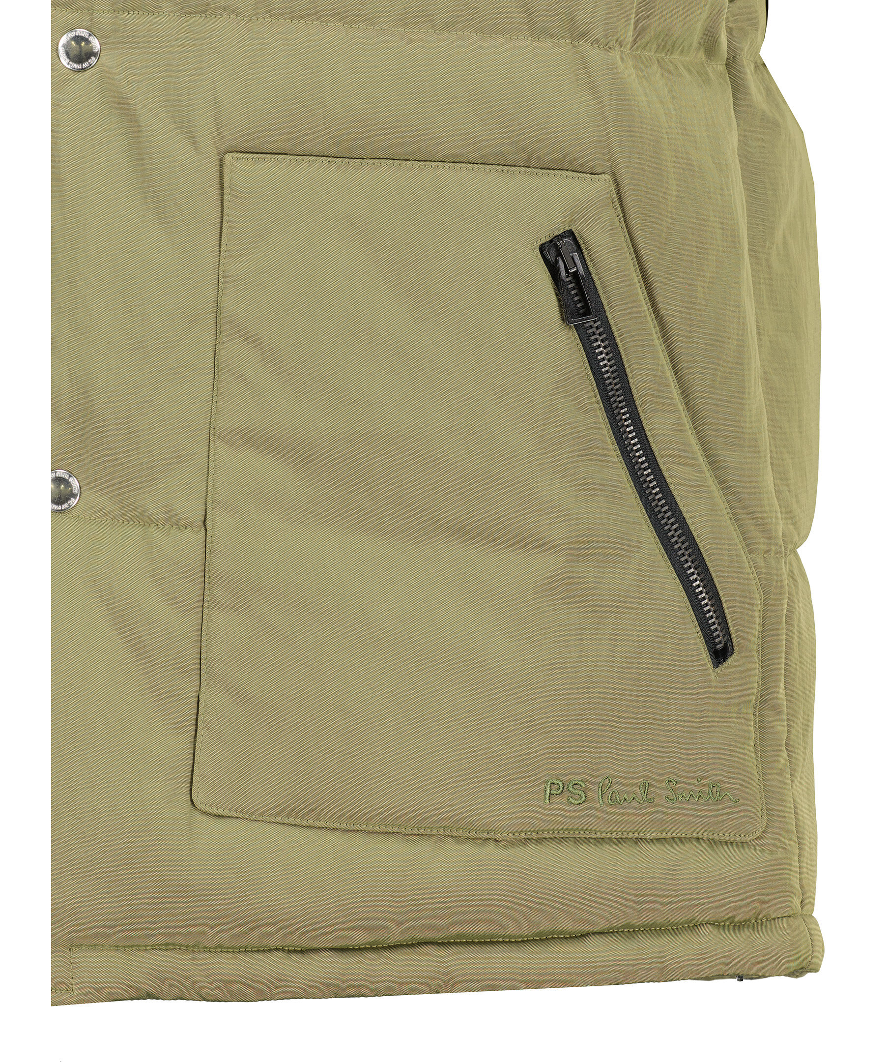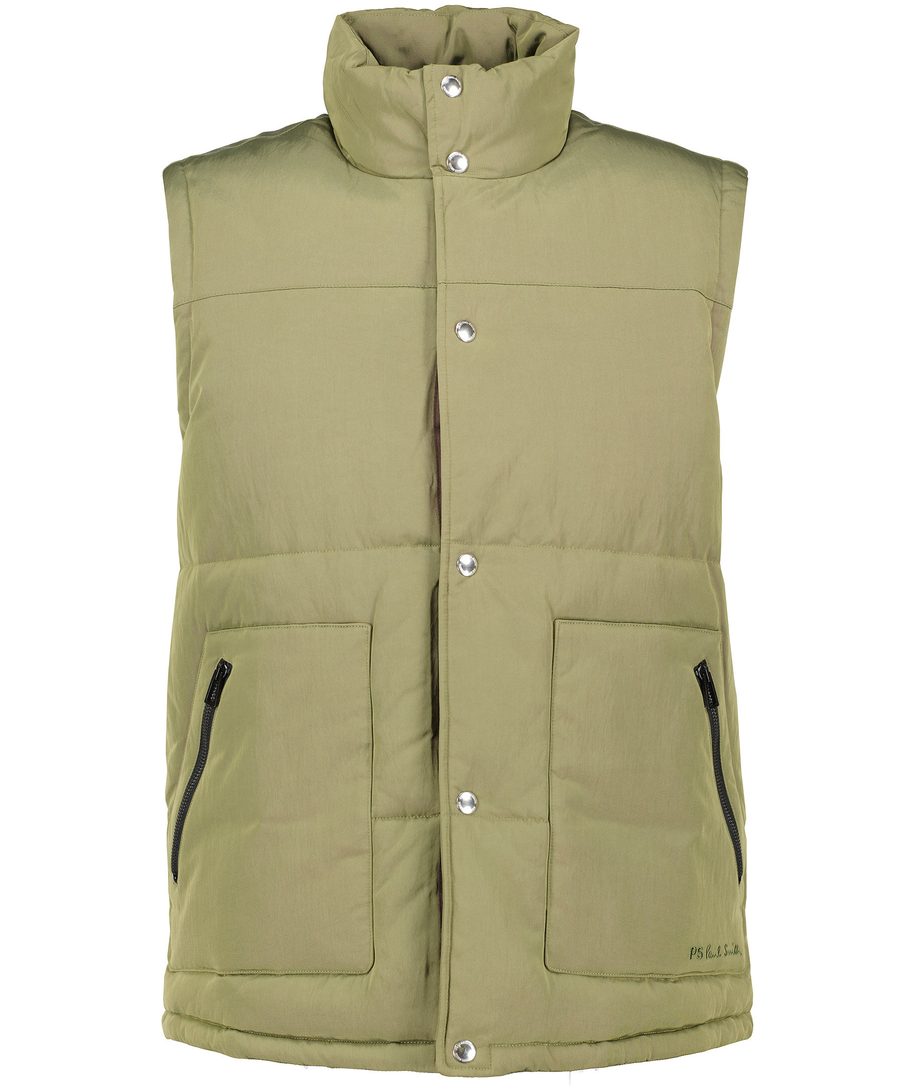 Grön vadderad väst från PS Paul Smith. Västen stängs framtill med tryckknappar. Två snedställda fickor som stängs med dragkedja. Dragsko vid plaggslut. Broderad logotyp nedtill vid vänster ficka.