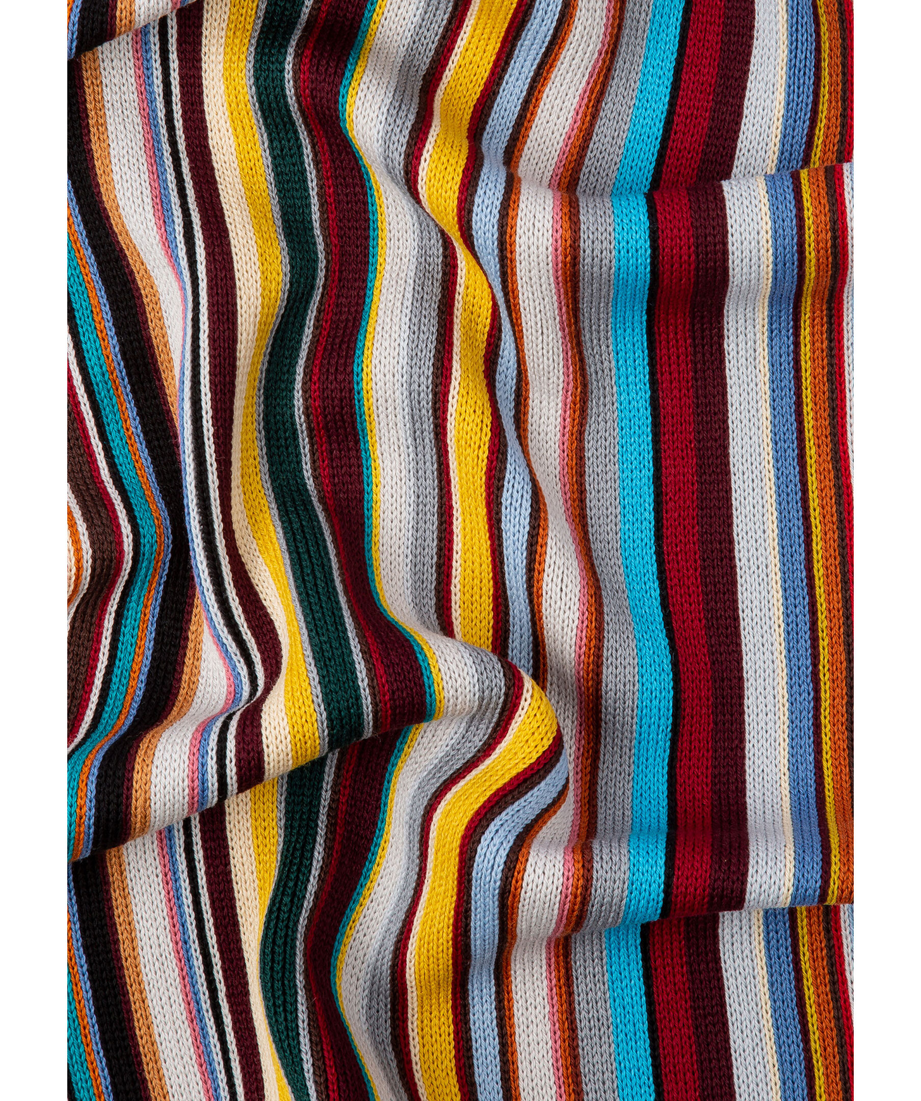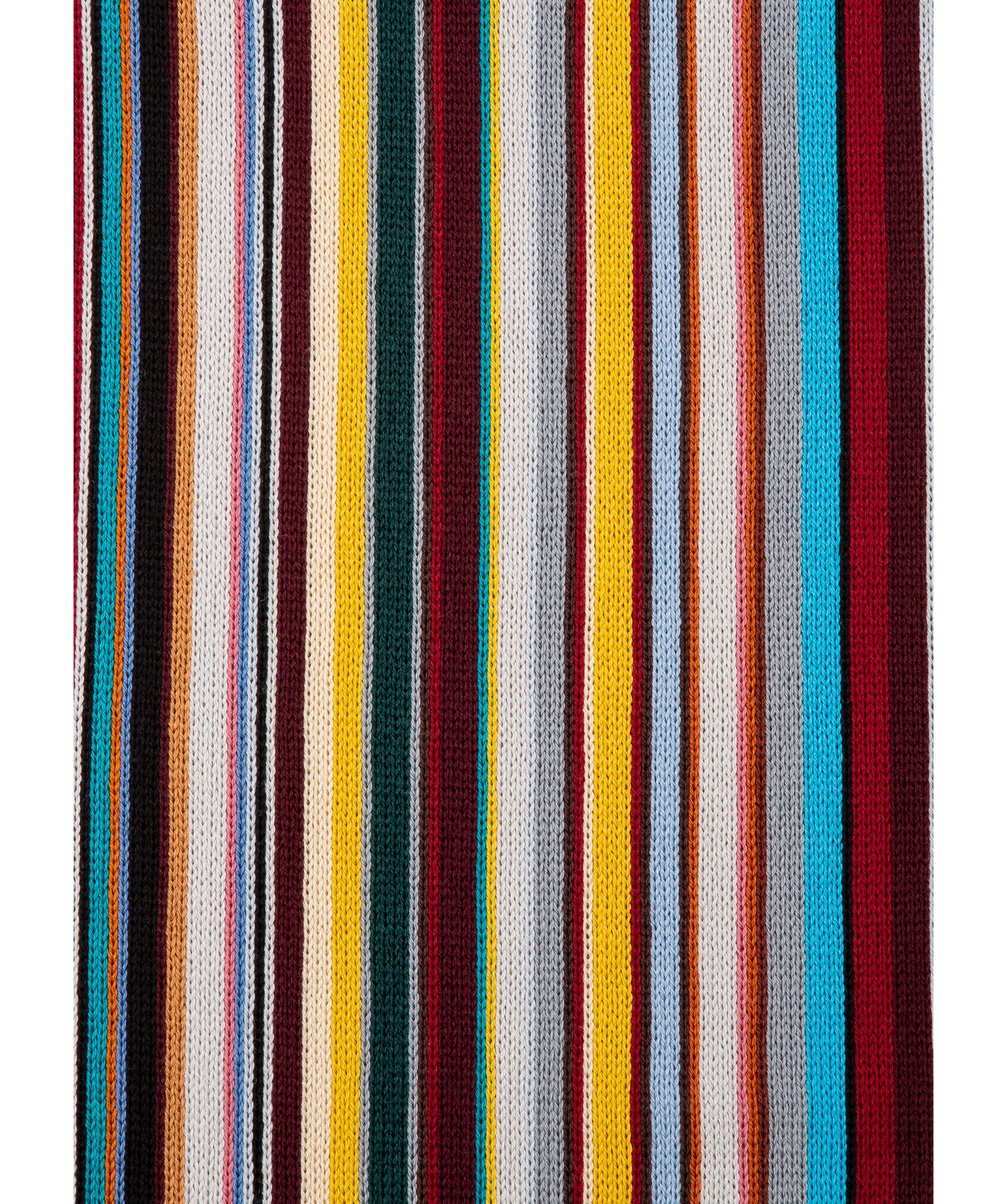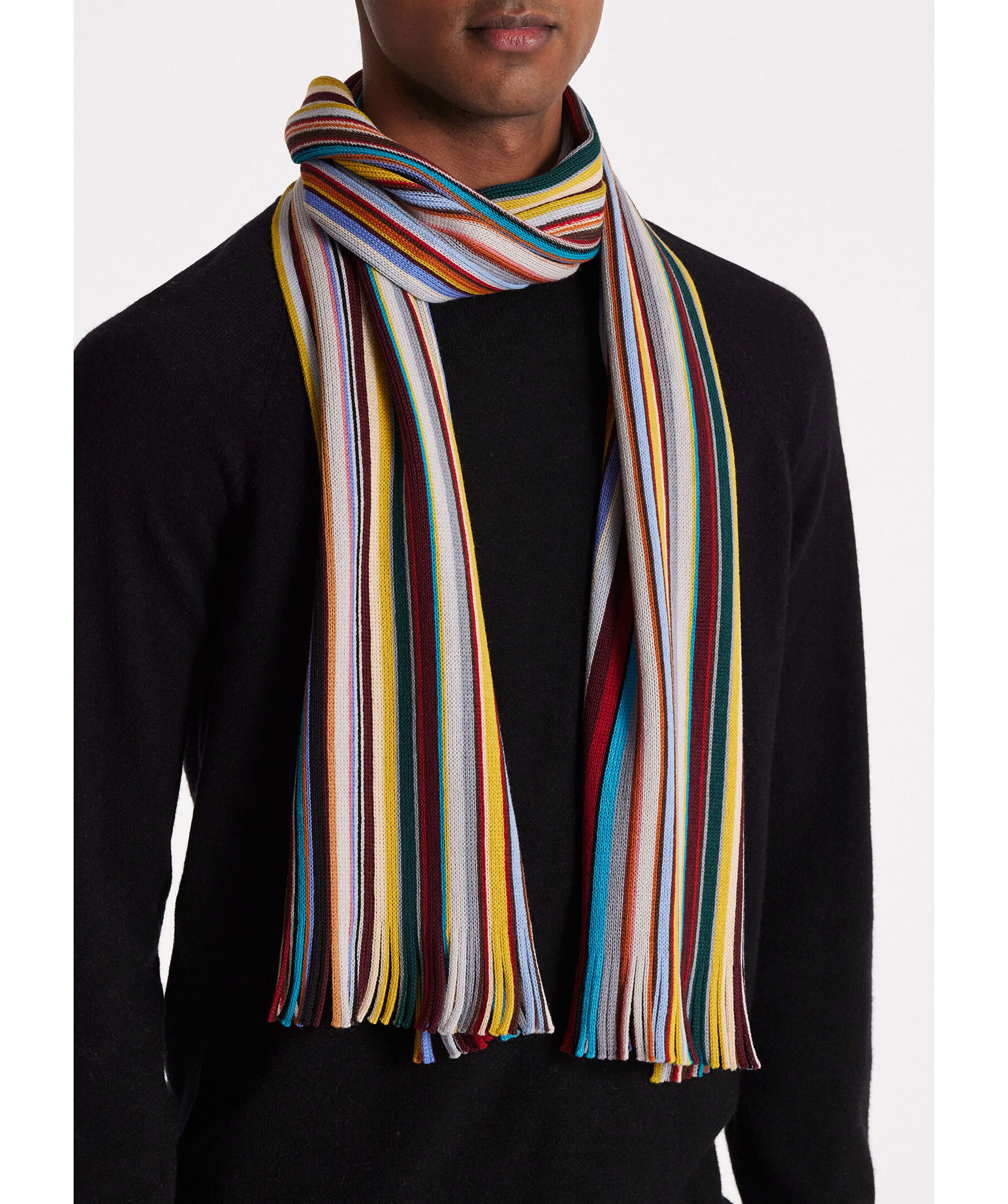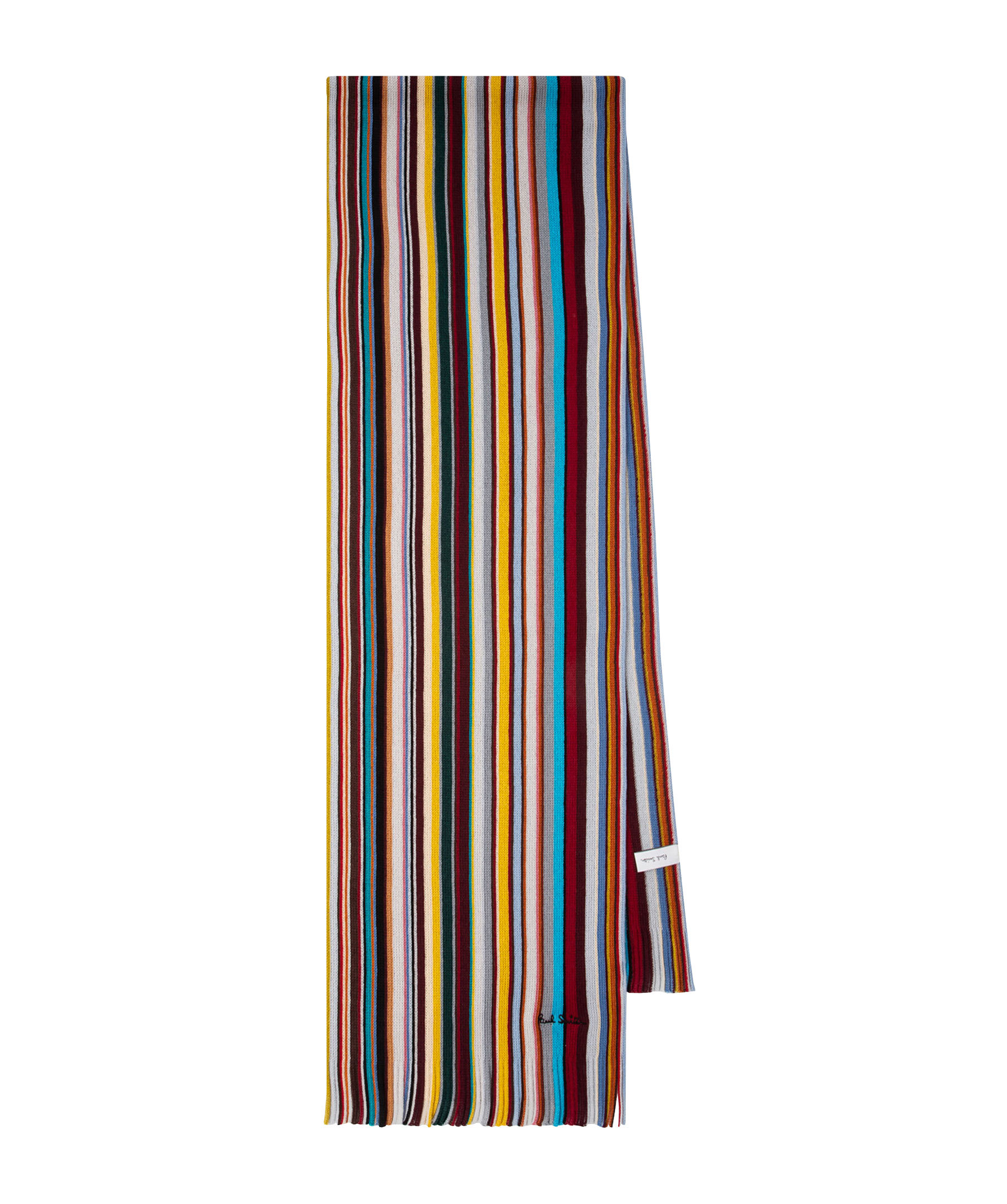 Randig, stickad halsduk från PS Paul Smith. Tillverkad av mjuk ull och har det klassiska "Signature Stripe"-mönstret genomgående med en broderad Paul Smith-signatur och fransar i kortändarna. Mått: 26 x 180 cm.