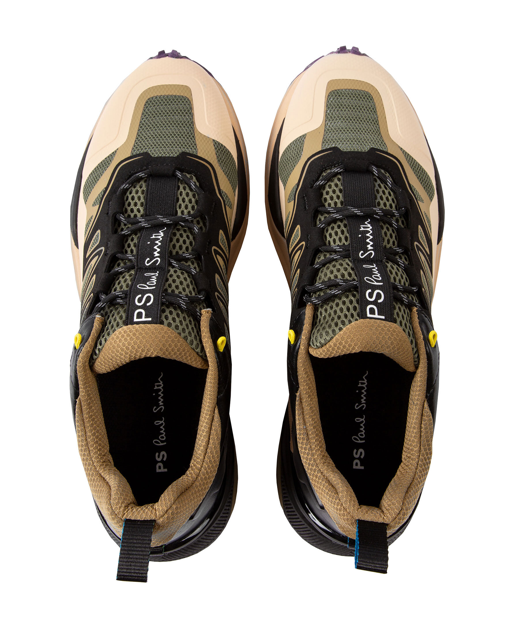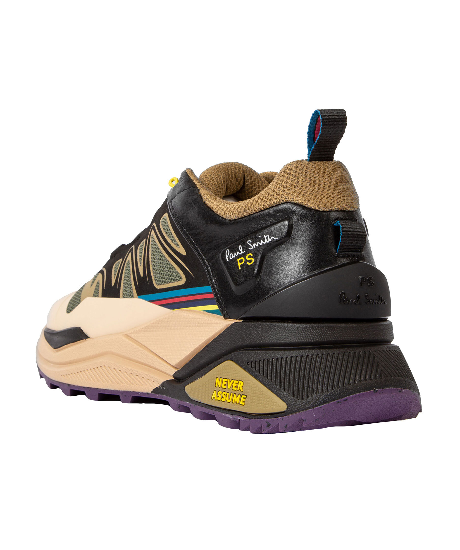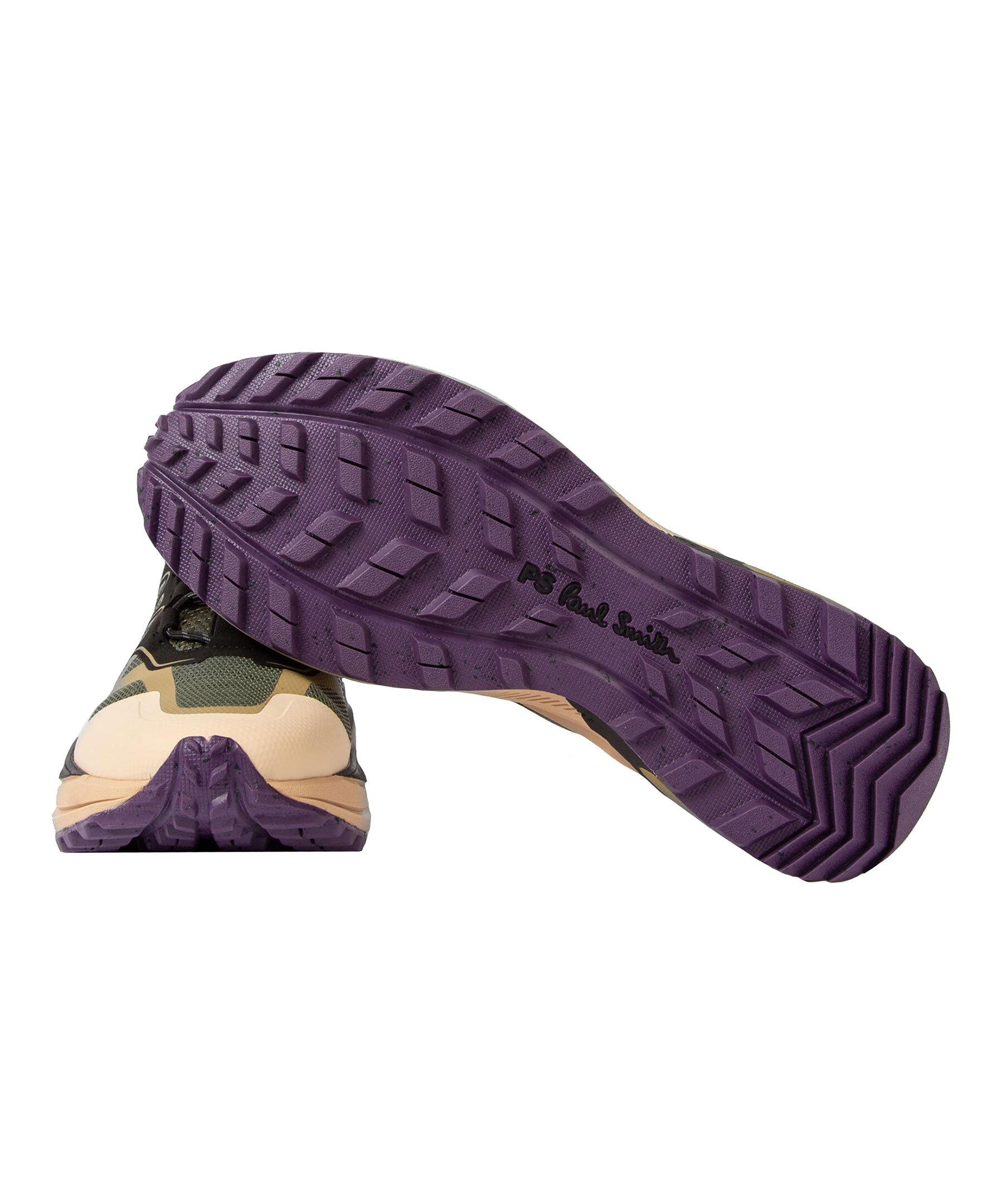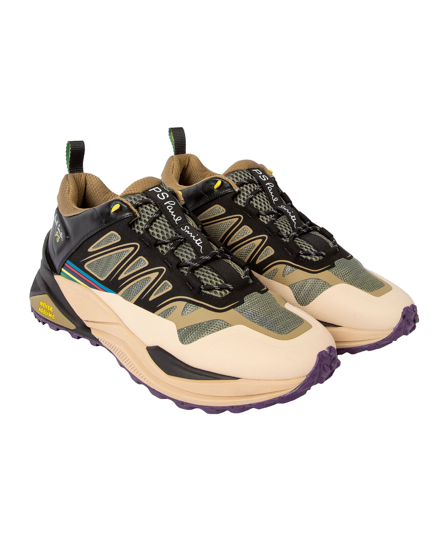 Flerfärgade sneakers från PS Paul Smith. Tillverkade av lätt mesh med läderkanter och har en yttersula i gummi. Stilen på skon är inspirerade från tekniska trailrunning sneakers. "Sports Stripe"-detaljer på sidorna, detaljer i beige och svart läder. Lila undersulor med ett grovt mönster. Logotyp på sidorna och på plösen.