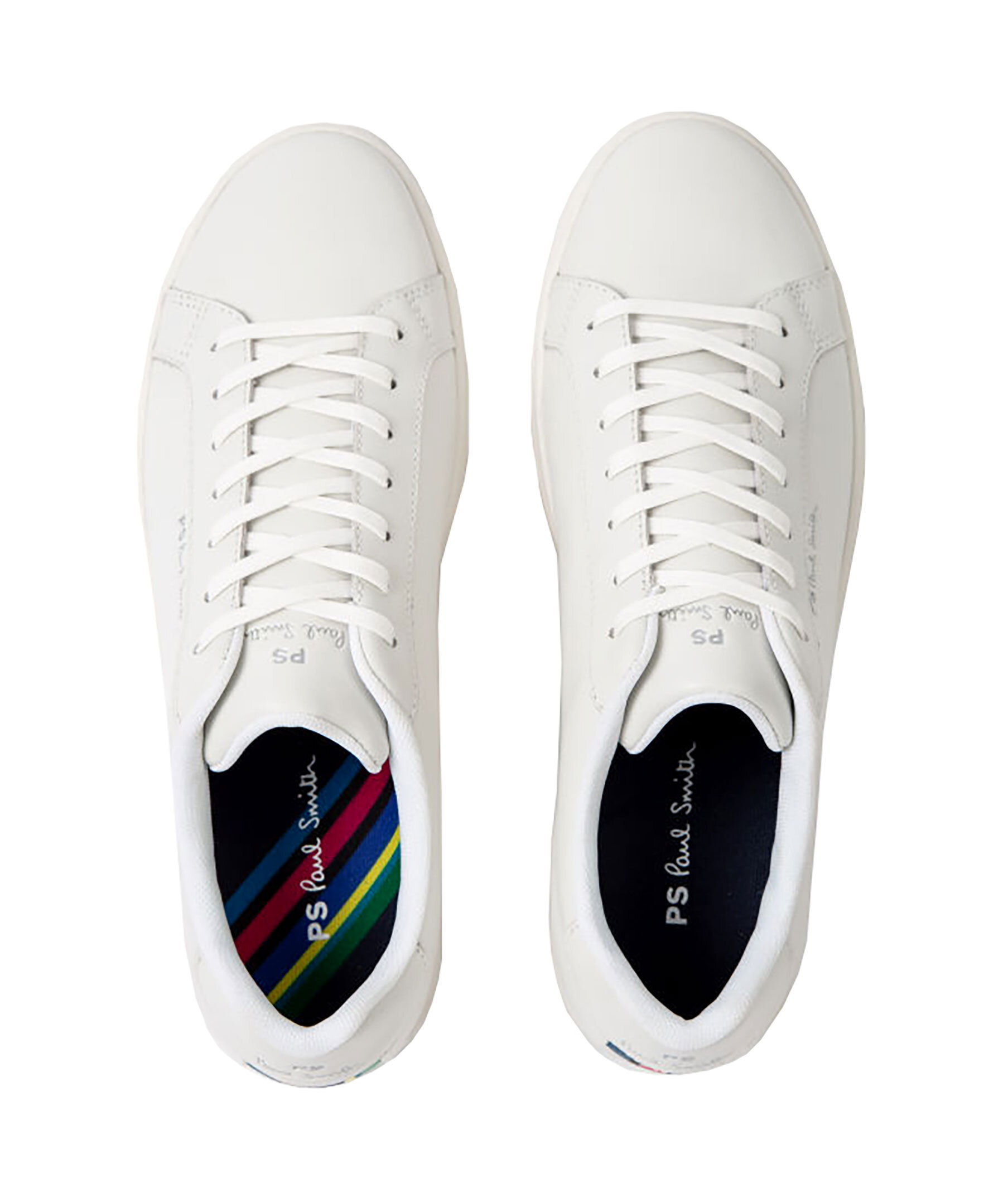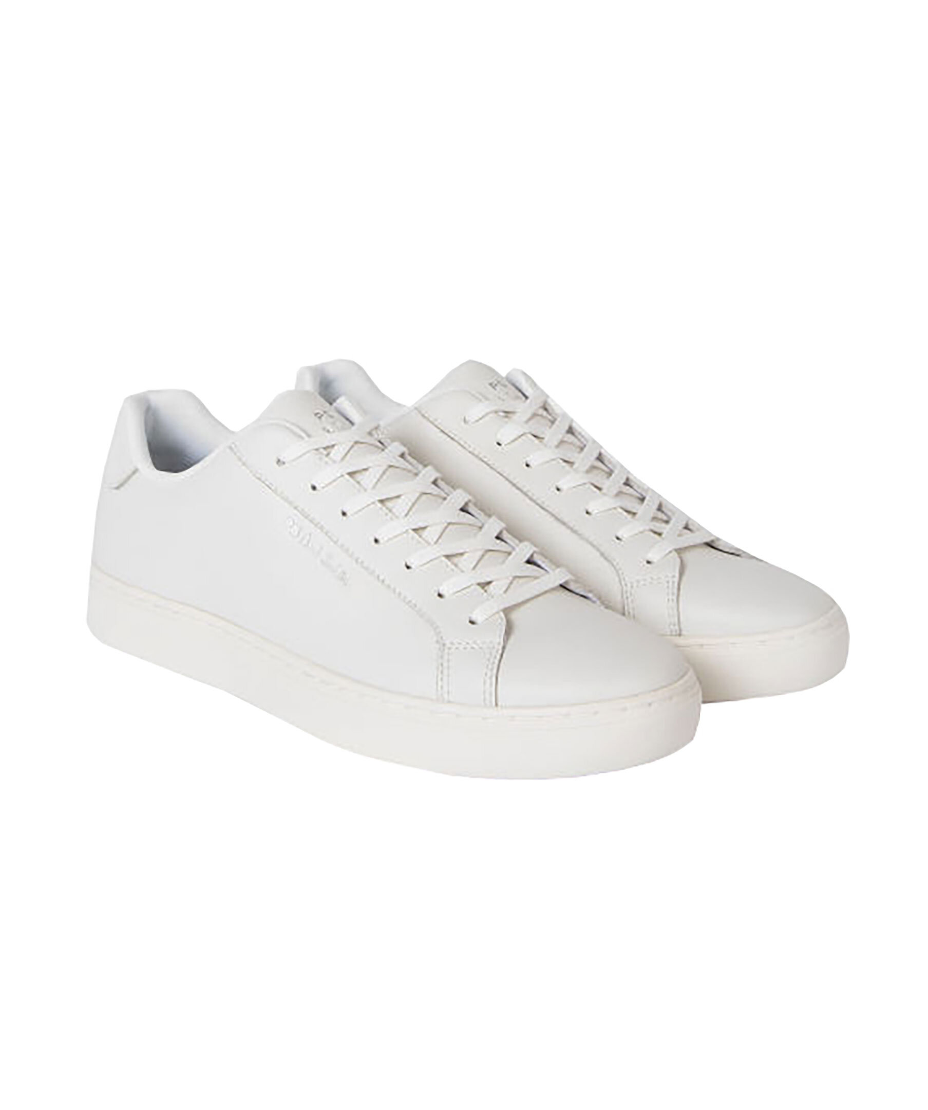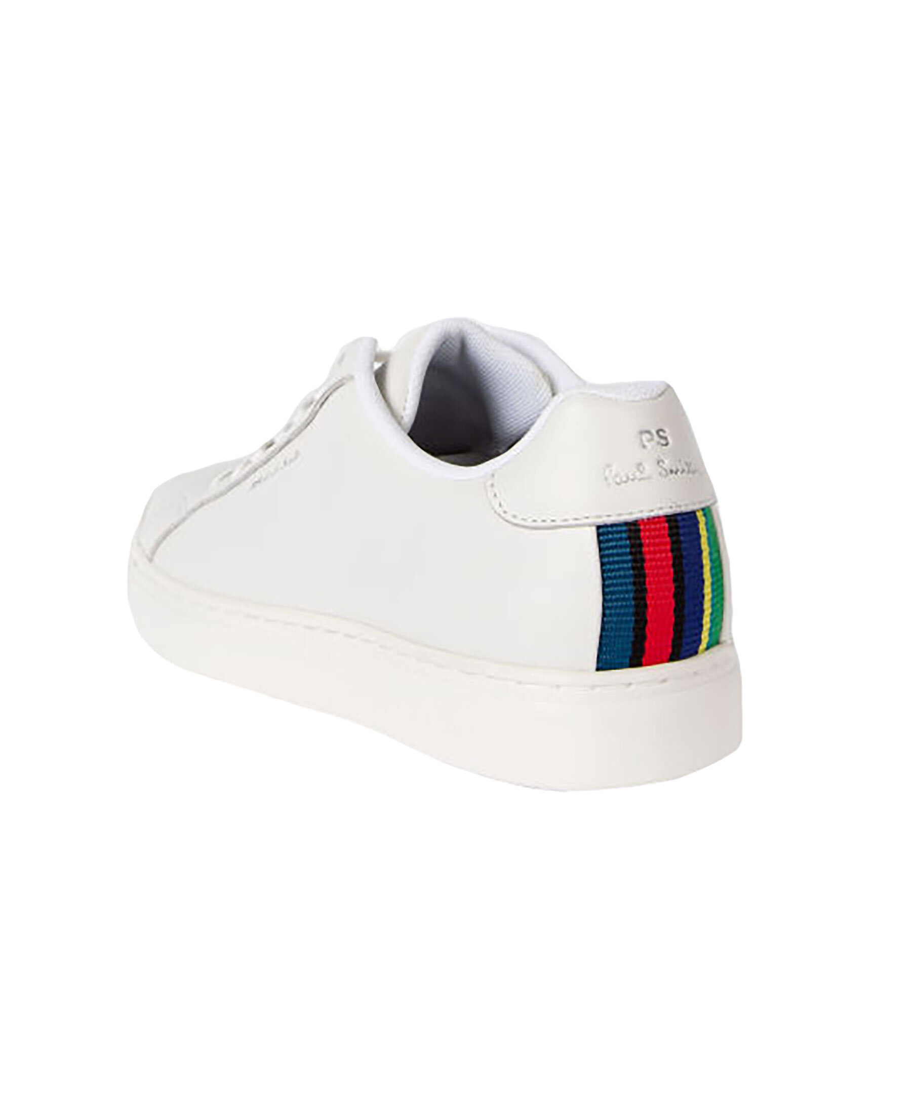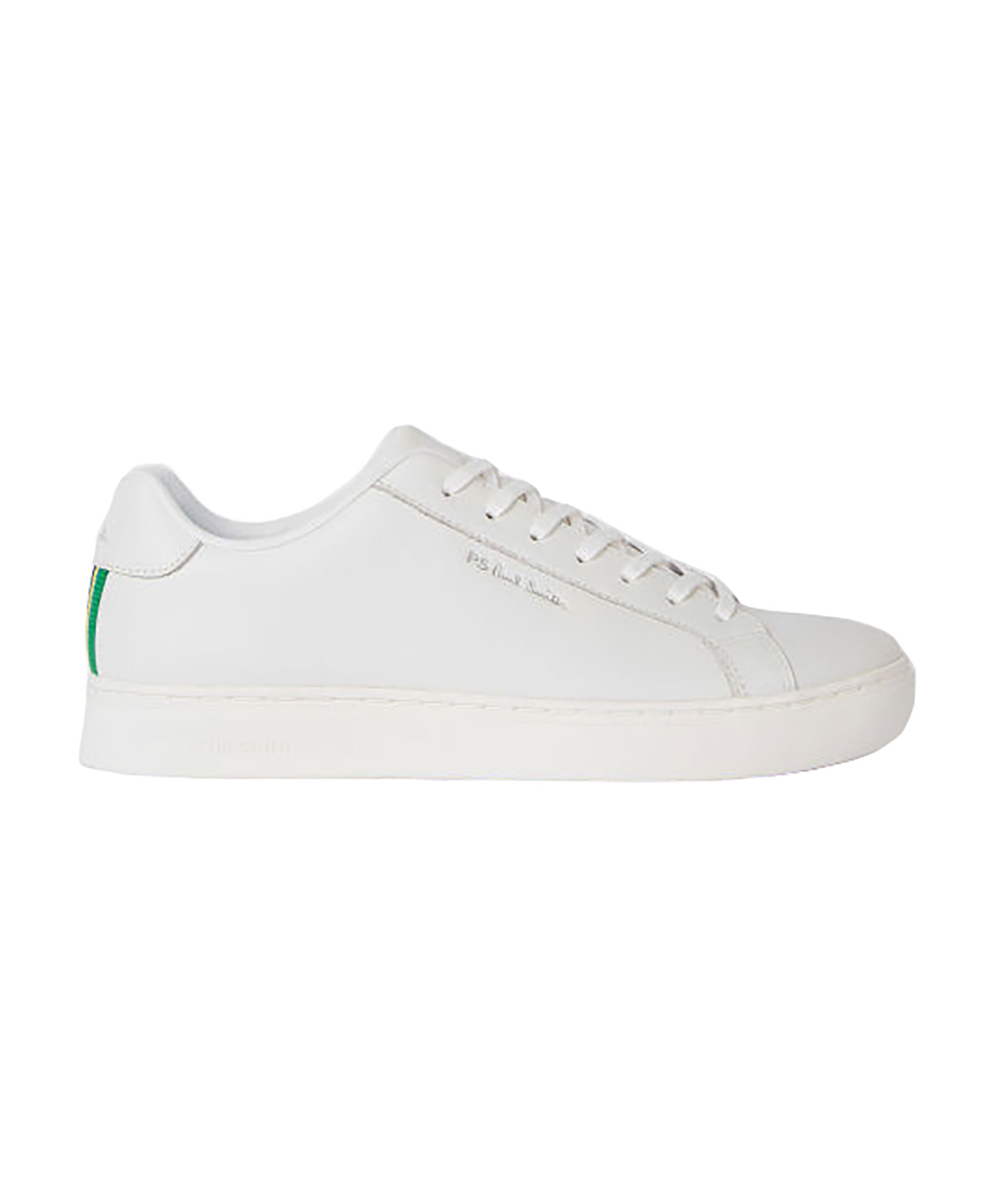 Vita sneakers i läder från PS. Paul Smith. Flerfärgad tygpatch på hälen, vita skosnören samt diskret logotyp framtill och på sidan.