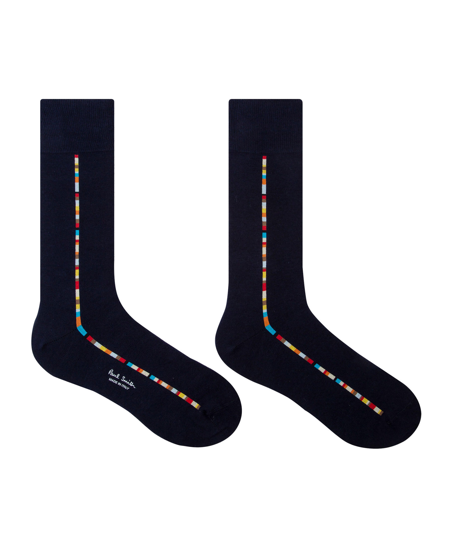 Mörkblåa herrstrumpor med mudd upptill från PS Paul Smith. Tunn, färgglad rand från upp till botten och tunn, tryckt logotyp under foten. Tillverkade i bomullsblandning.