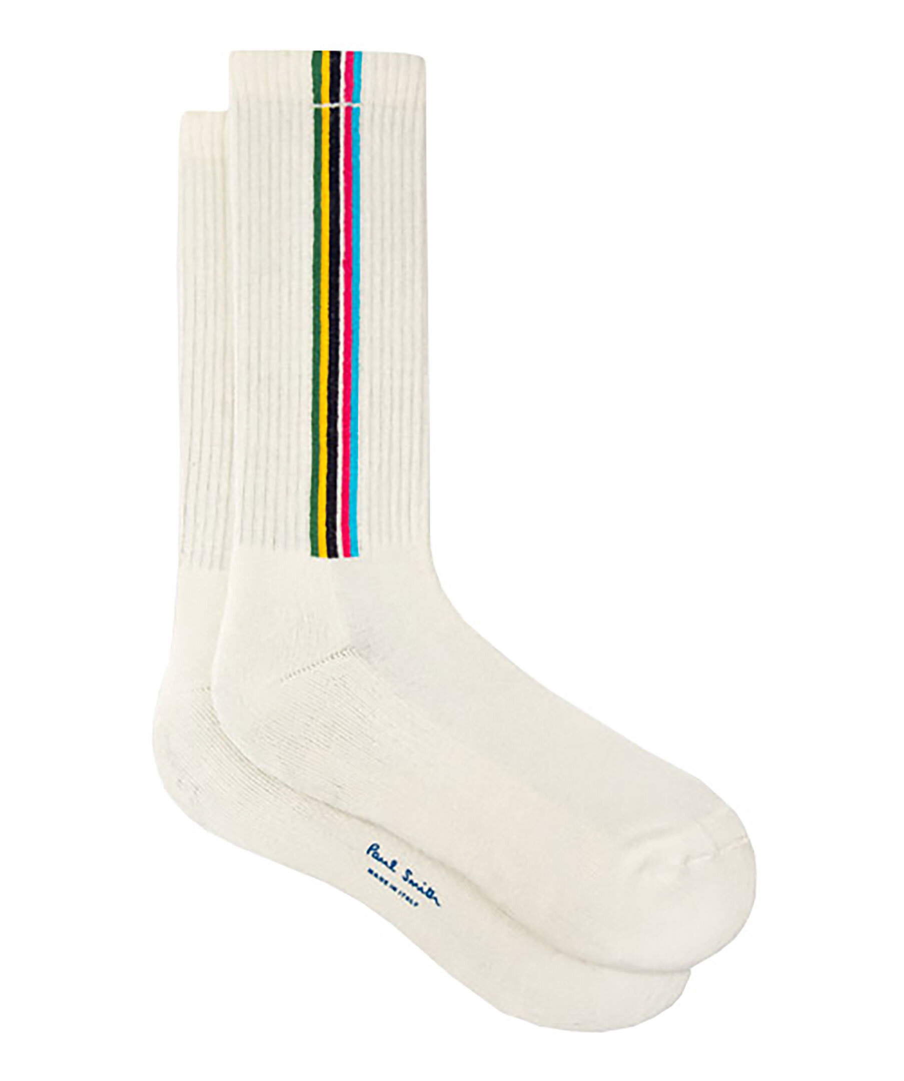Vita herrstrumpor med ribbad stickning upptill från PS Paul Smith. Lodräta, färgglada ränder upptill, tryckt logotyp under foten. Tillverkade i bomullsblandning.