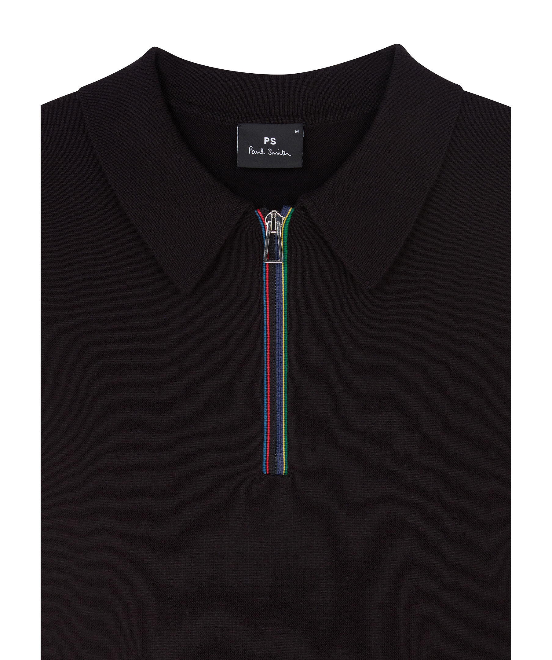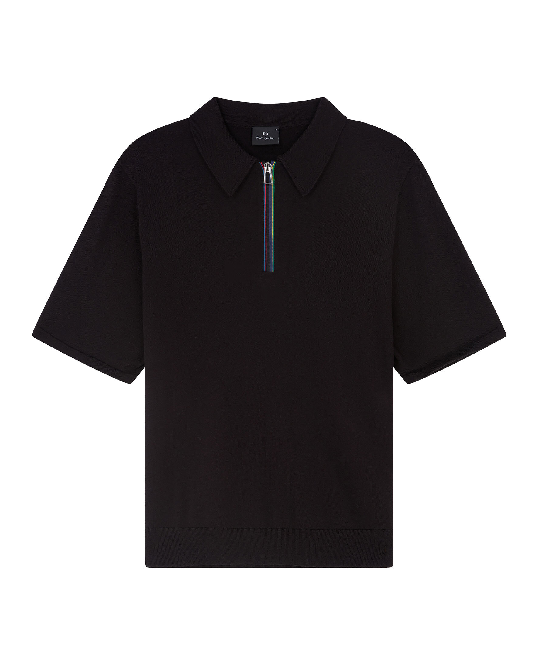 Svart, finstickad pikétröja från PS Paul Smith. Pikén har multifärgad halv dragkedja framtill, korta ärmar och ribbstickad plaggslut. Tillverkad i ekologisk bomull.