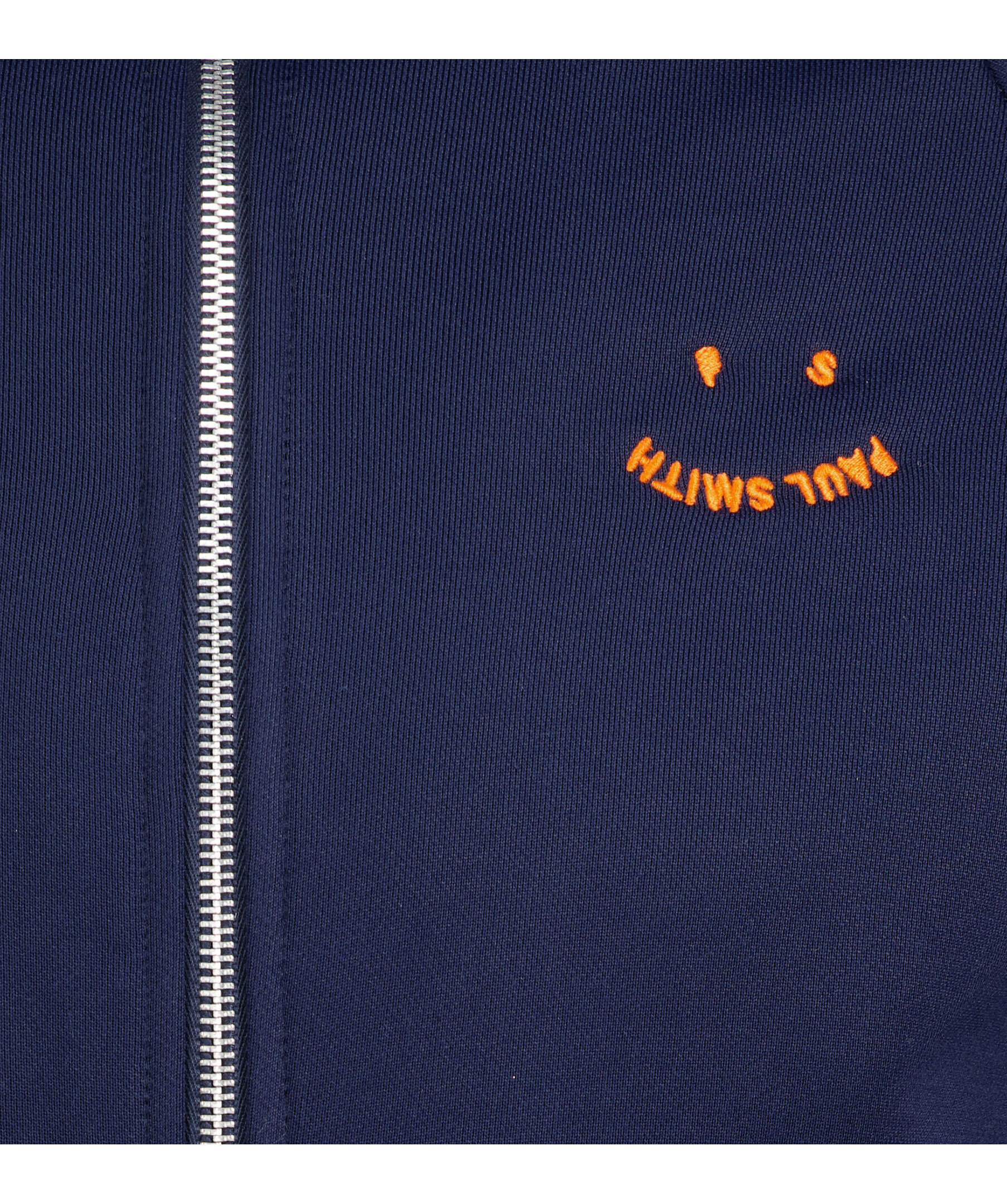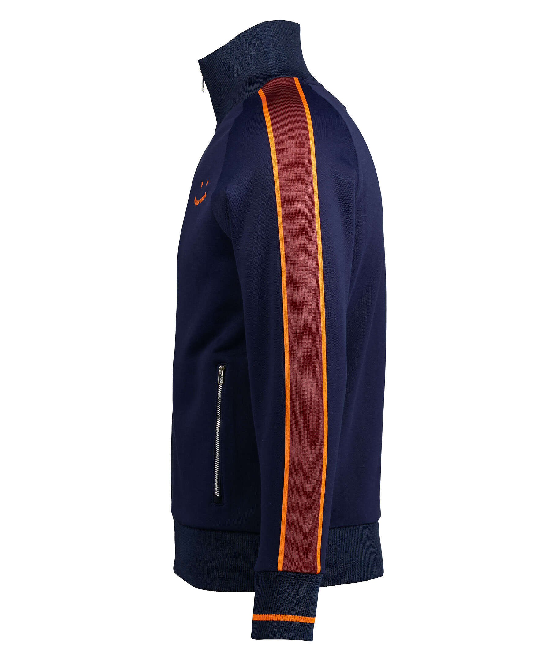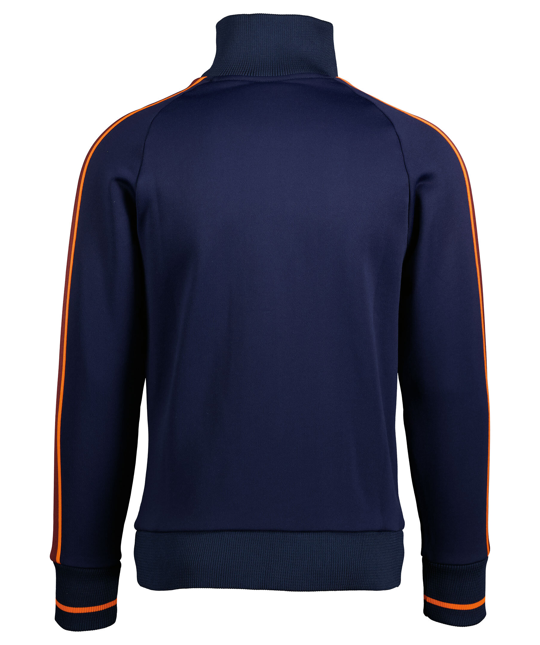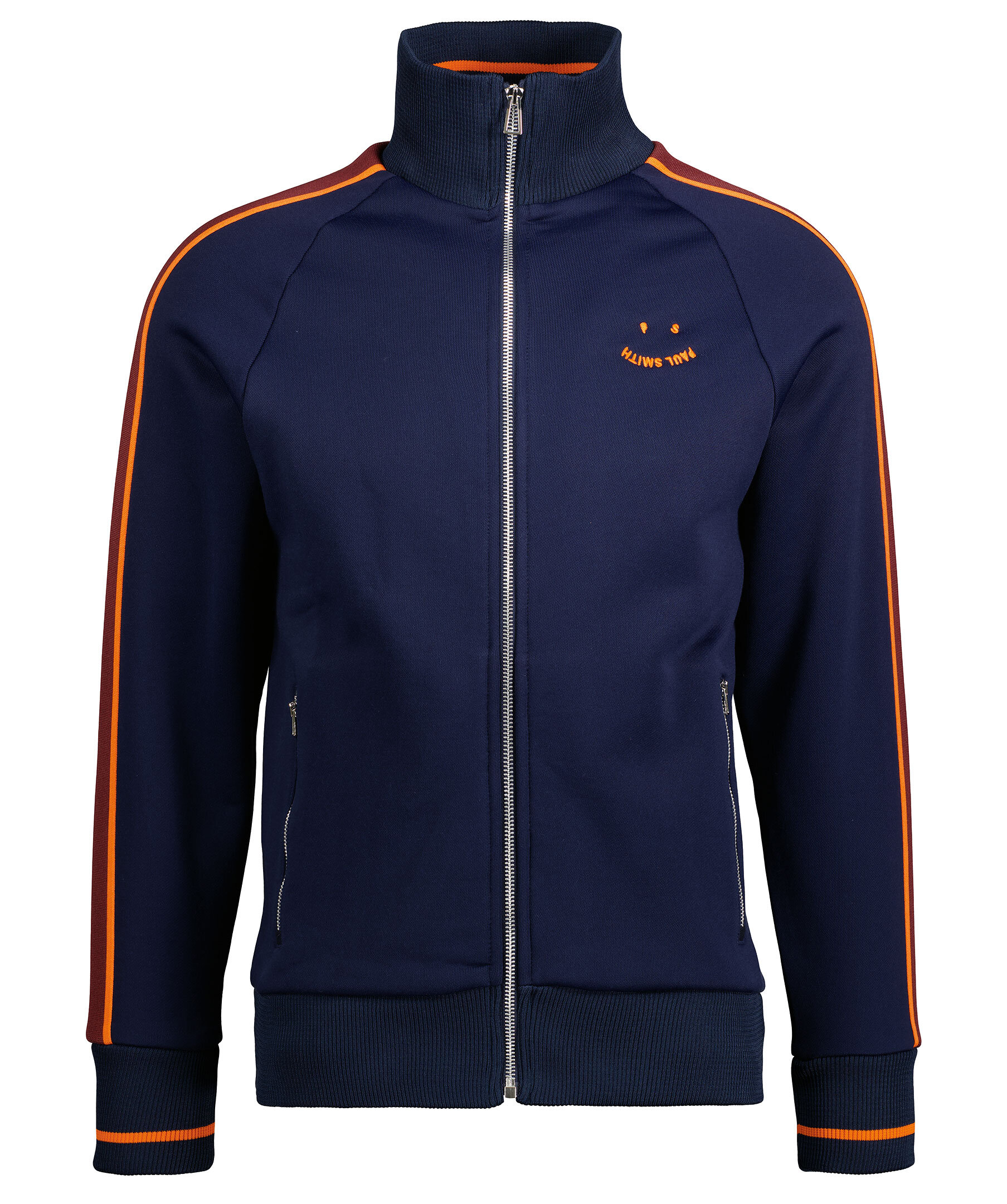 Marinblå tracksuitjacka med hög krage från PS Paul Smith. Tröjan stängs framtill med dragkedja, har två fickor framtill med dragkedja. Broderad logotyp på vänster bröst. Ribbstickade muddar vid kragen, ärm- och plaggslut. Randiga revärer längst ärmarna i vinrött och neonroange samt neonroange rand på insidan av kragen.