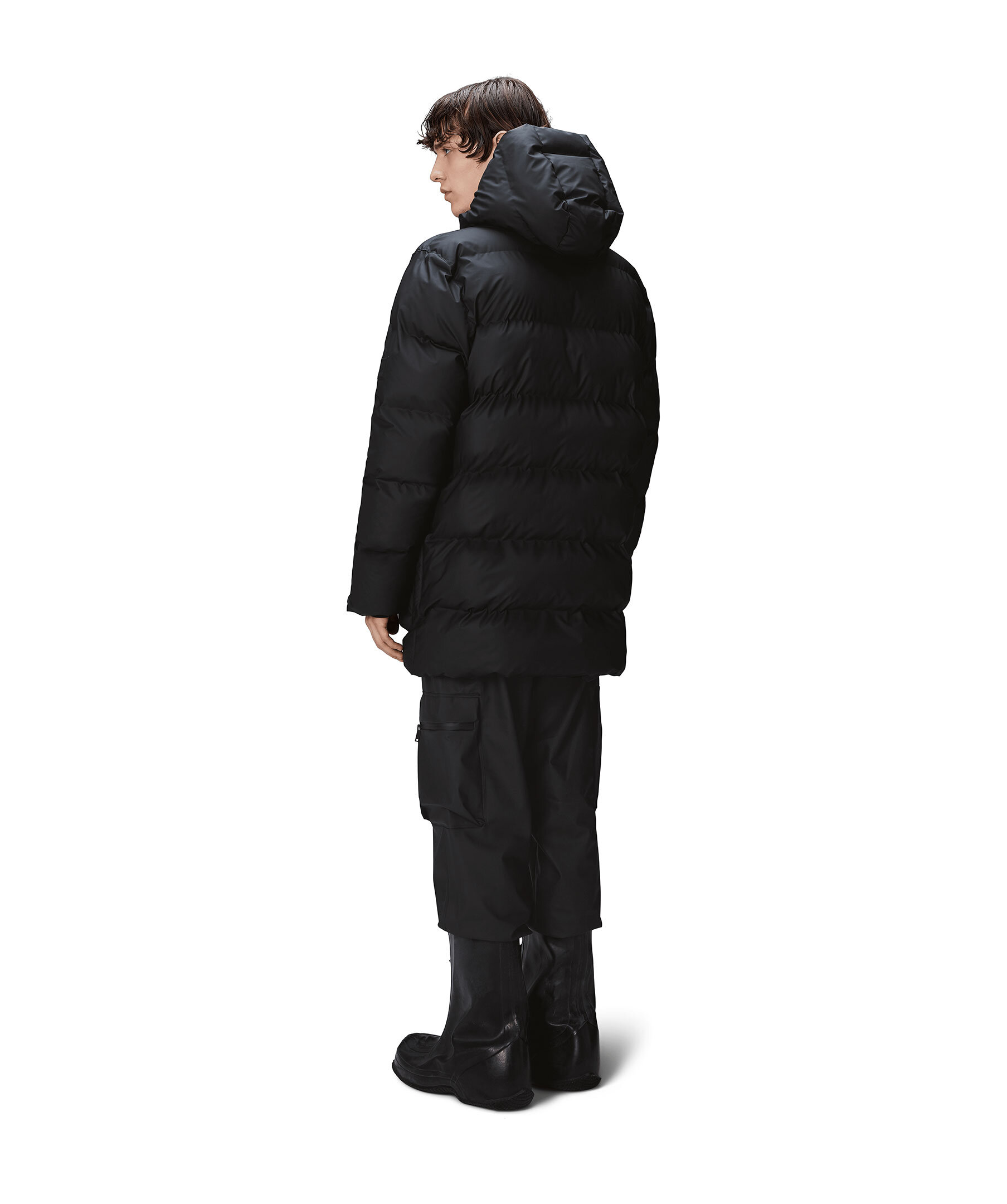 Svart pufferjacka från Rains. Jackan är en vattentät vinterjacka som stängs med tvåvägsdragkedja. Den har huva med dragsko, rymliga fleecefodrade cargo sidfickor, samt två bröstfickor och blixtlåsförsedd innerficka samt logotyp på vänster ärm. Tillverkad i deras signaturtyp i PU.