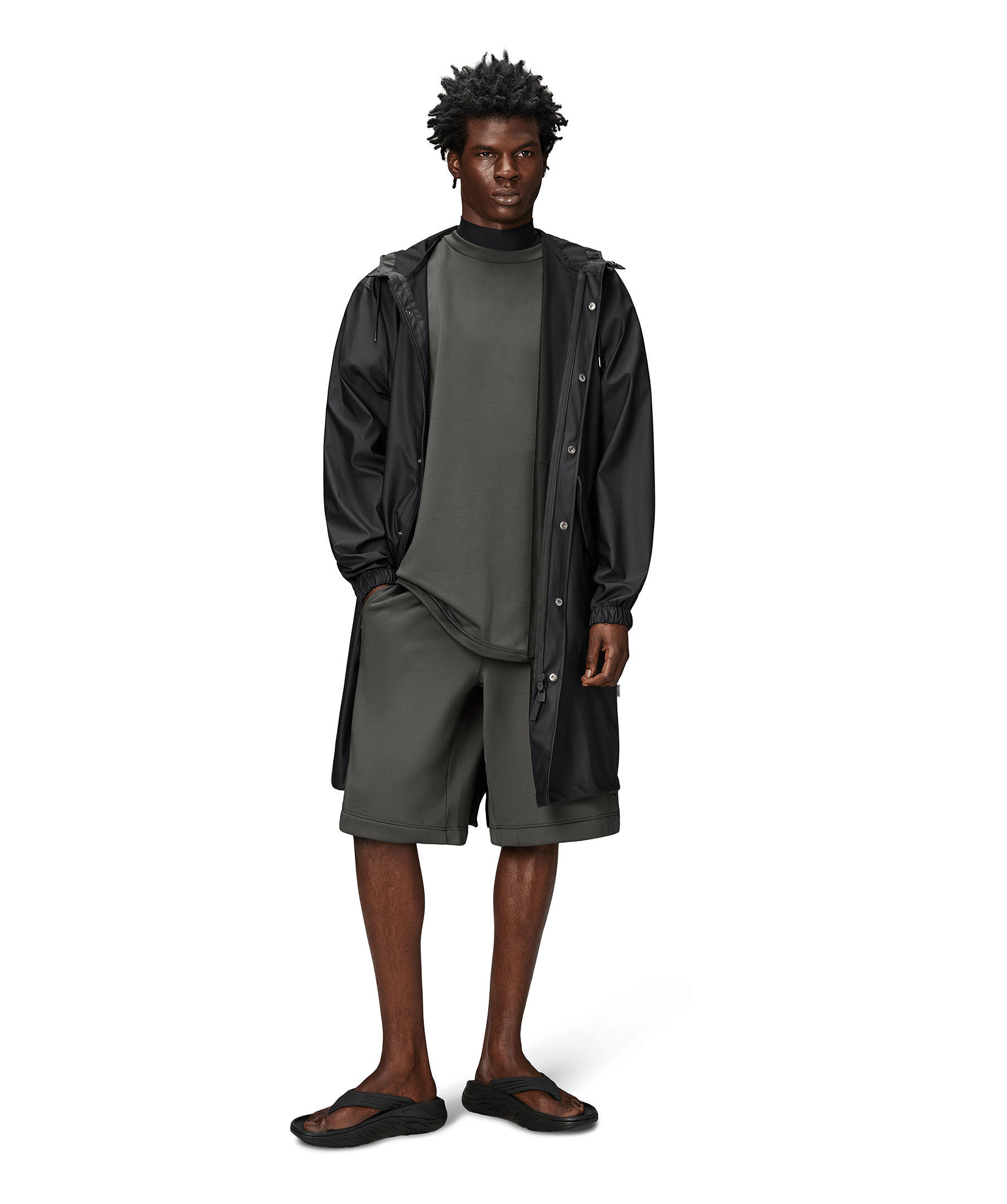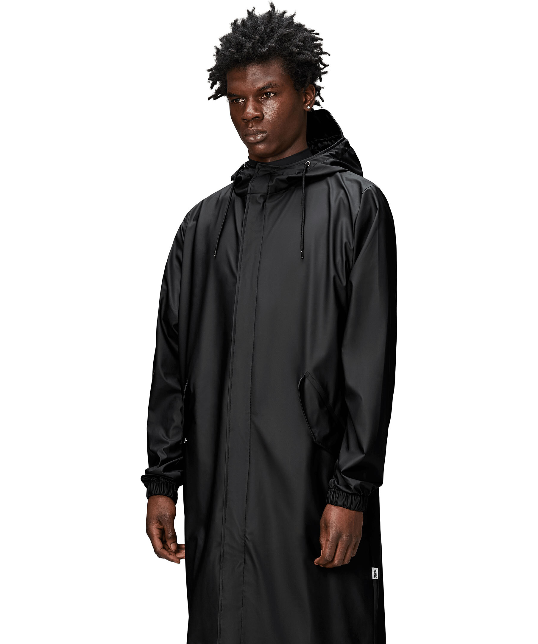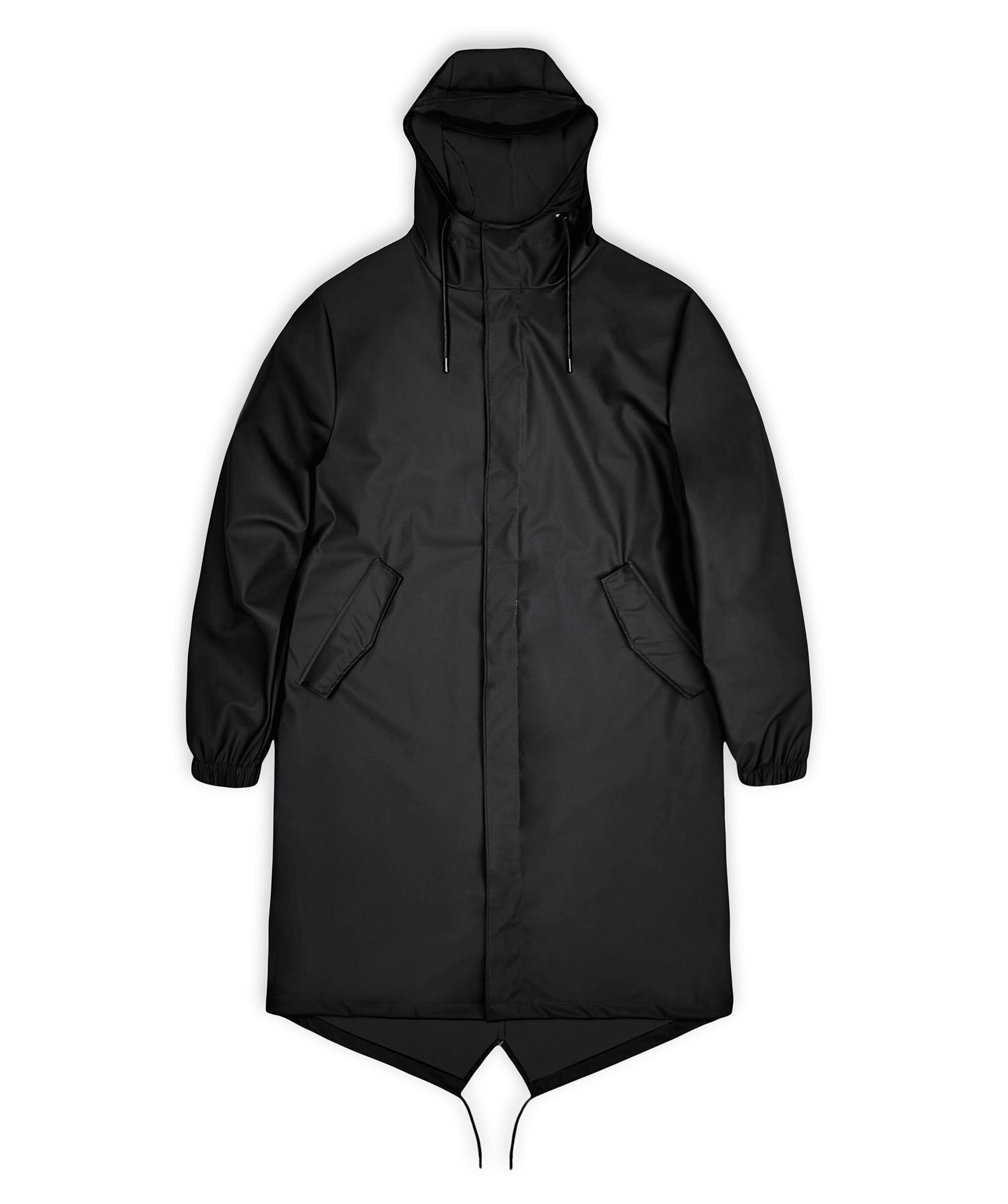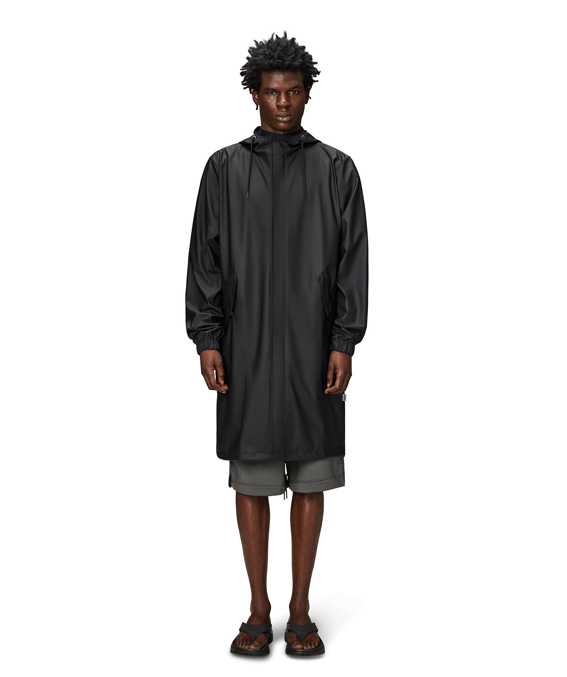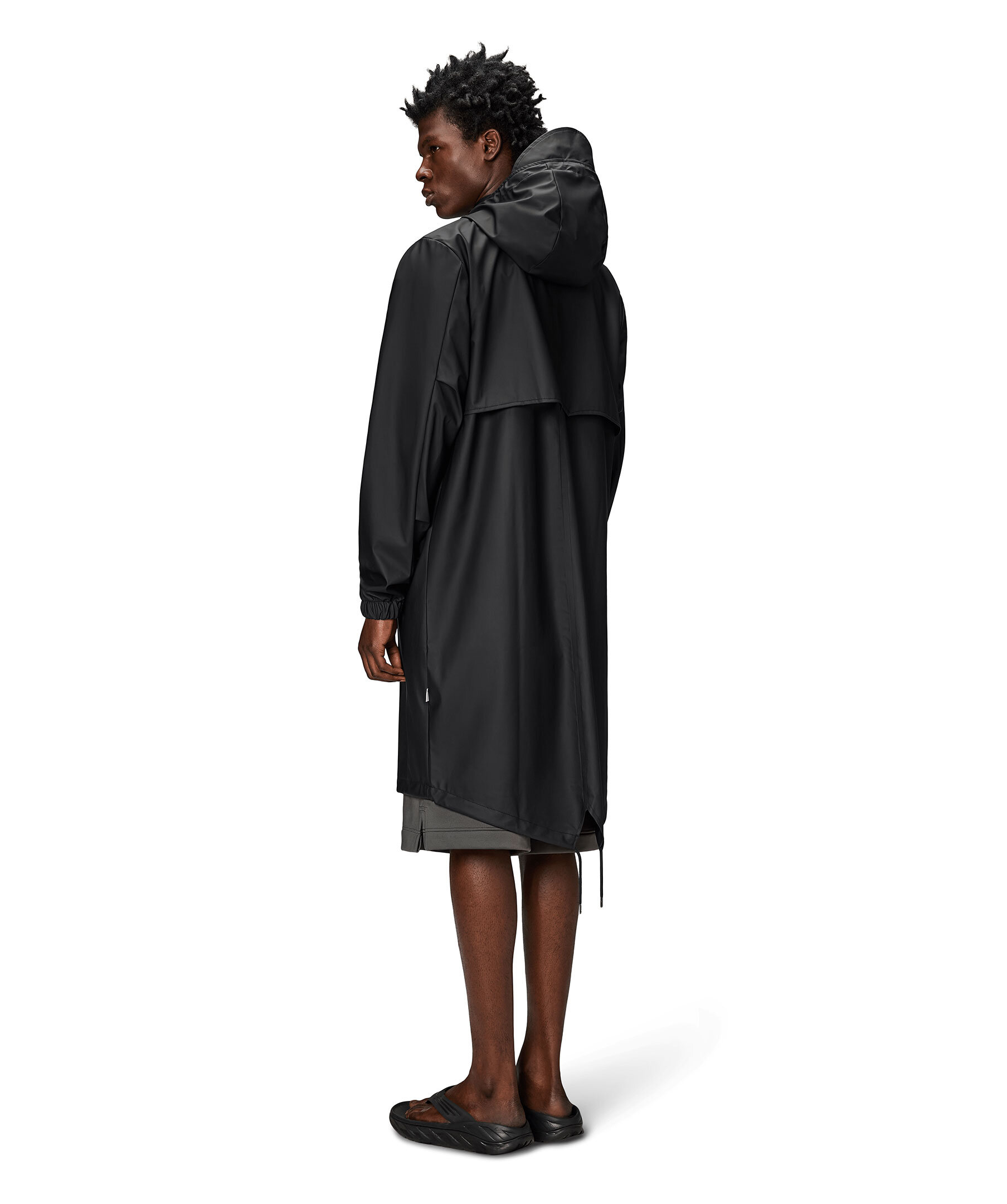 Svart regnjacka från Rains. Jackan kännetecknas av en avskalad estetik och fishtail-fåll med dragsko i anoraklängd. Jackan har praktiska fickor, ventilerat ok och en huva med inbyggd mössa och dragsko. Stilen har elastiska muddar för en tightare passform runt handleden. Det gummerade blixtlåset döljs av en knappslå med tryckknappar. Tillverkad i Rains signaturtyg av PU.