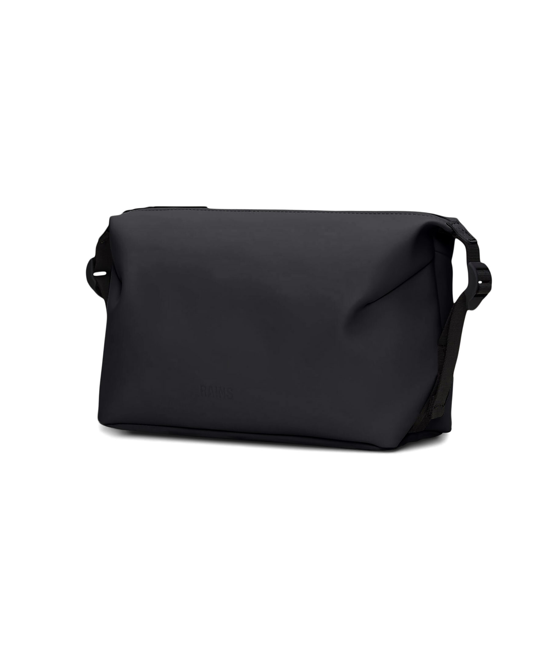 Svart necessär från Rains. Necessären kännetecknas av sin minimala siluett accentuerad av de justerbara, sidomonterade spännen. Stängs med dragkedja och har tonal logotyp. Rymmer 4L. Tillverkad av Rains signatur vattentäta PU-tyg.