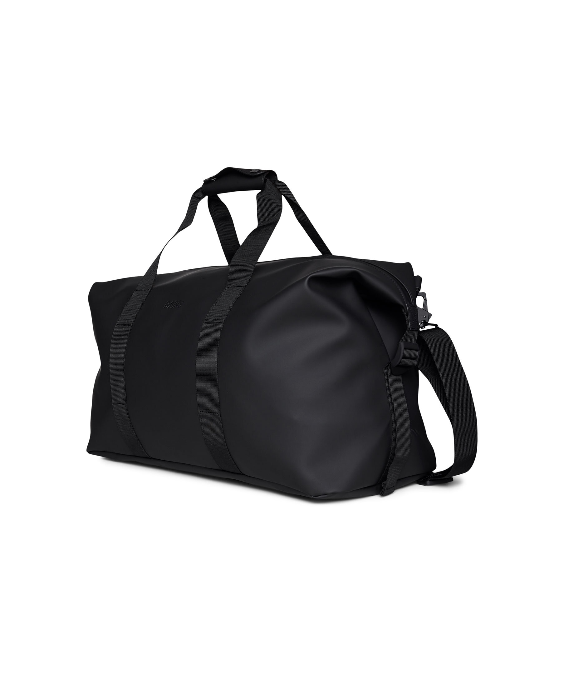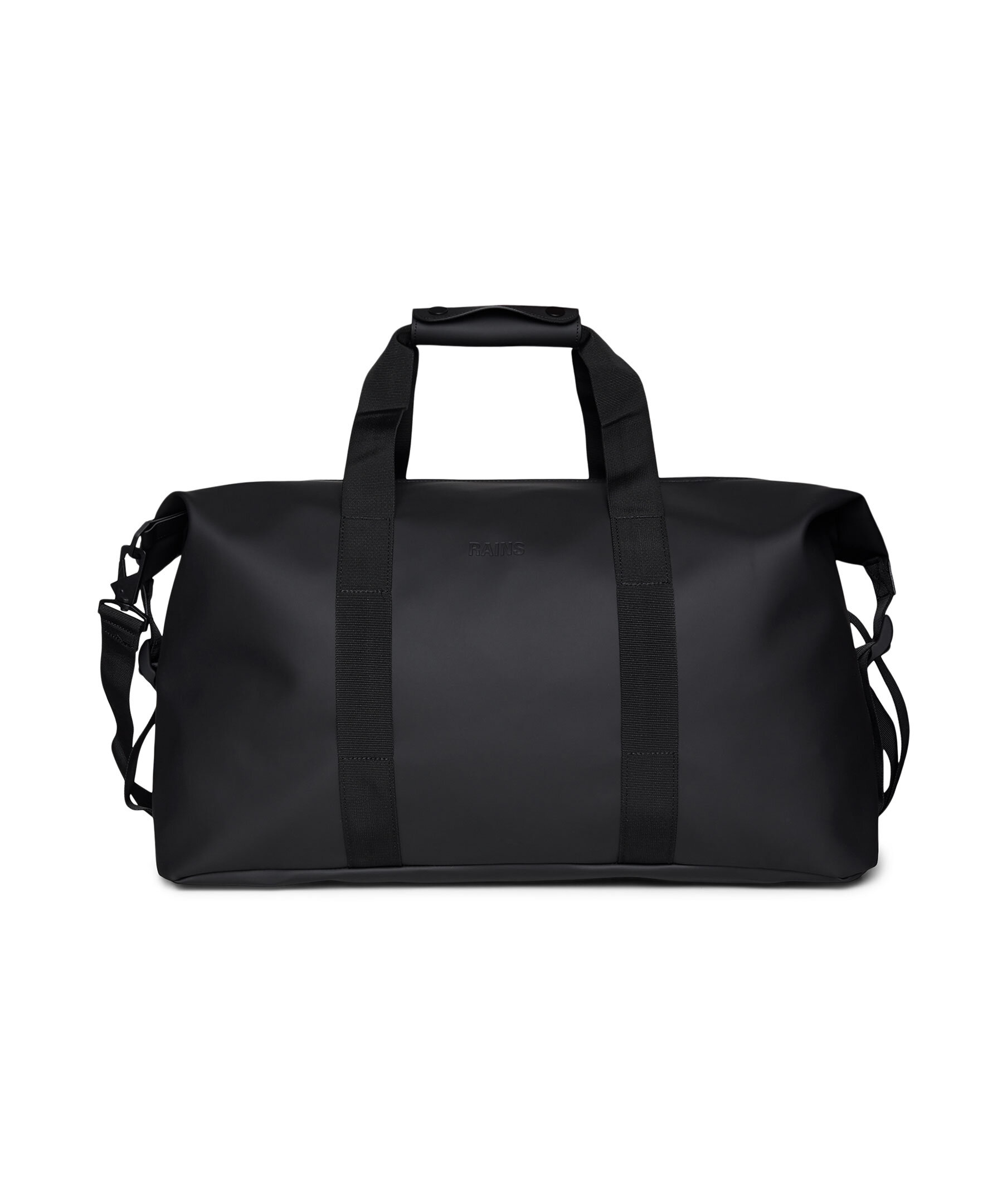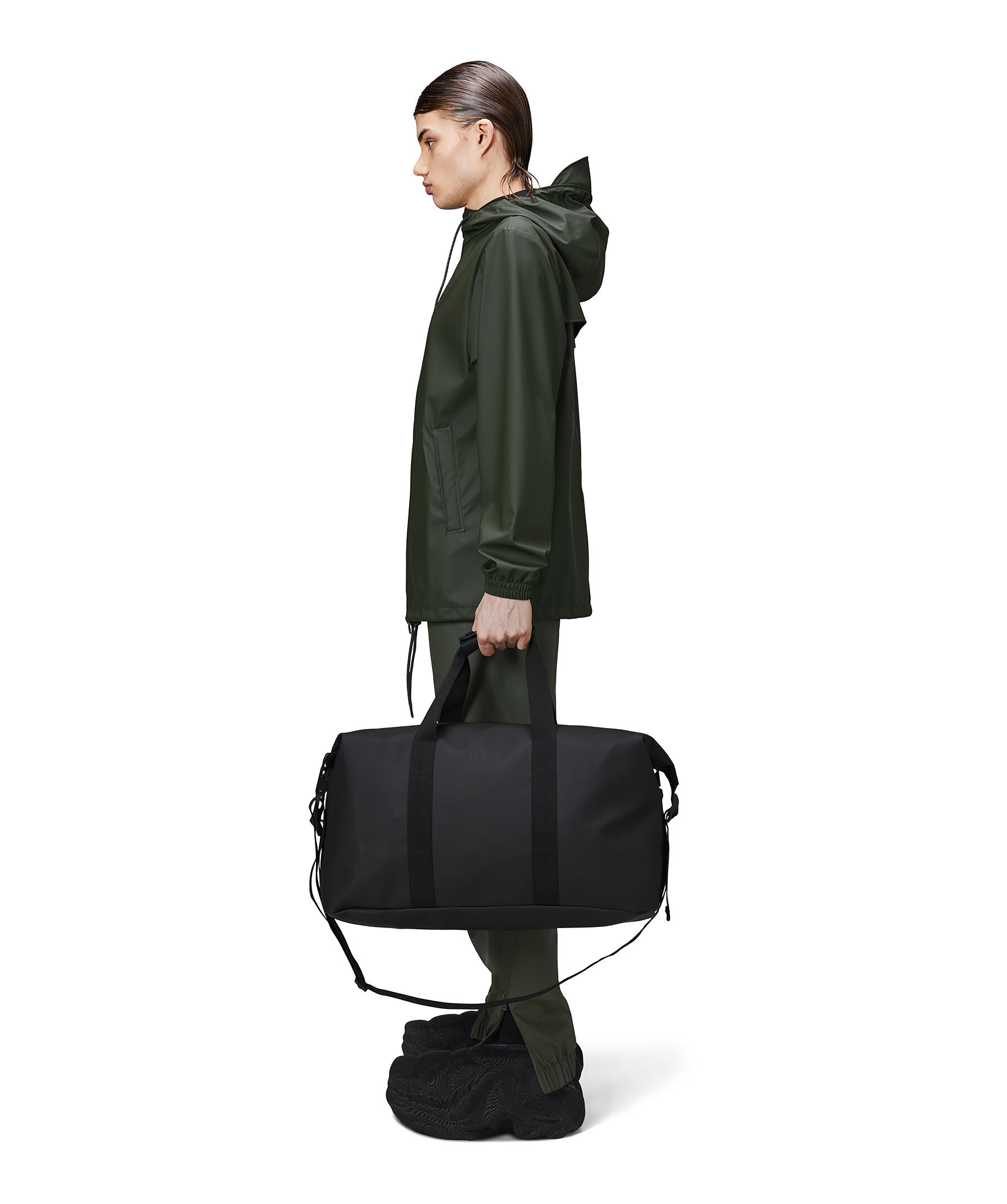 Svart weekend bag från Rains i vattentättyg. Väskans huvudfack stängs med dragkedja. Vävt bärhandtag, justerbart axelband och kompressionsremmar. Väskans mått: H 27cm x B 52cm x D 26 cm.