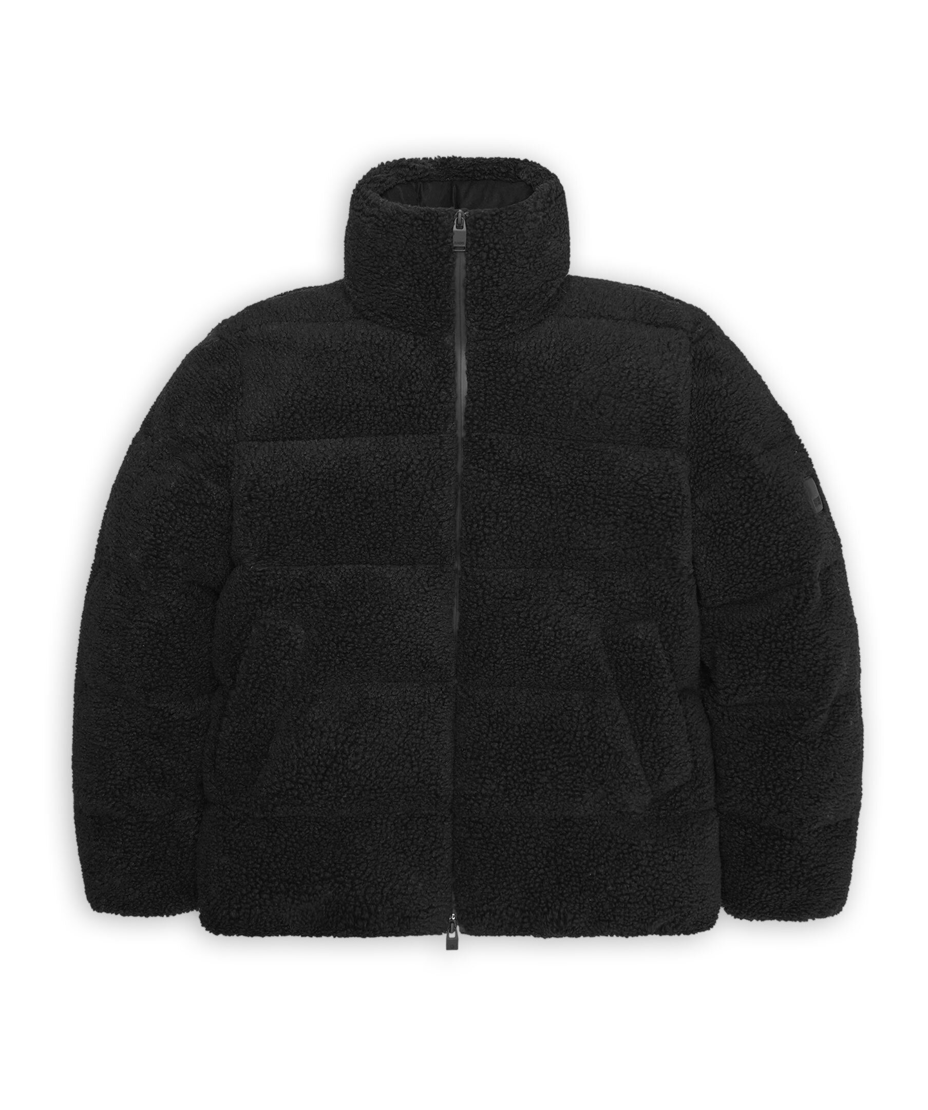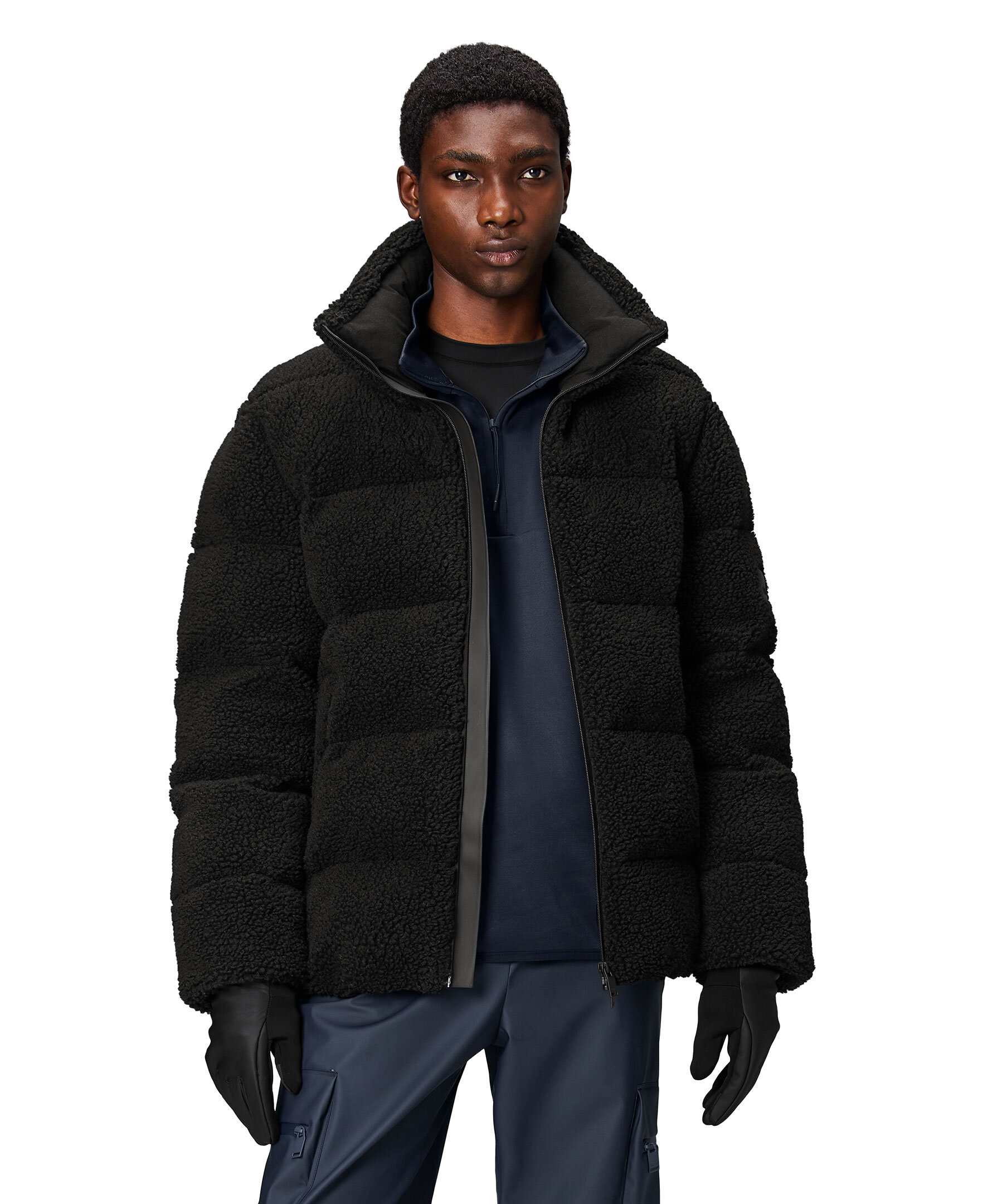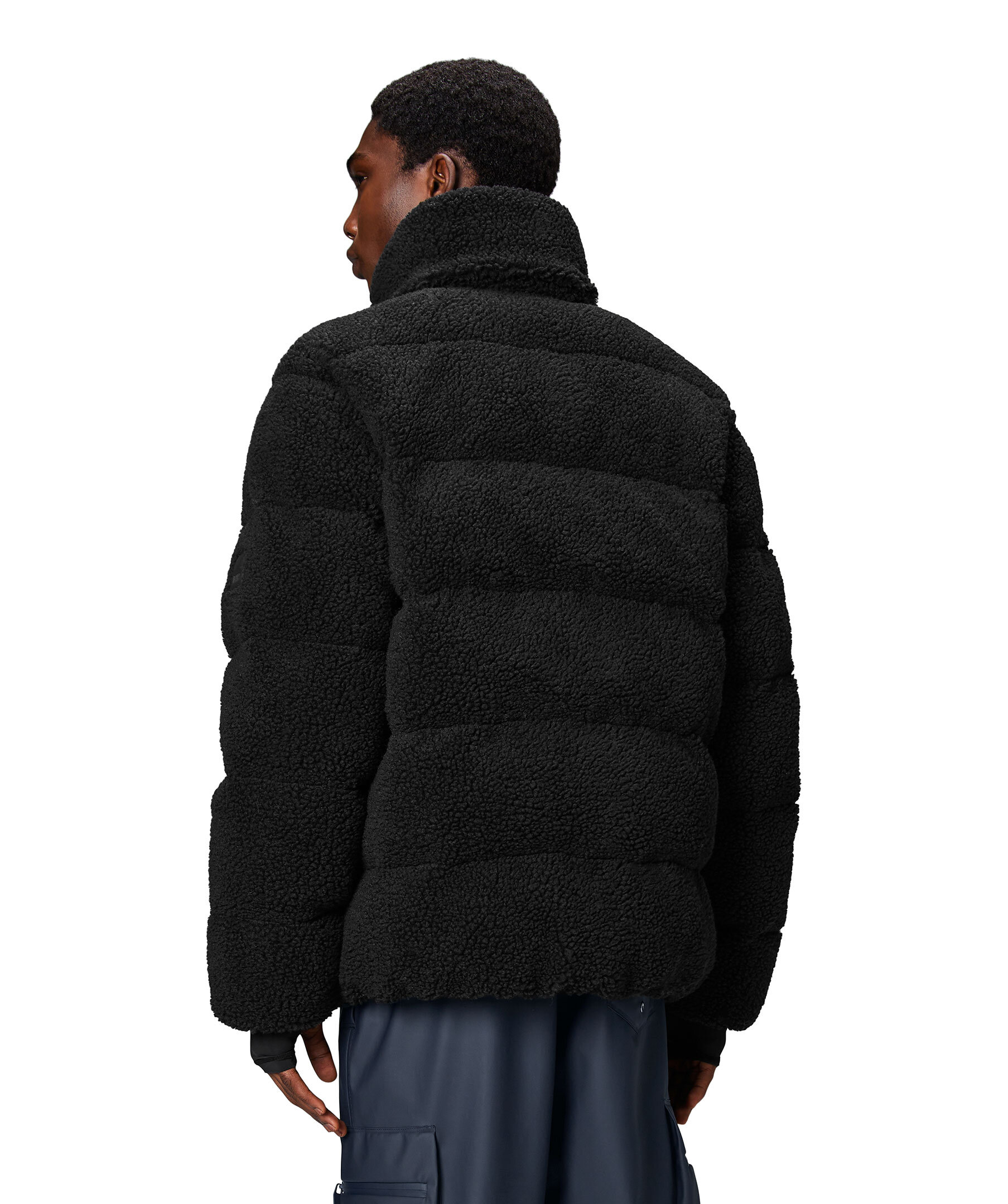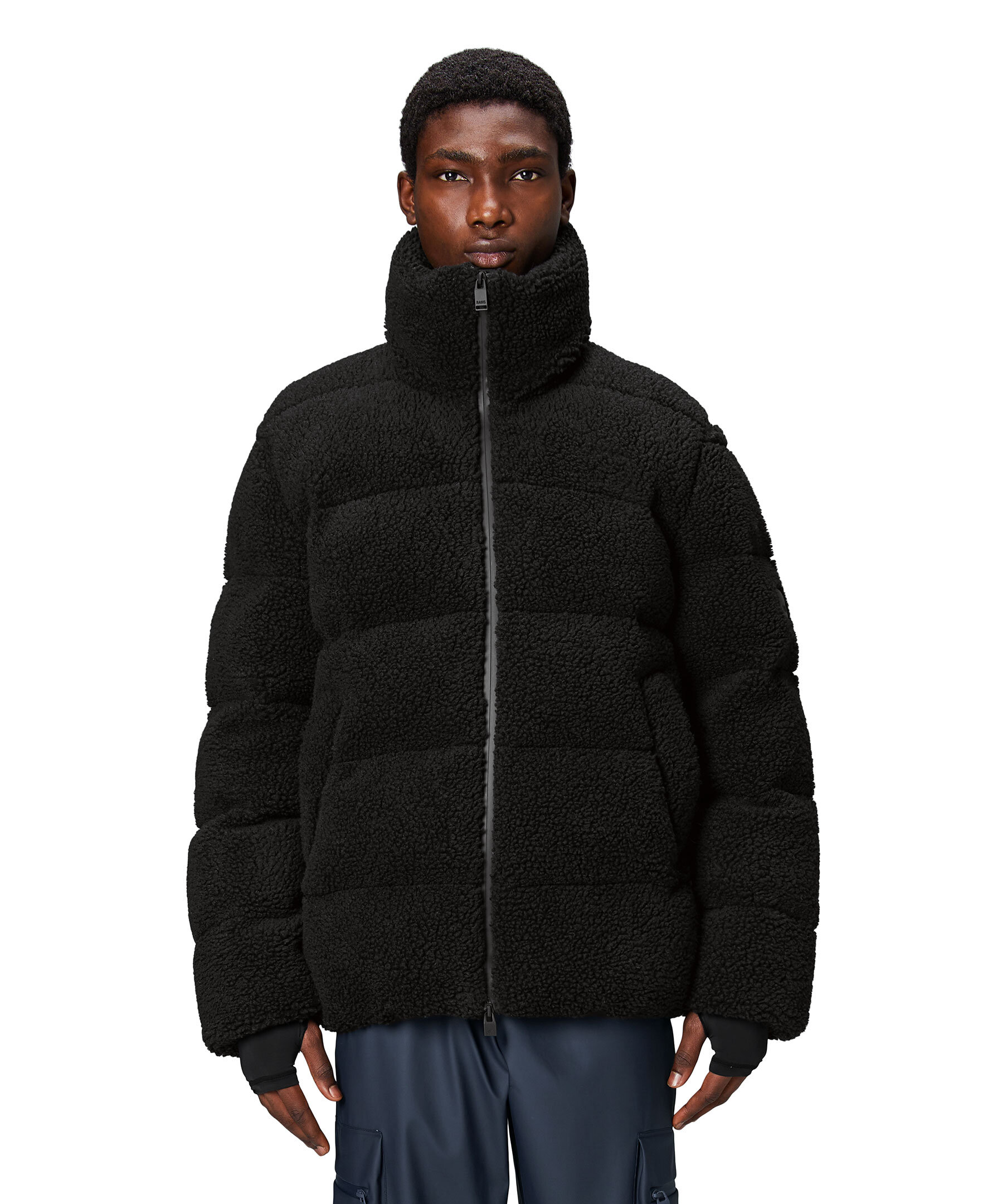 Svart pufferjacka i fleece från Rains. Stängs med tvåvägsdragkedja och har hög krage, två sidfickor, elastisk midja samt gummerad logotyp på vänster ärm. Tillverkad i polyester.