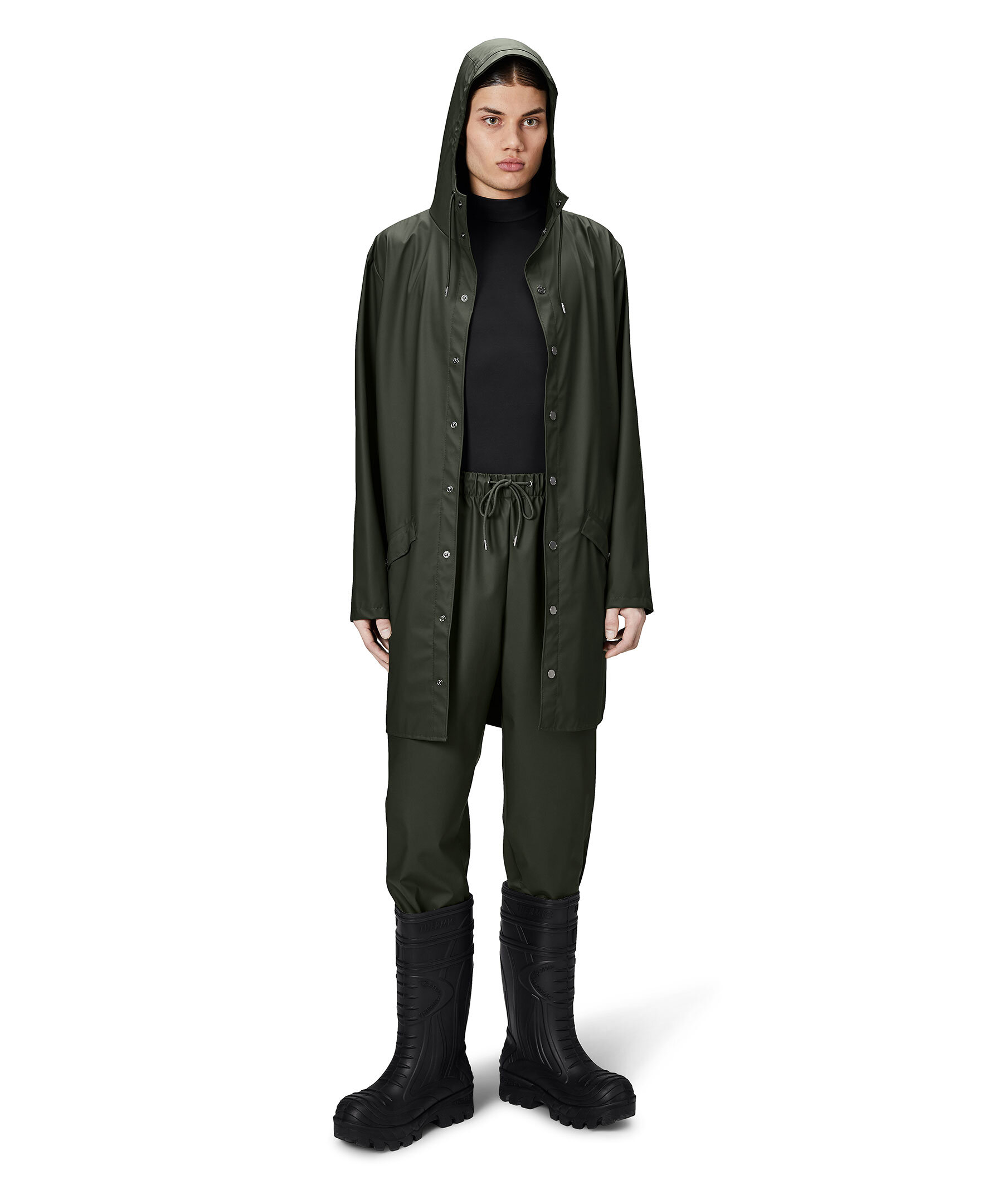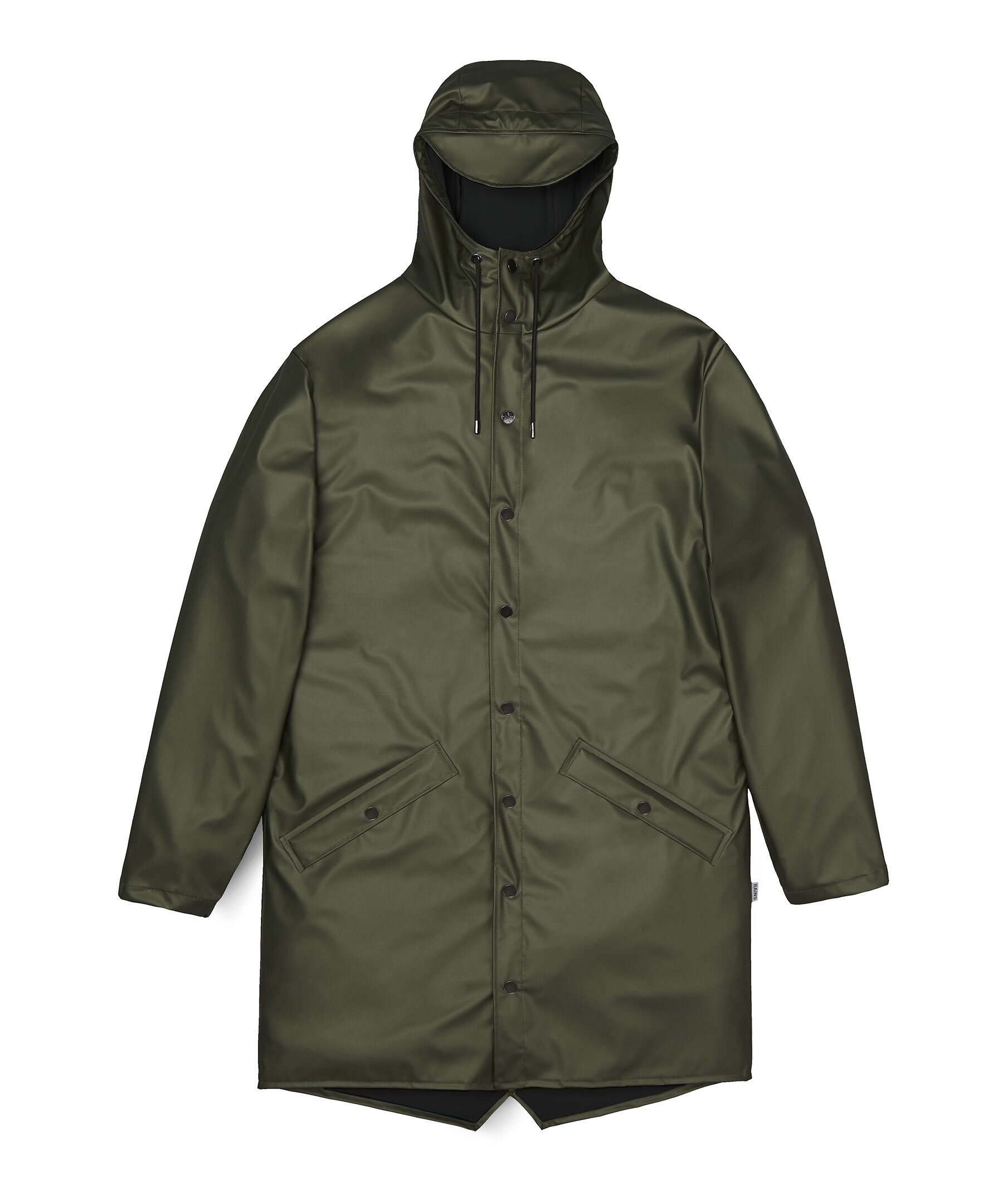 Grön lång regnjacka från Rains. Stängs framtill med tryckknappar. Luva med dragsko. Snedställda fickor som stängs med tryckknappar.