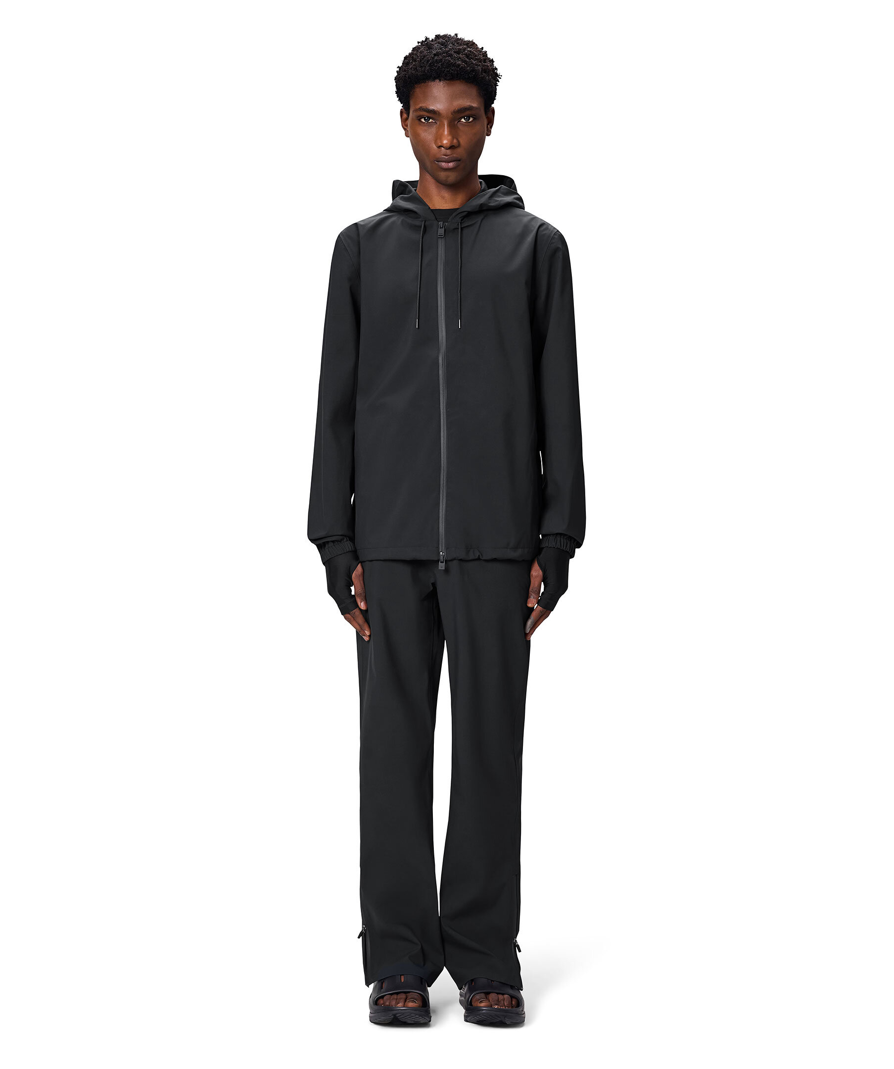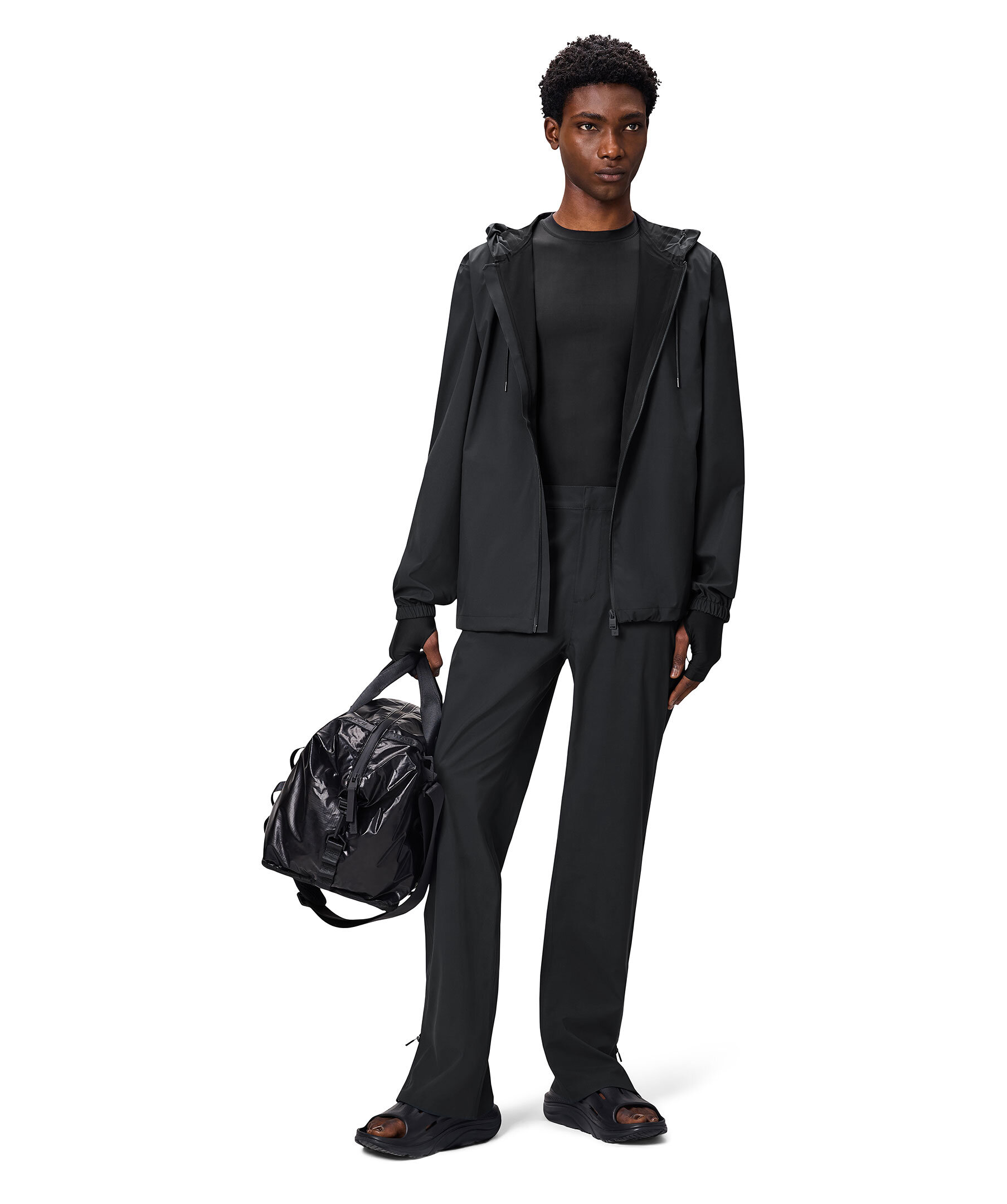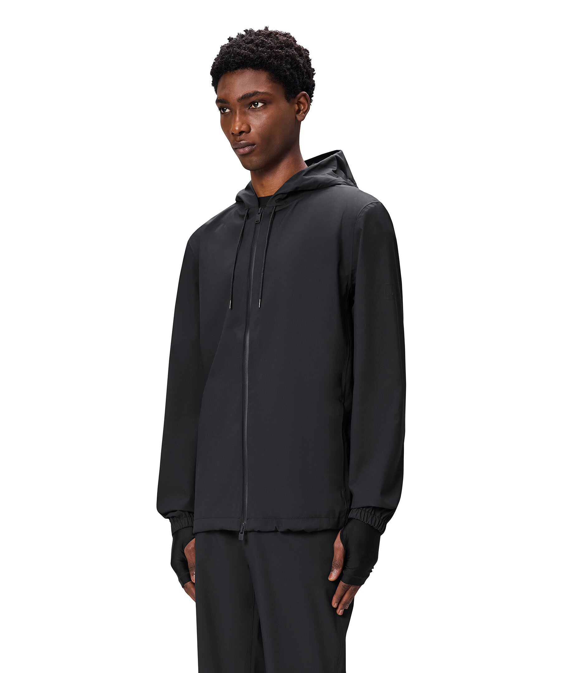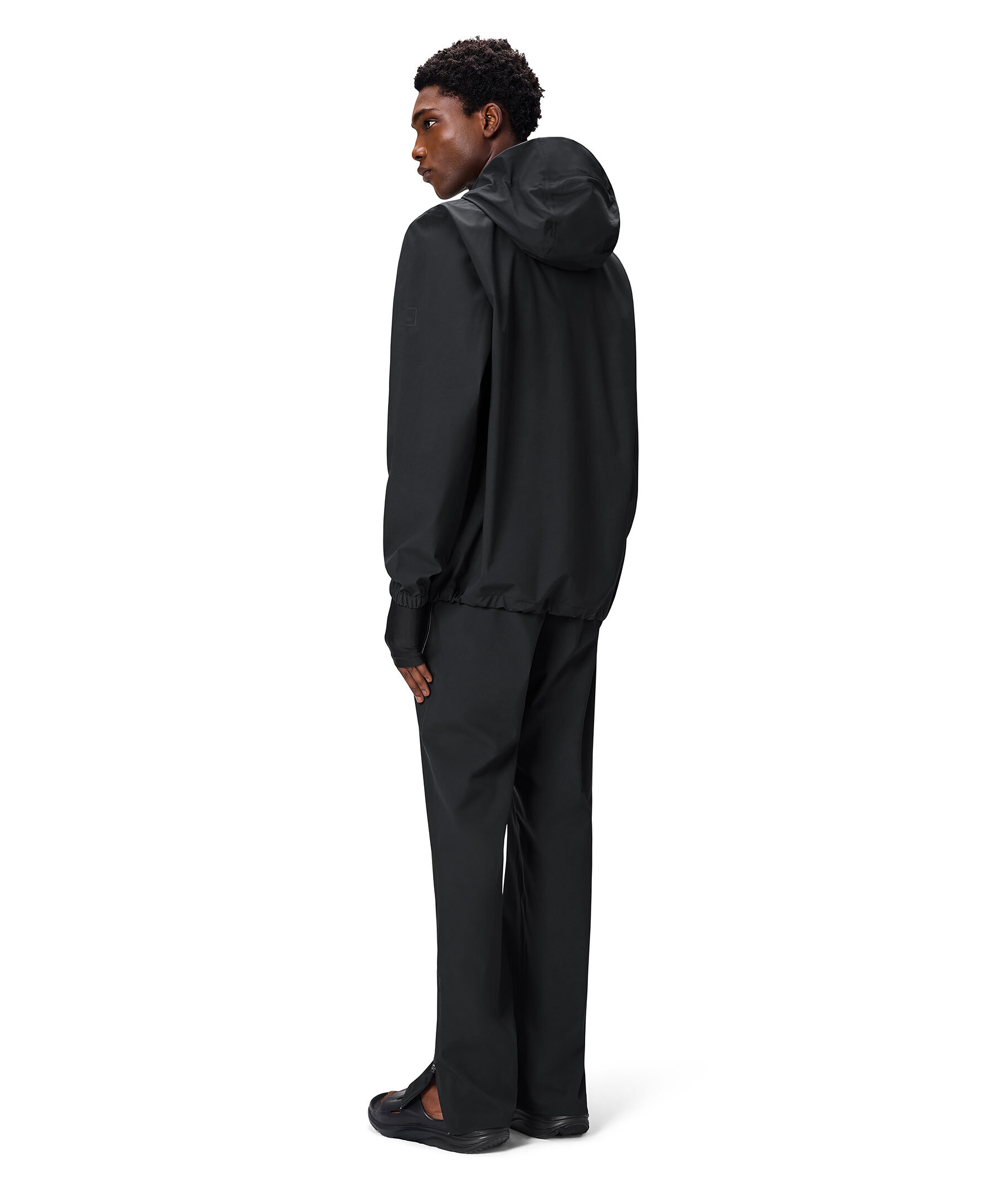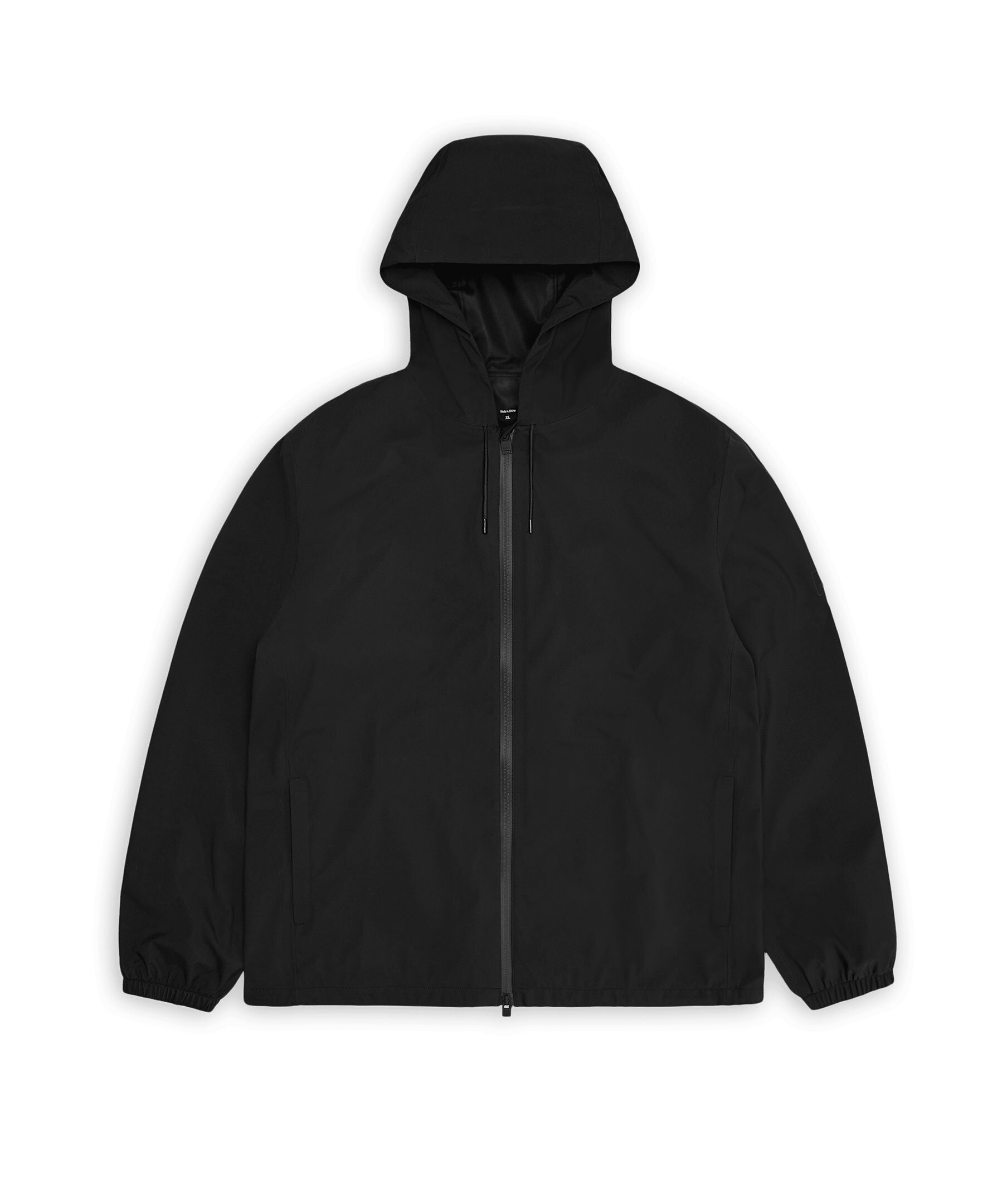 Svart jacka från Rains. Jackan är vattentät med en matt yta. Den har en vattentät belagd dragkedja och en huva med dragsko, designad med sidofickor med dragkedja och elastiska ärmslut. En gummerad märkesdetalj ger en kontrast till det rena utseendet. Tillverkad i mjukt och lätt 3L-tyg med tejpade sömmar.