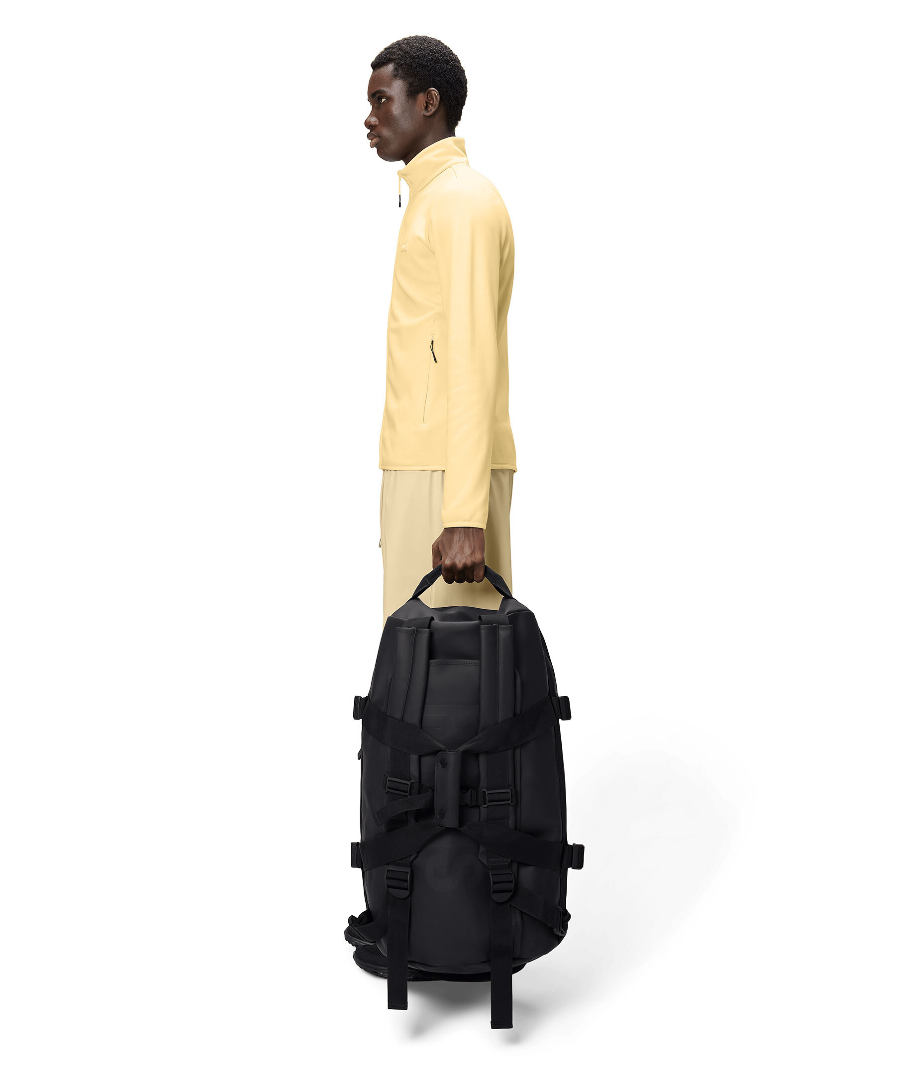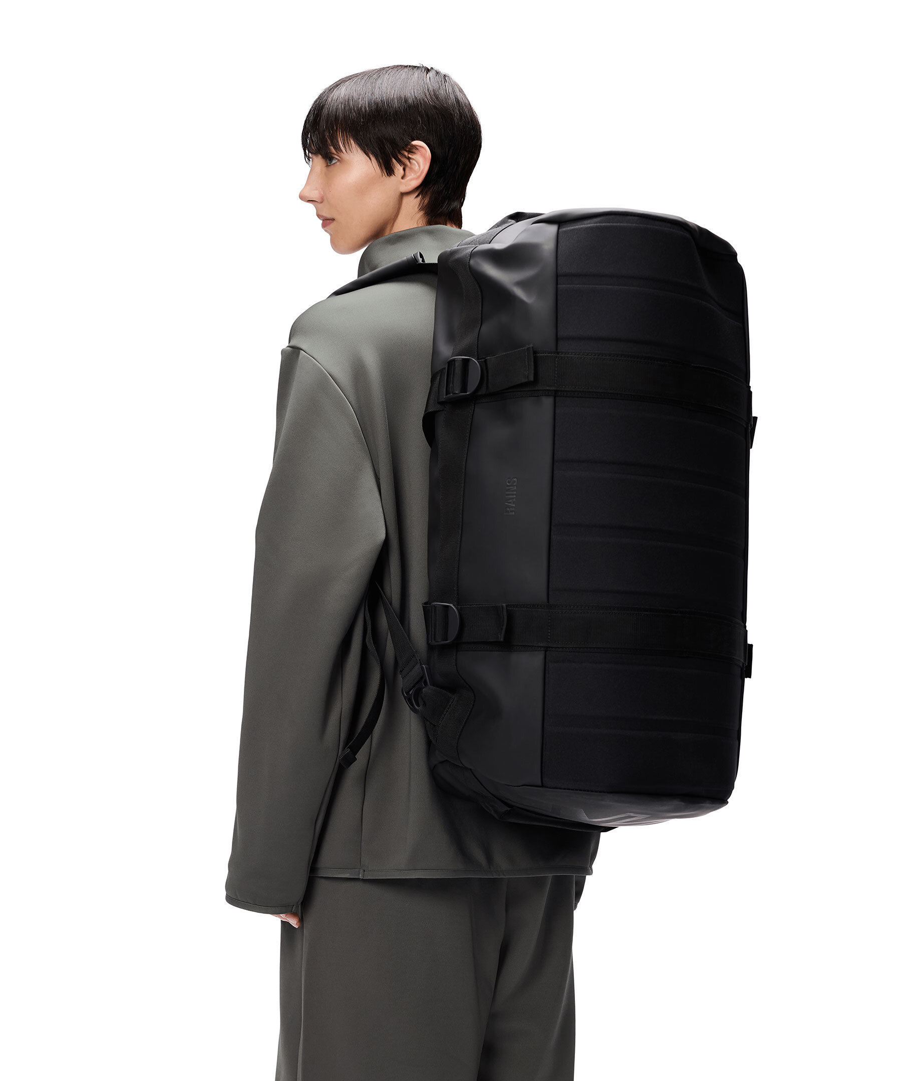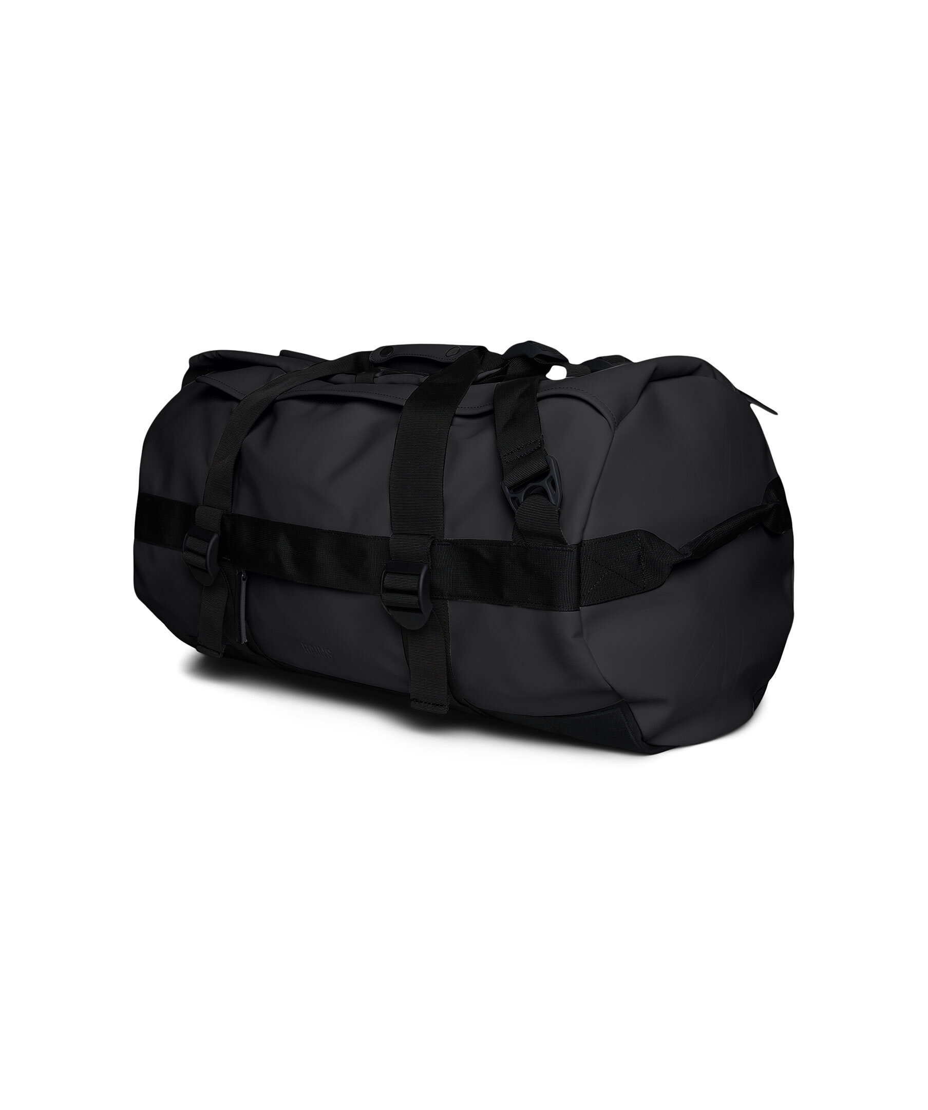 Svart duffelbag från Rains. Väskan kännetecknas av sin cylinderform, sin stora öppning för enkel packning och vävda omlottremmar. Blixtlåset öppnar ett stort U-format huvudfack med en sidficka i meshmaterial. Lockets undersida har också två meshfickor med blixtlås. Den har en dold sidficka för pass, nycklar och andra små tillbehör, en förstärkt botten för hållbarhet och stadga samt sidfästa kompressionsremmar som hjälper till att hålla innehållet på plats. Väskan kan bäras på olika sätt med hållbara handtagsremmar och justerbara vadderade axelremmar. Tillverkad i Rains vattentäta signaturtyg av PU. Mått: H34 x D34 x B62 cm. Rymmer 56L.