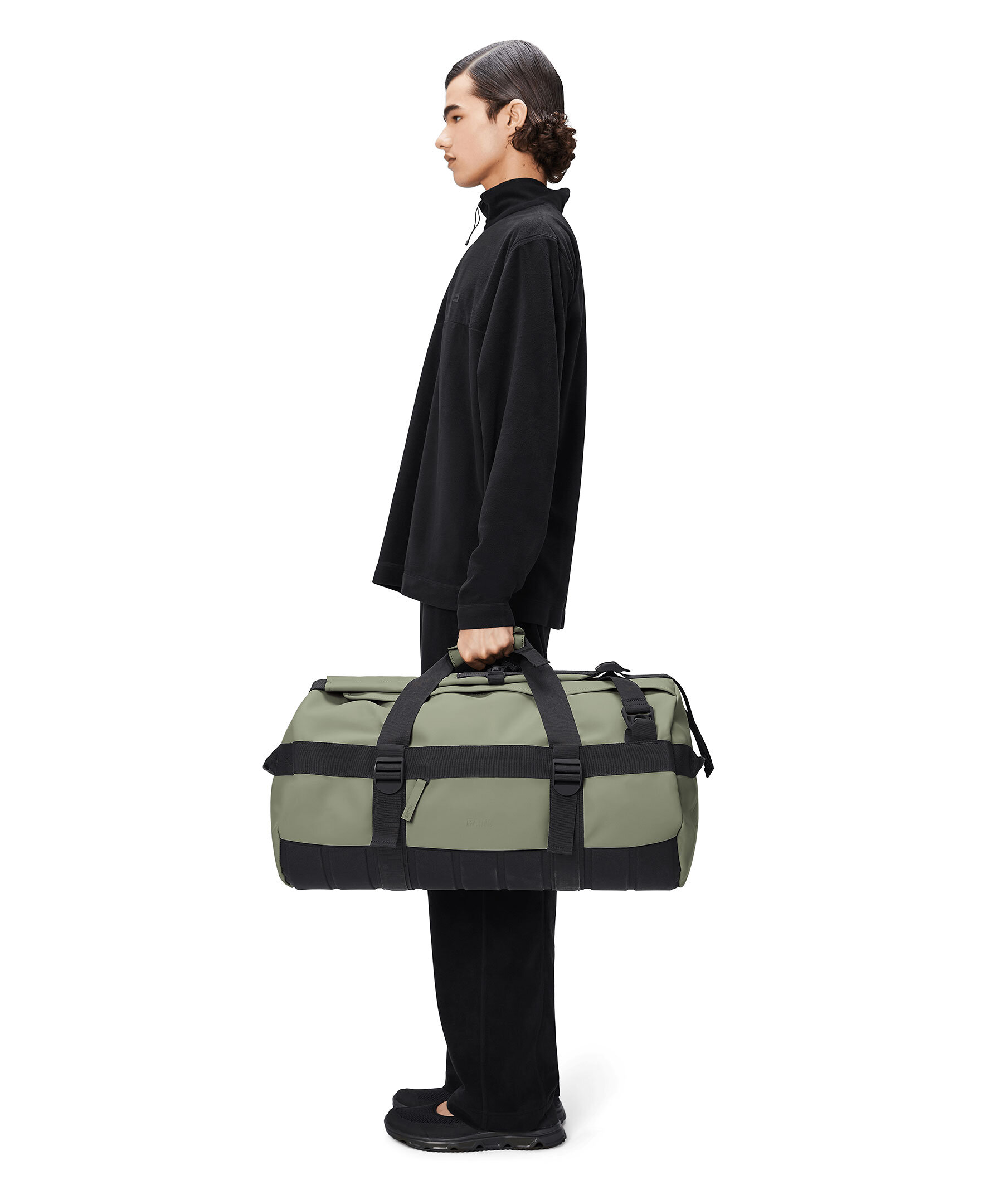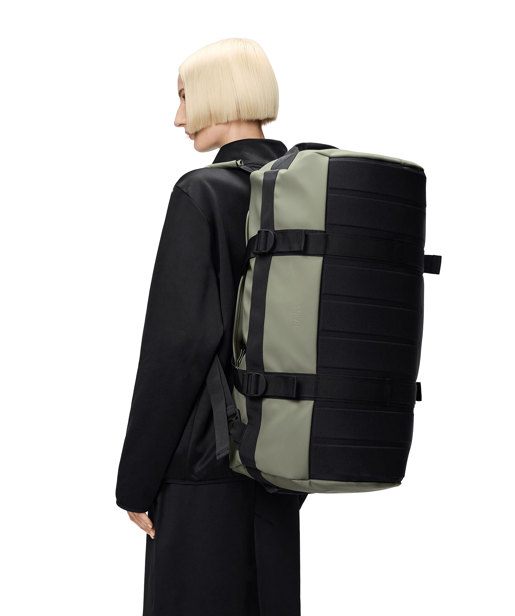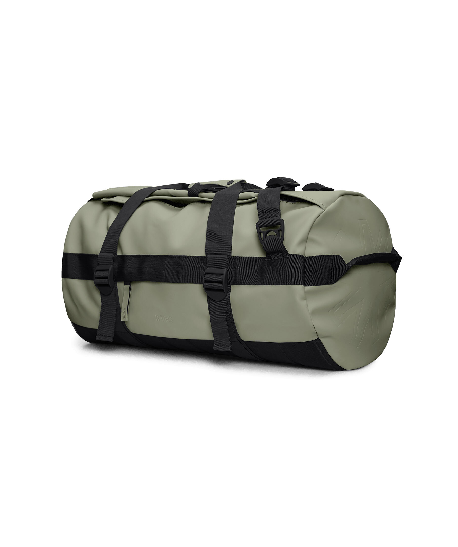 Grågrön duffelbag från Rains. Väskan kännetecknas av sin cylinderform, sin stora öppning för enkel packning och vävda omlottremmar. Blixtlåset öppnar ett stort U-format huvudfack med en sidficka i meshmaterial. Lockets undersida har också två meshfickor med blixtlås. Den har en dold sidficka för pass, nycklar och andra små tillbehör, en förstärkt botten för hållbarhet och stadga samt sidfästa kompressionsremmar som hjälper till att hålla innehållet på plats. Väskan kan bäras på olika sätt med hållbara handtagsremmar och justerbara vadderade axelremmar. Tillverkad i Rains vattentäta signaturtyg av PU. Mått: H34 x D34 x B62 cm. Rymmer 56L.