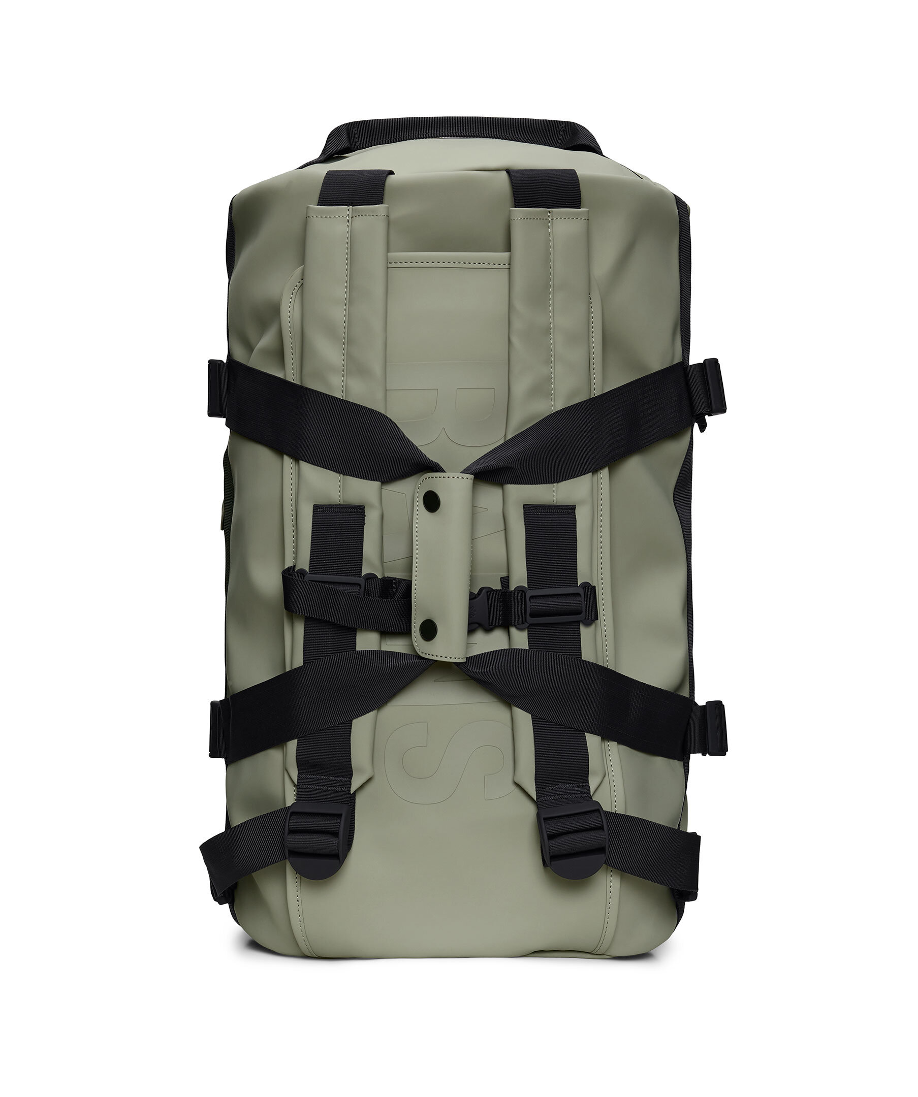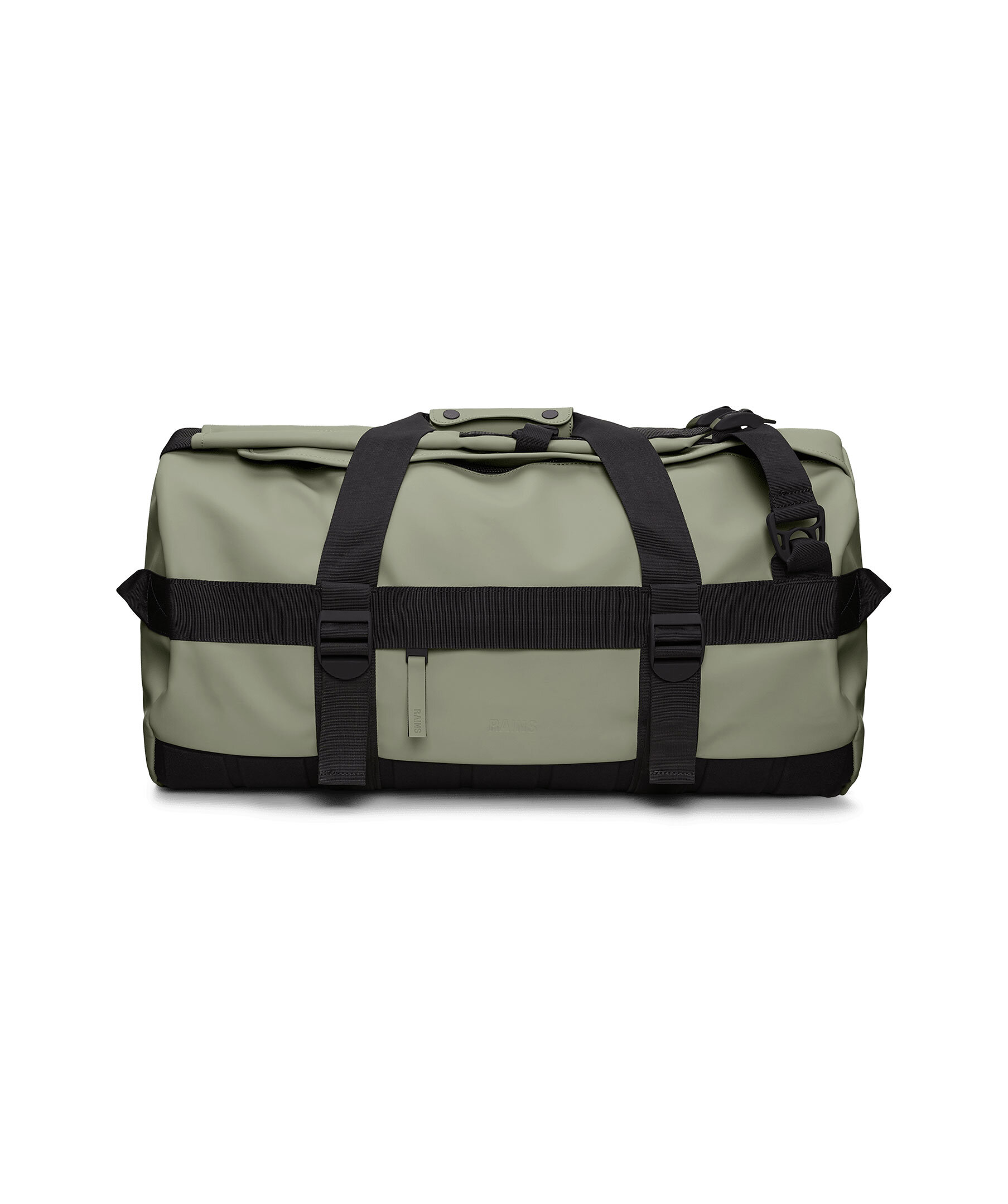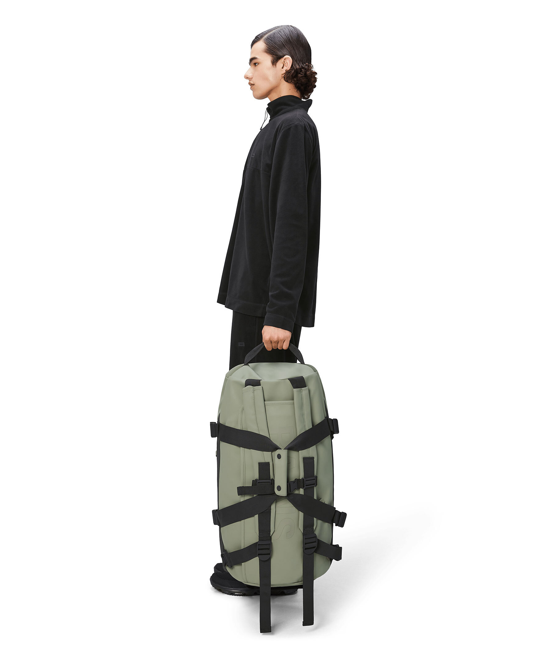 Grågrön duffelbag från Rains. Väskan kännetecknas av sin cylinderform, sin stora öppning för enkel packning och vävda omlottremmar. Blixtlåset öppnar ett stort U-format huvudfack med en sidficka i meshmaterial. Lockets undersida har också två meshfickor med blixtlås. Den har en dold sidficka för pass, nycklar och andra små tillbehör, en förstärkt botten för hållbarhet och stadga samt sidfästa kompressionsremmar som hjälper till att hålla innehållet på plats. Väskan kan bäras på olika sätt med hållbara handtagsremmar och justerbara vadderade axelremmar. Tillverkad i Rains vattentäta signaturtyg av PU. Mått: H34 x D34 x B62 cm. Rymmer 56L.