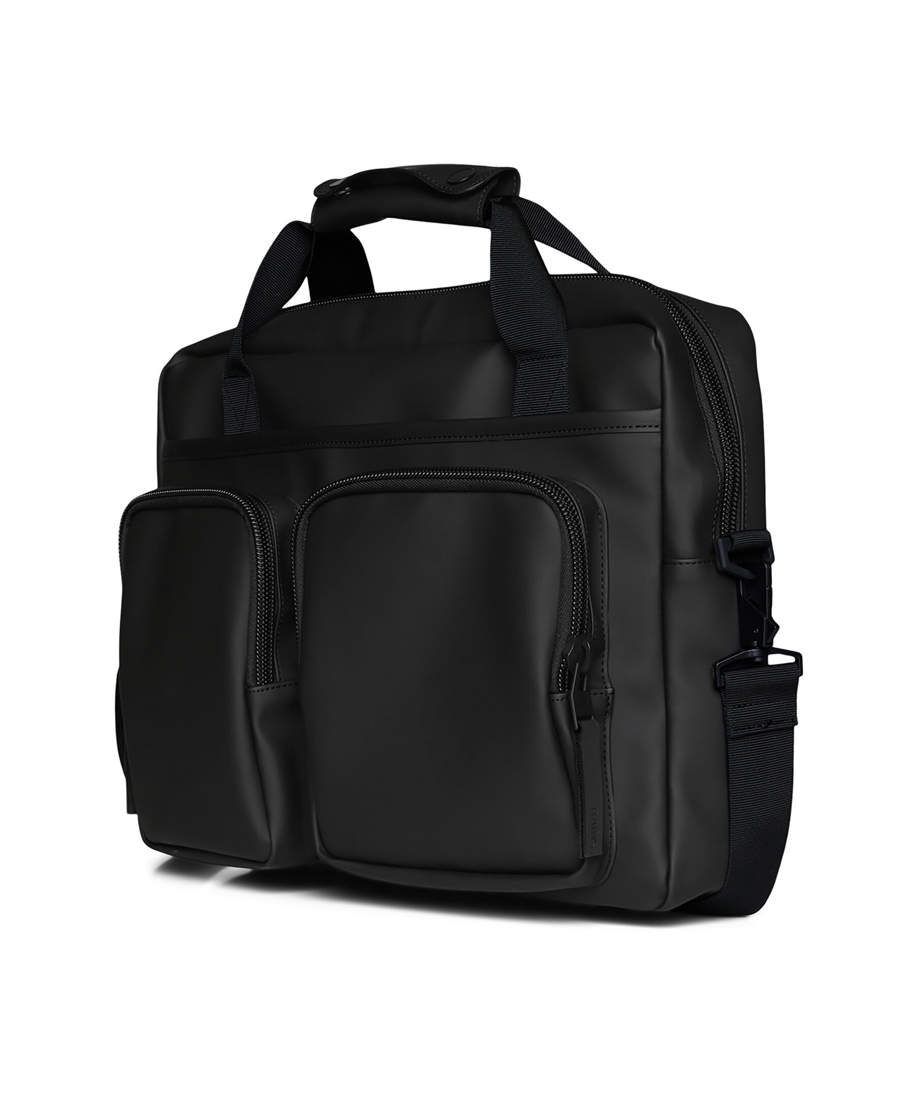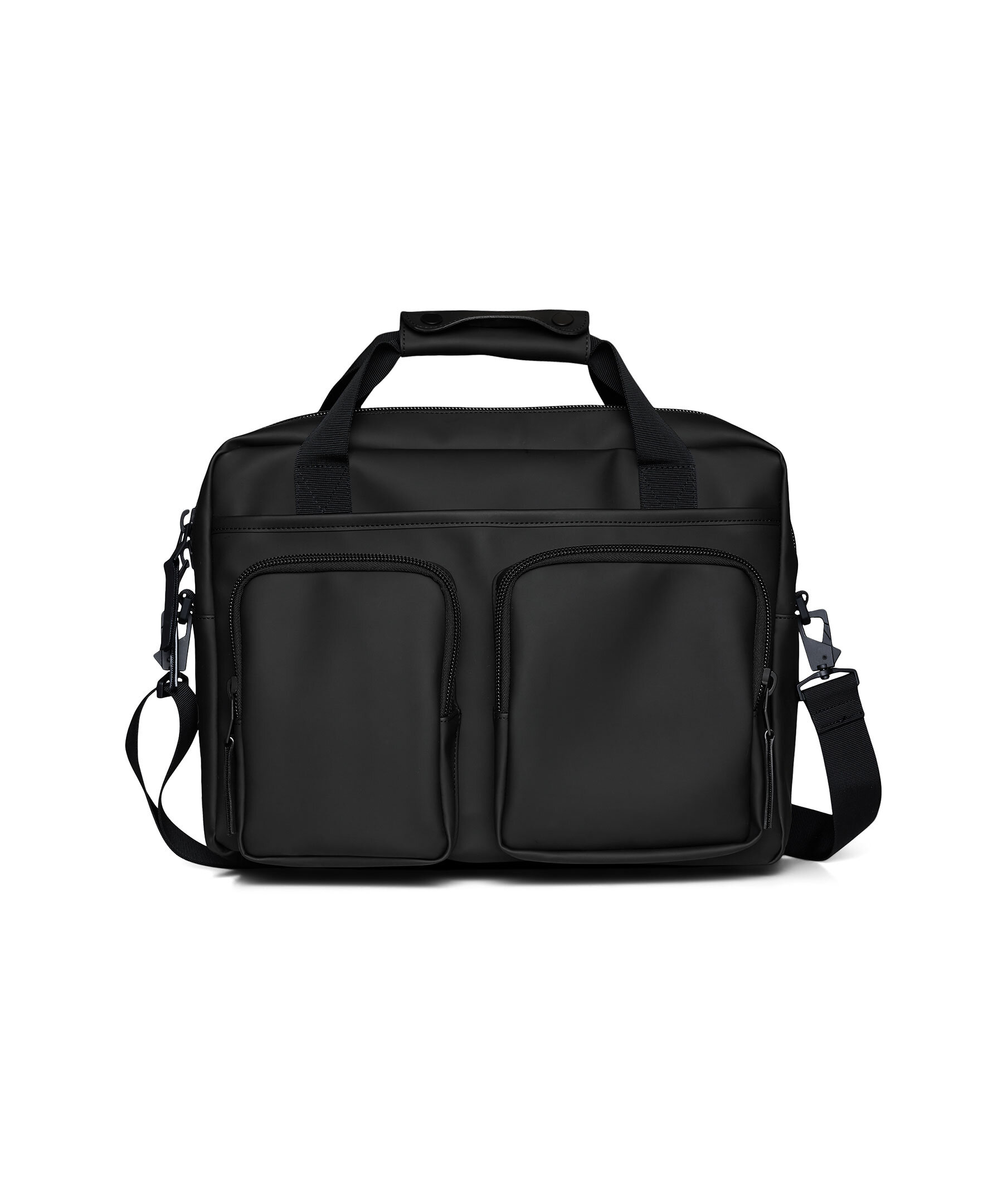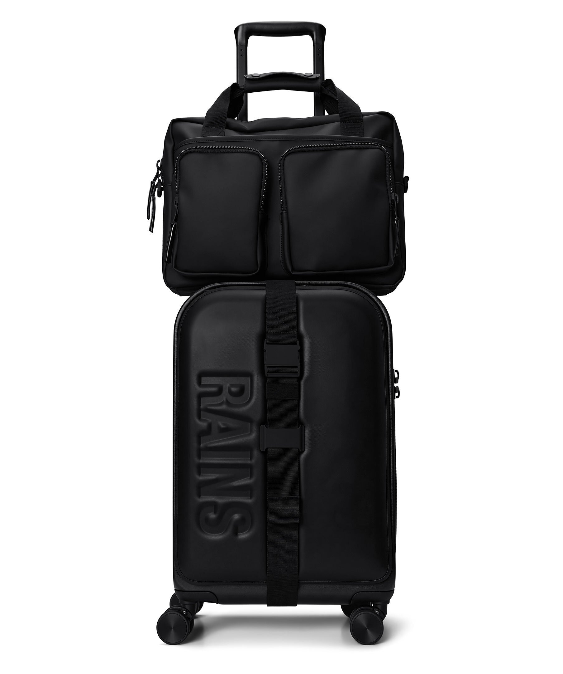 Svart vattentät väska från Rains. Vävda bärhandtag och en löstagbar axelrem. Huvudfacket stängs med dragkedja, två mindre ytterfack som stängs med dragkedja. Vagnrem med blixtlåsficka gör att väskan kan skjutas på teleskopiska handtag. Blixtlås- och meshfickor på väskans insida. Väskans mått: H 30 x B 38 x D 9 cm