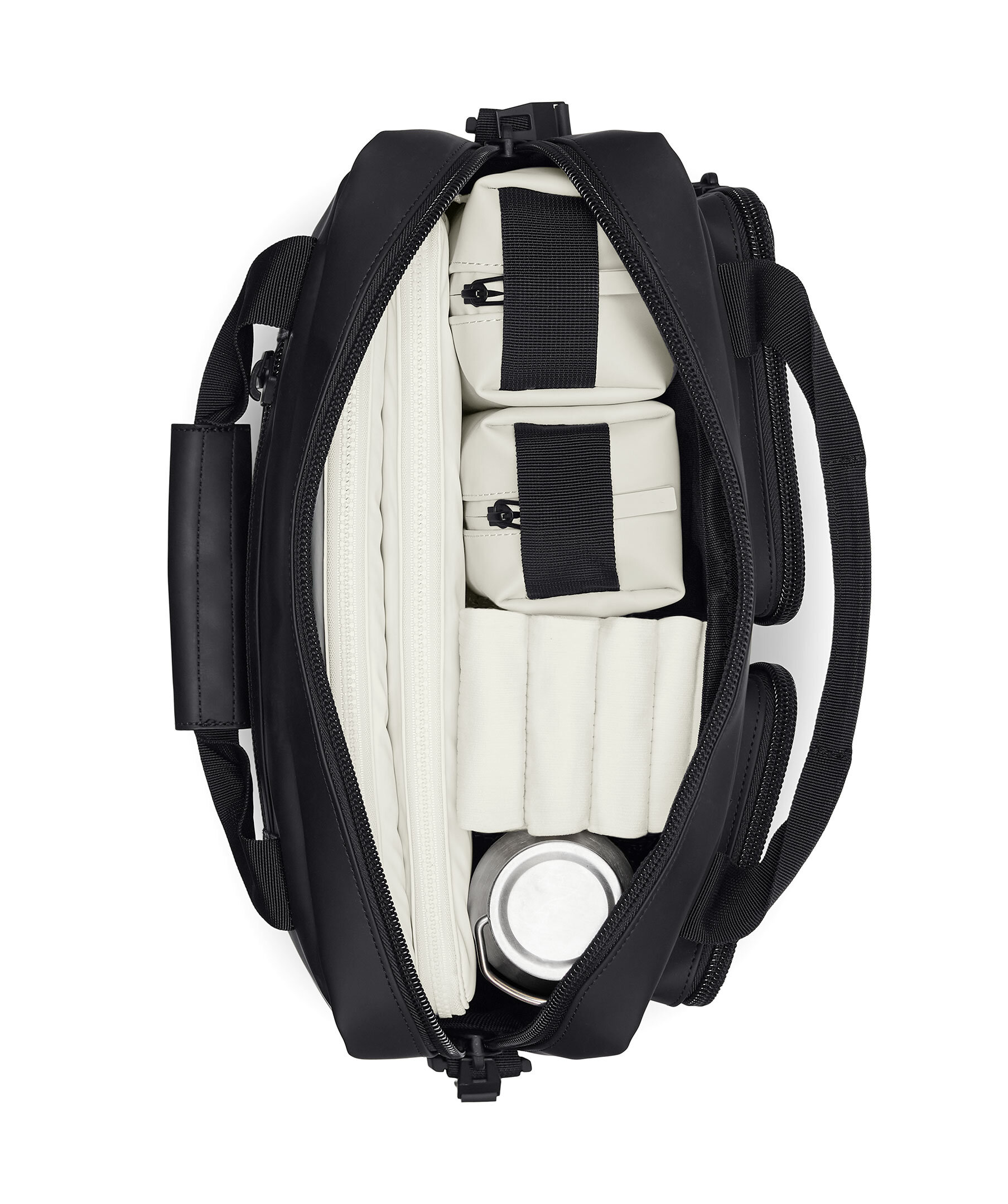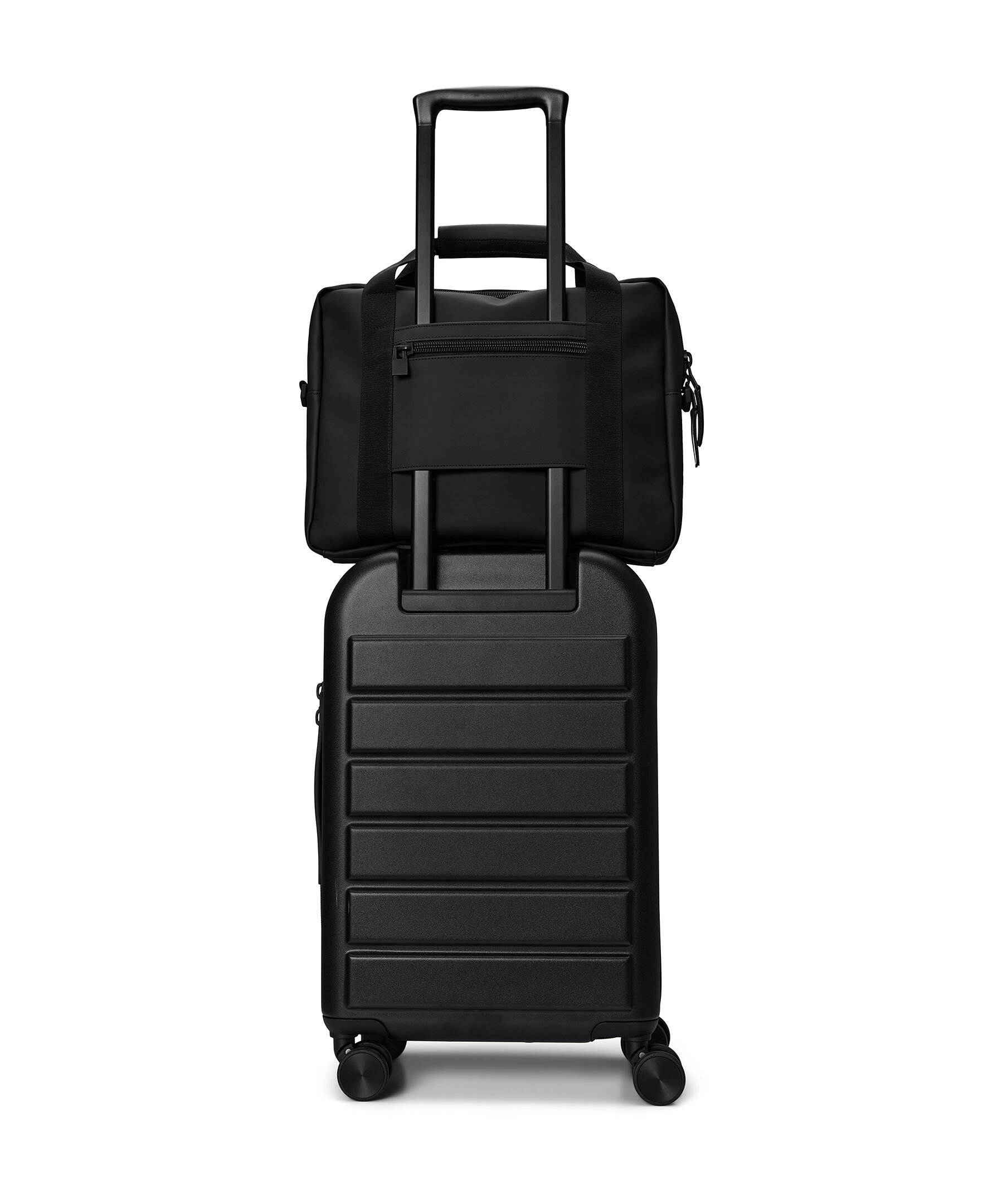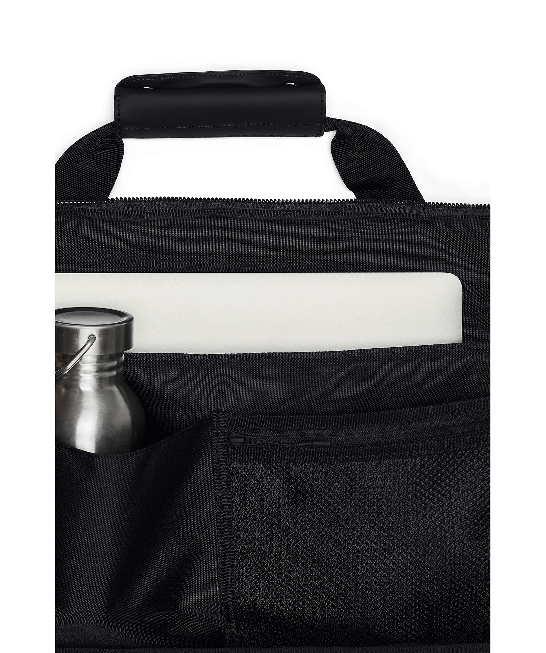 Svart vattentät väska från Rains. Vävda bärhandtag och en löstagbar axelrem. Huvudfacket stängs med dragkedja, två mindre ytterfack som stängs med dragkedja. Vagnrem med blixtlåsficka gör att väskan kan skjutas på teleskopiska handtag. Blixtlås- och meshfickor på väskans insida. Väskans mått: H 30 x B 38 x D 9 cm