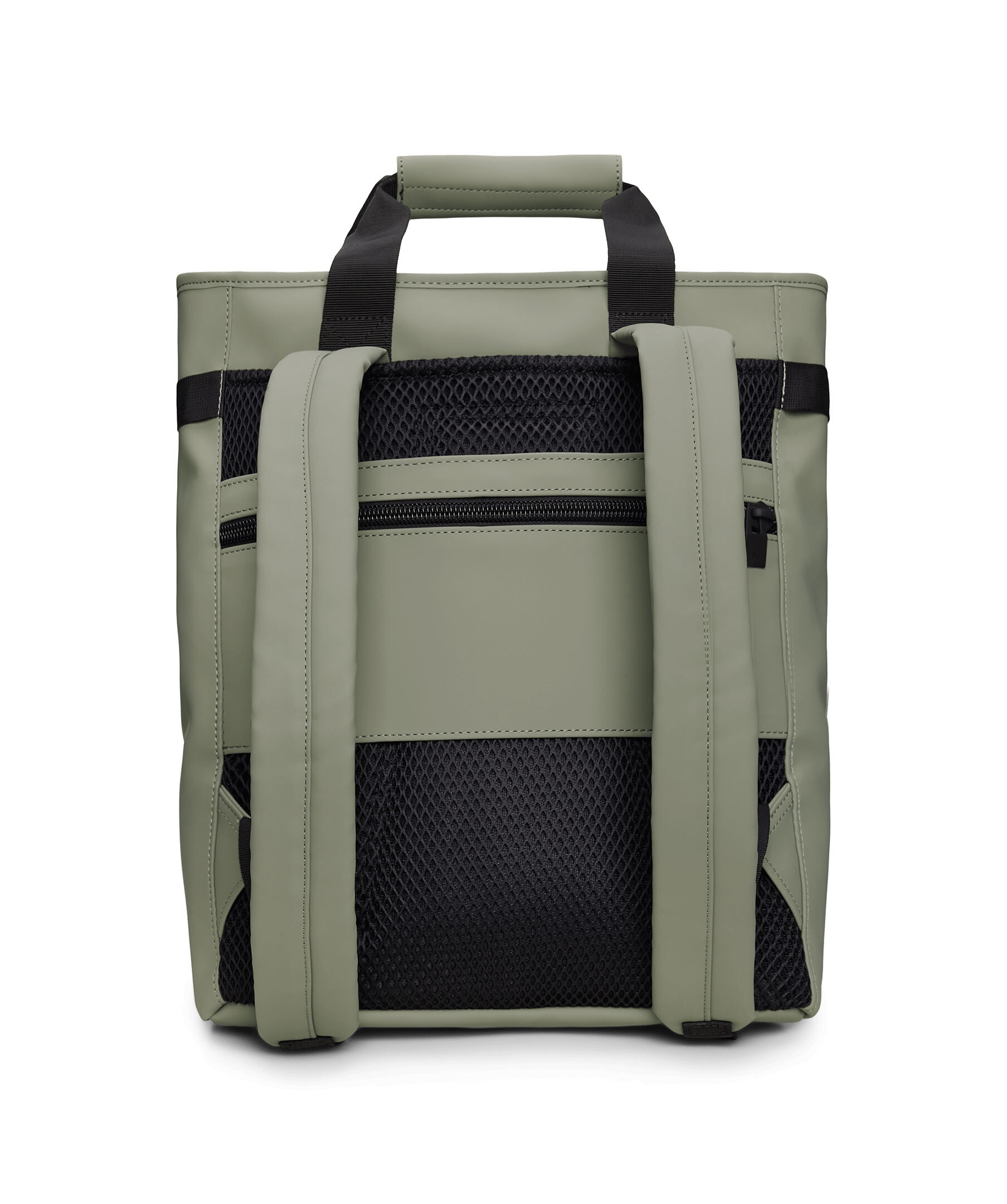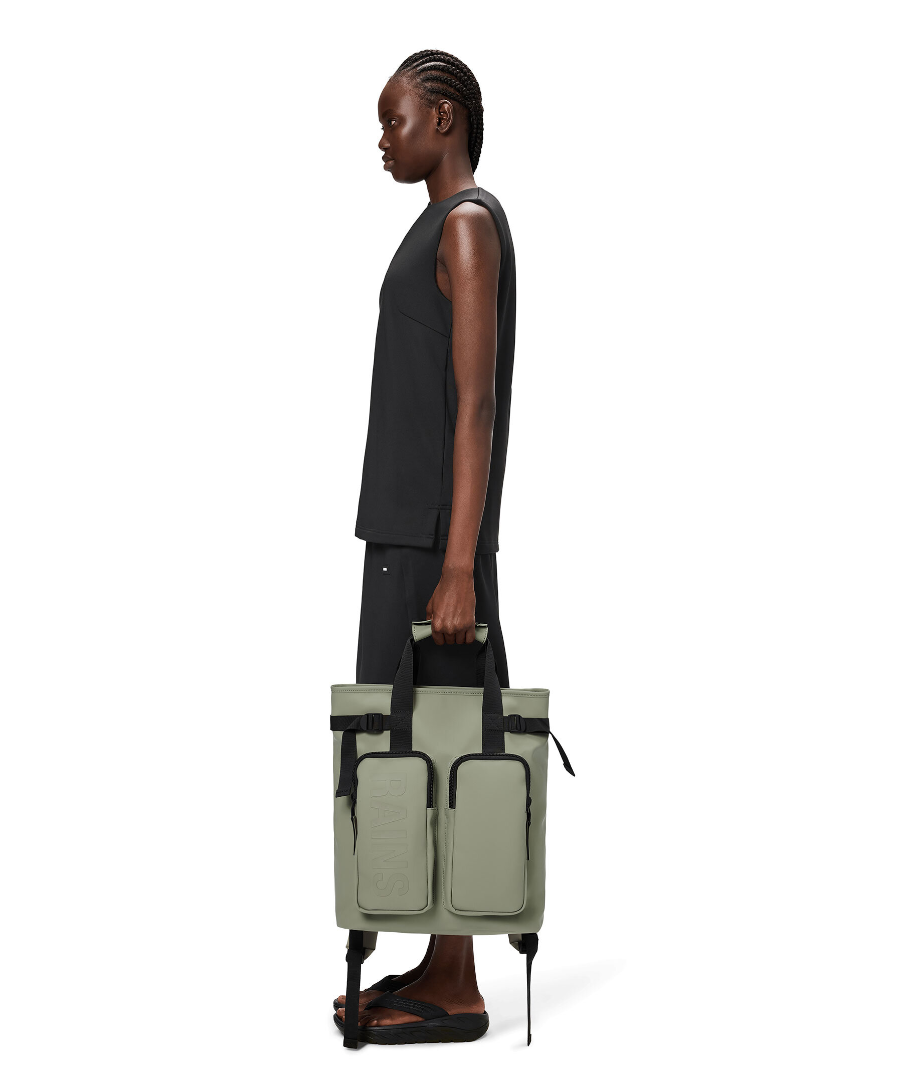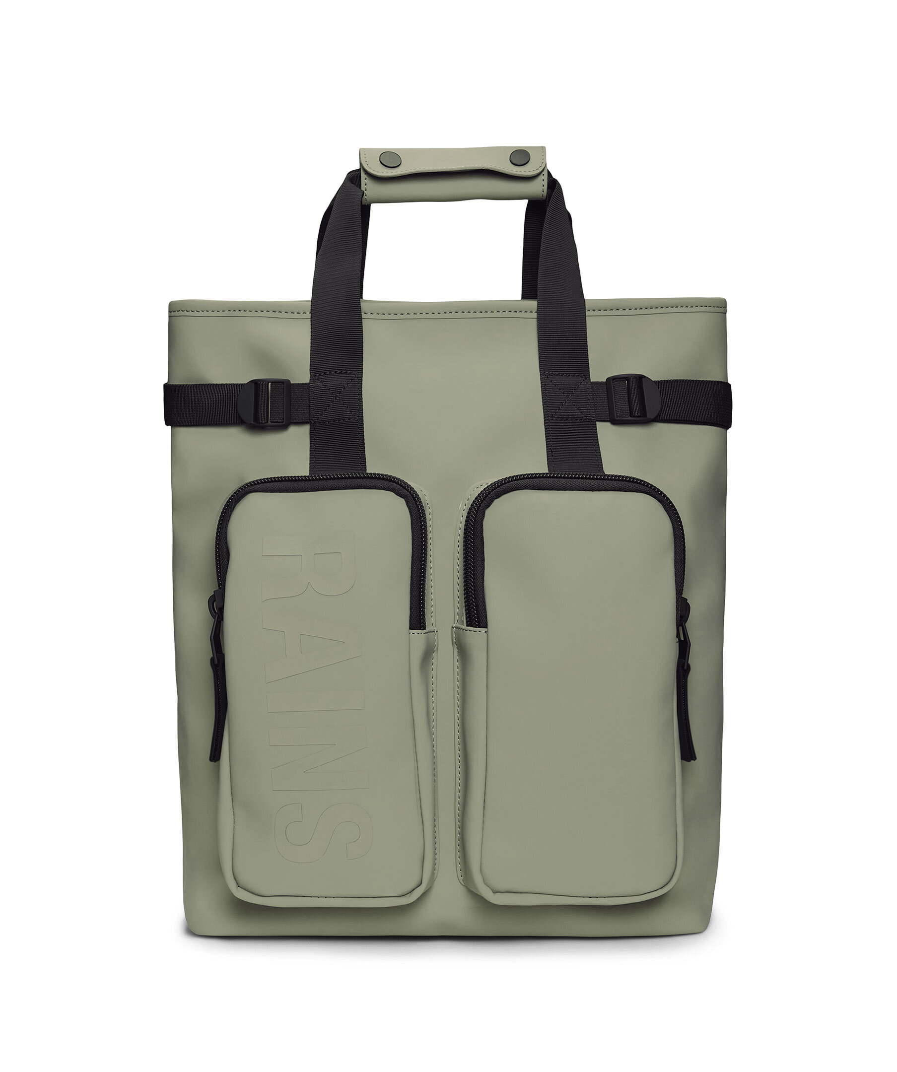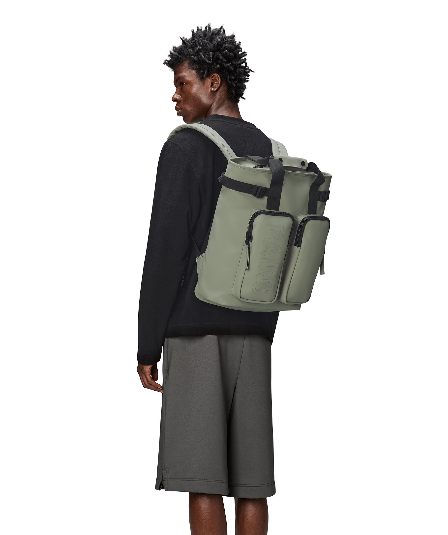 Grågrön vattentät ryggsäck från Rains. Huvudfacket stängs med dragkedja innerfickor i mesh samt ett vadderat fack för laptop. Två mindre fack framtill som stängs med dragkedja, tryckt logotyp på höger fack. Justerbara axelremmar. Justerbara remmar på väskans sida. Vävda bärhandtag. Väskans mått: H 43 cm x B 32 cm D 12.5 cm.