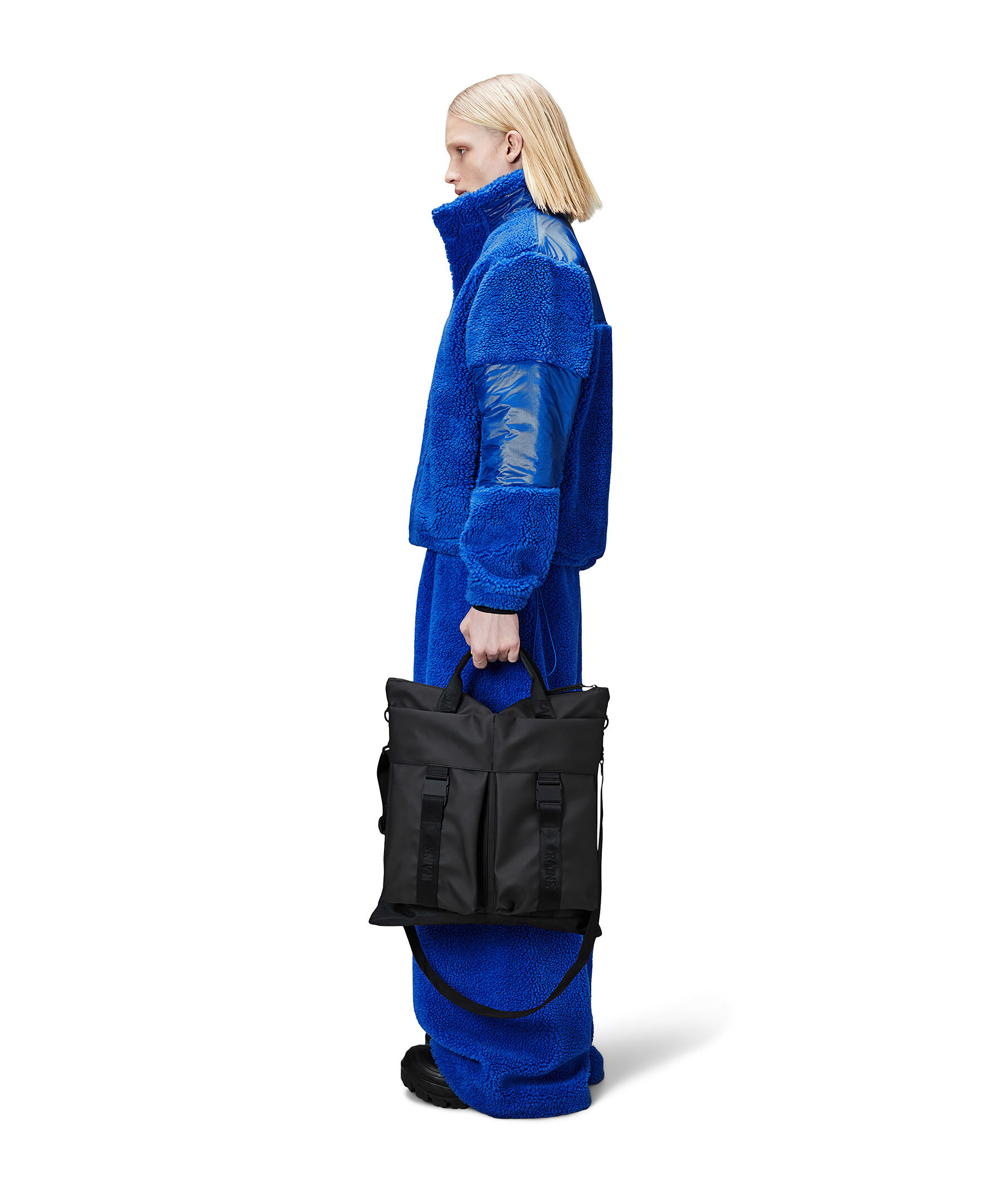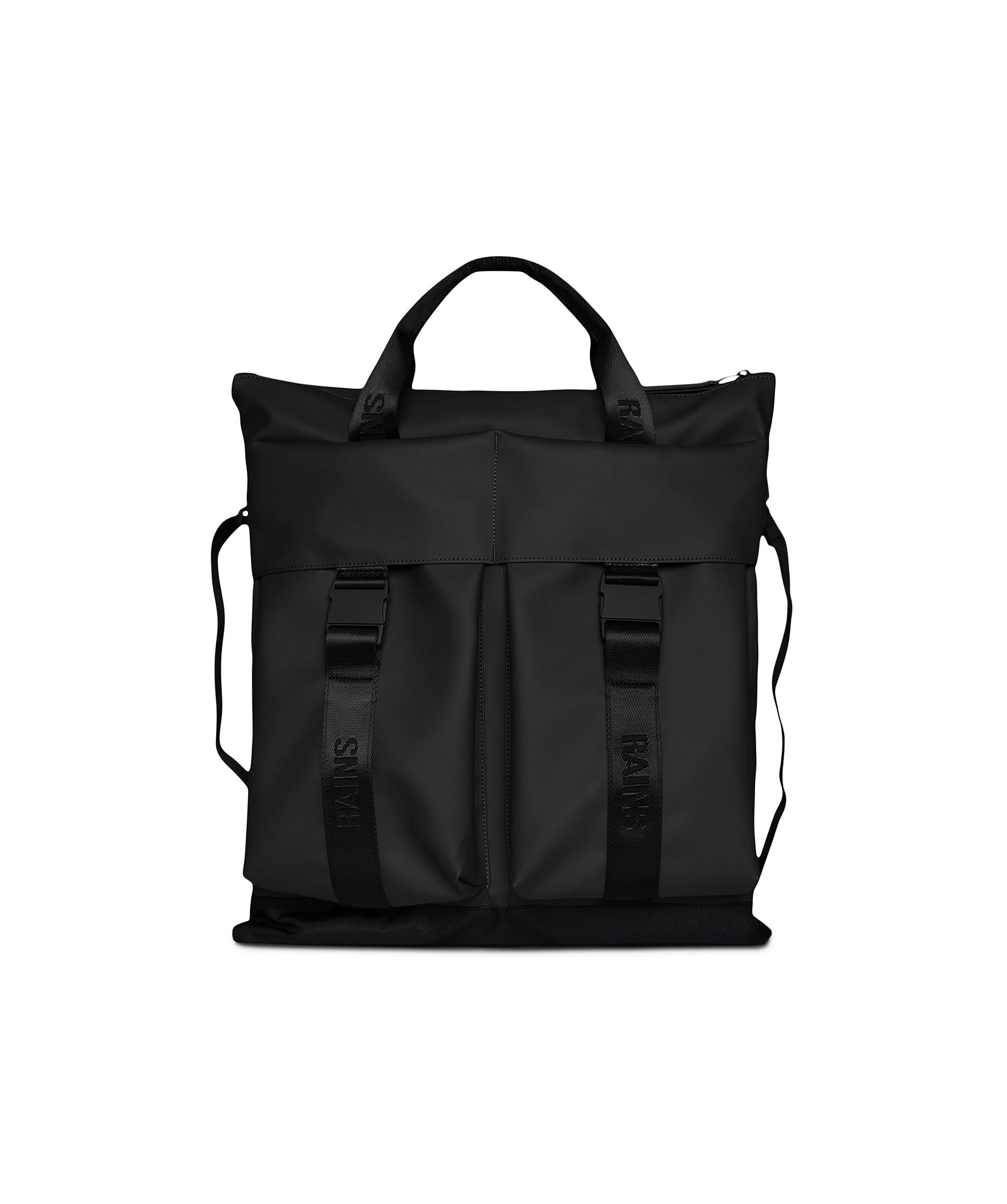 Svart trail tote bag från Rains. Trail-konceptet omtolkar modellen genom signaturspännen och vävda remmar. Den vattentäta väskans huvudfack öppnas med ett gummerat blixtlås och har en vadderad ficka för en bärbar dator och en stor blixtlåsficka. Utsidans detaljer omfattar två stora cargofickor med spännen, en vävd rem och en löstagbar axelrem. Tillverkad i Rains vattentäta PU-signaturtyg, som designats för bärkraft, hållbarhet och mjuk känsla. Mått: H 46 x B 42 x D 2,5 cm.