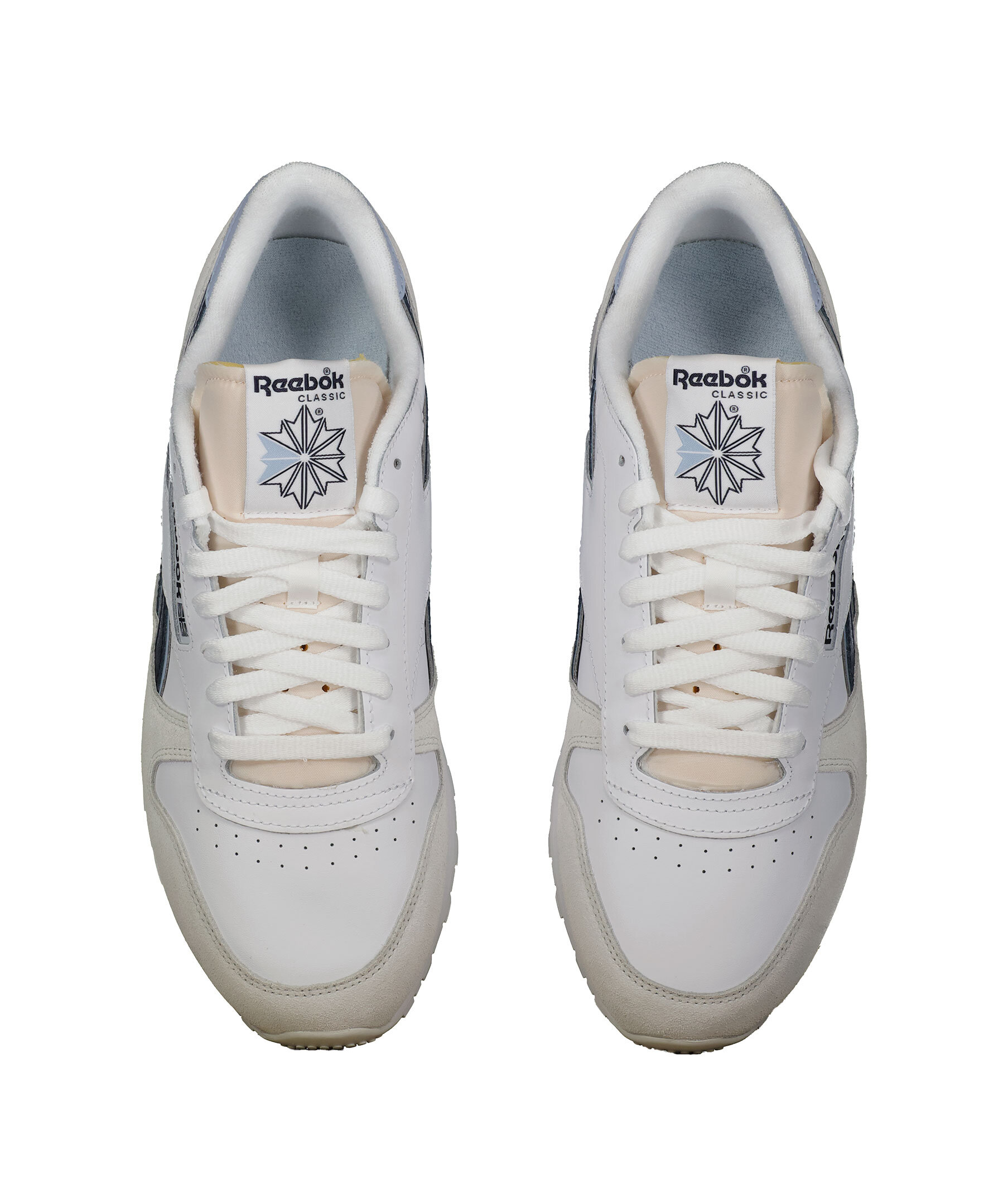 Vita sneakers i läder från Reebok med blåa detaljer. Platta skosnören. Patch på plösen med logotyp. Vävd logotyp på skons yttersida. Tryckt logotyp på hälen. Sula i gummi. Detaljer i mocka.