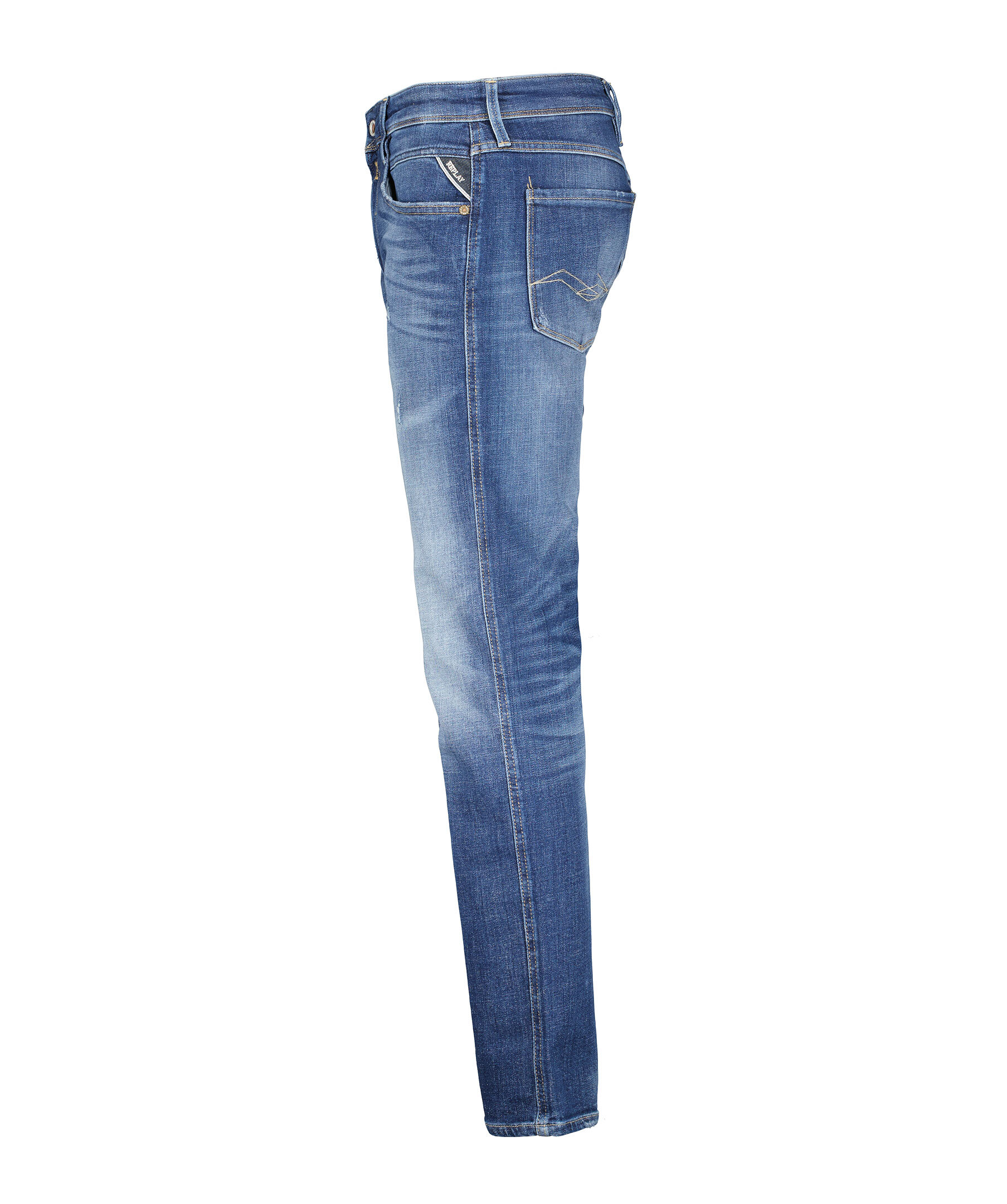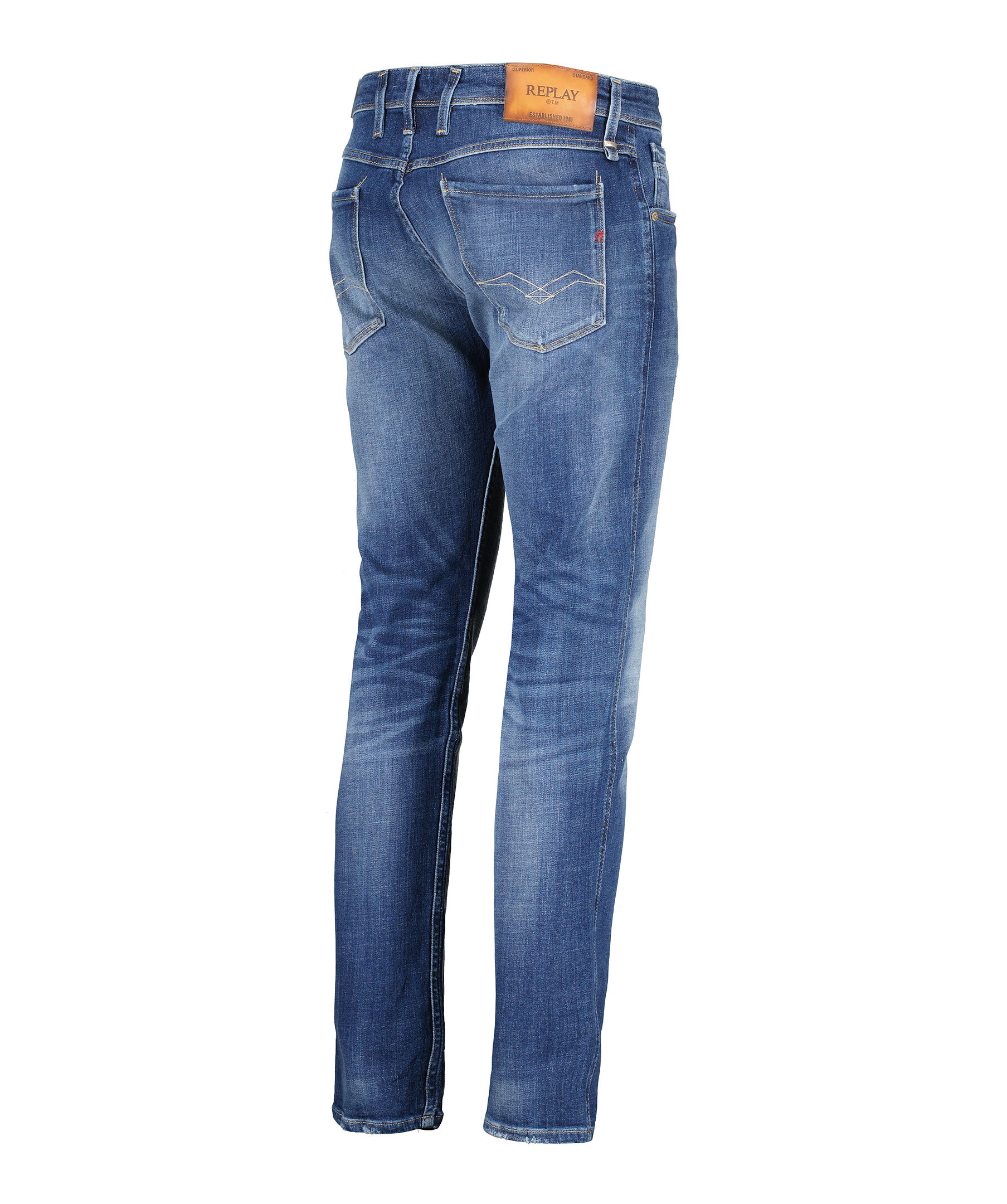 Blåa jeans från Replay. Jeansen har en normalhög midja med bälteshällor, fem fickor, triangelformad REPLAY-etikett på vänster ficka, mynt ficka och bakfickor med ikoniska replay-sömmar. Läder etikett på linningen samt litet rött broderat R på höger bakficka. Tillverkad i en bomullsblandning.