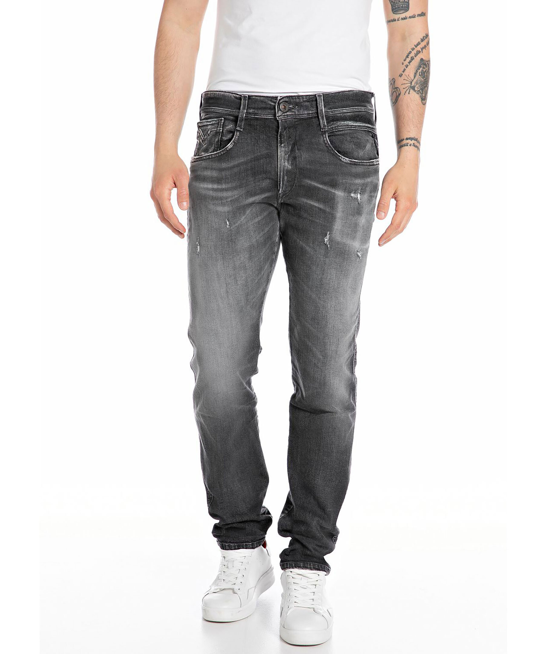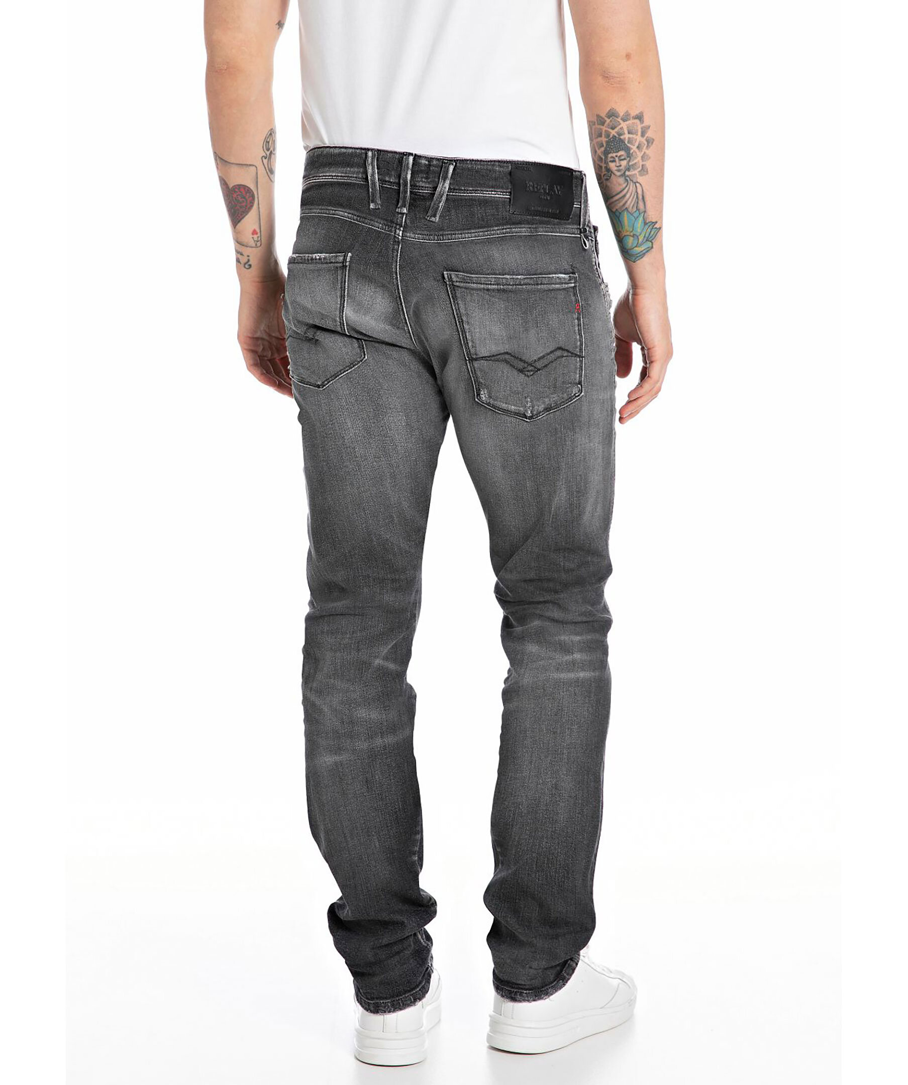 Mörkgråa jeans från Replay. Jeansen har en normalhög midja med bälteshällor, fem fickor, triangelformad REPLAY-etikett på vänster ficka, mynt ficka och bakfickor med ikoniska replay-sömmar. Läder etikett på linningen samt litet broderat R på höger bakficka. Tillverkad i en stretchig bomullsblandning.