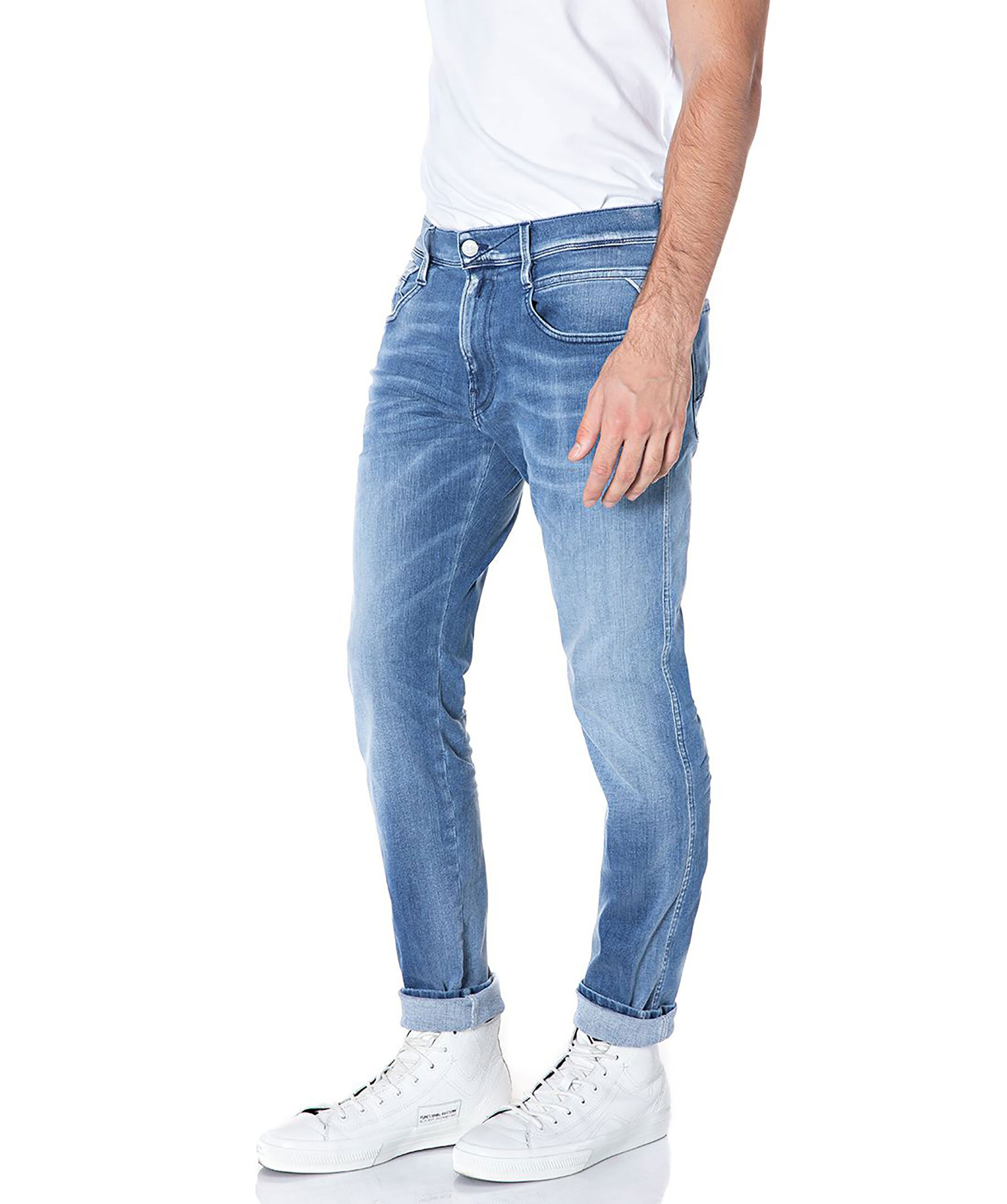 Ljusblå jeans från Replay i slim fit modell och normalhög midja. Stängs med knapp och dragkedja i gylfen och har hällor för bälte i midjan. Femficksmodell och har en sliten look