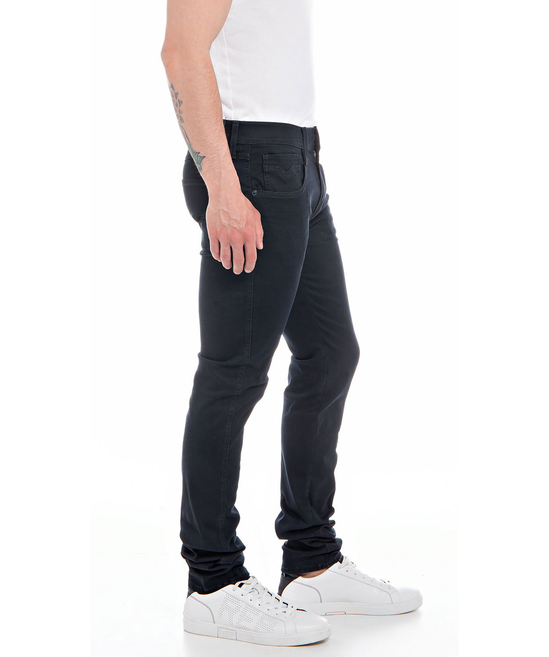 Svartblåa slim fit jeans i hyperflex modell från Replay. Jeansen är lite stora i storlek, vi rekommenderar att gå ner en storlek för bäst passform. Power stretch denim med fyrvägsstretch i bomullsblandning med en mörk tvätt. Vanlig midja och något avsmalnande ben, fem fickor, triangelformad REPLAY-etikett på vänster ficka, myntficka och bakfickor med ikoniska replay-sömmar. R-formad metallbricka på höger bakficka, dragkedja och knappgylf samt hällor för bälte i midjan.